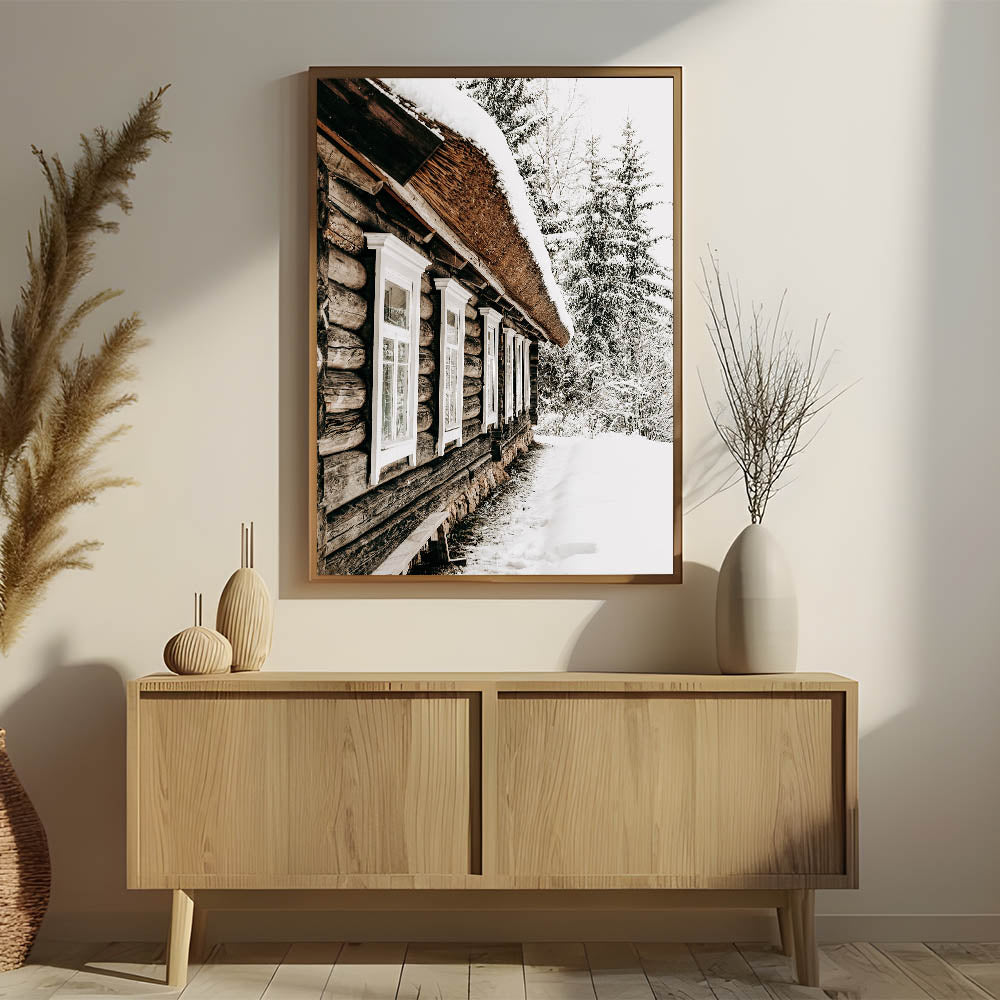 Transform your space with the serene beauty of Rustic Farmhouse Decor. This stunning wall art captures the quiet tranquility of a snowy cabin nestled in nature, offering a perfect blend of country living style and rustic charm. The detailed wooden cabin against the snow-covered landscape evokes feelings of warmth and nostalgia, making it a timeless piece for any room in your home.