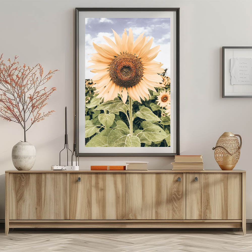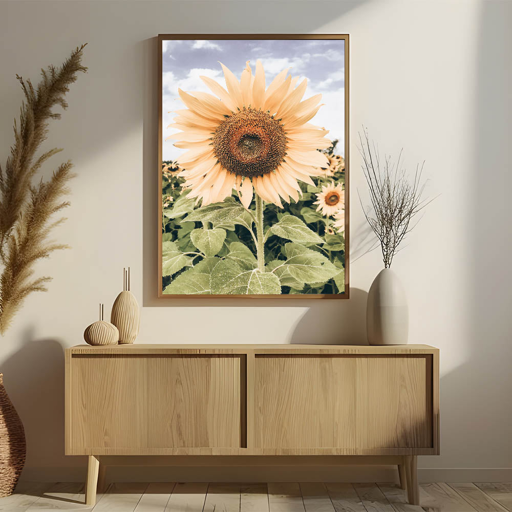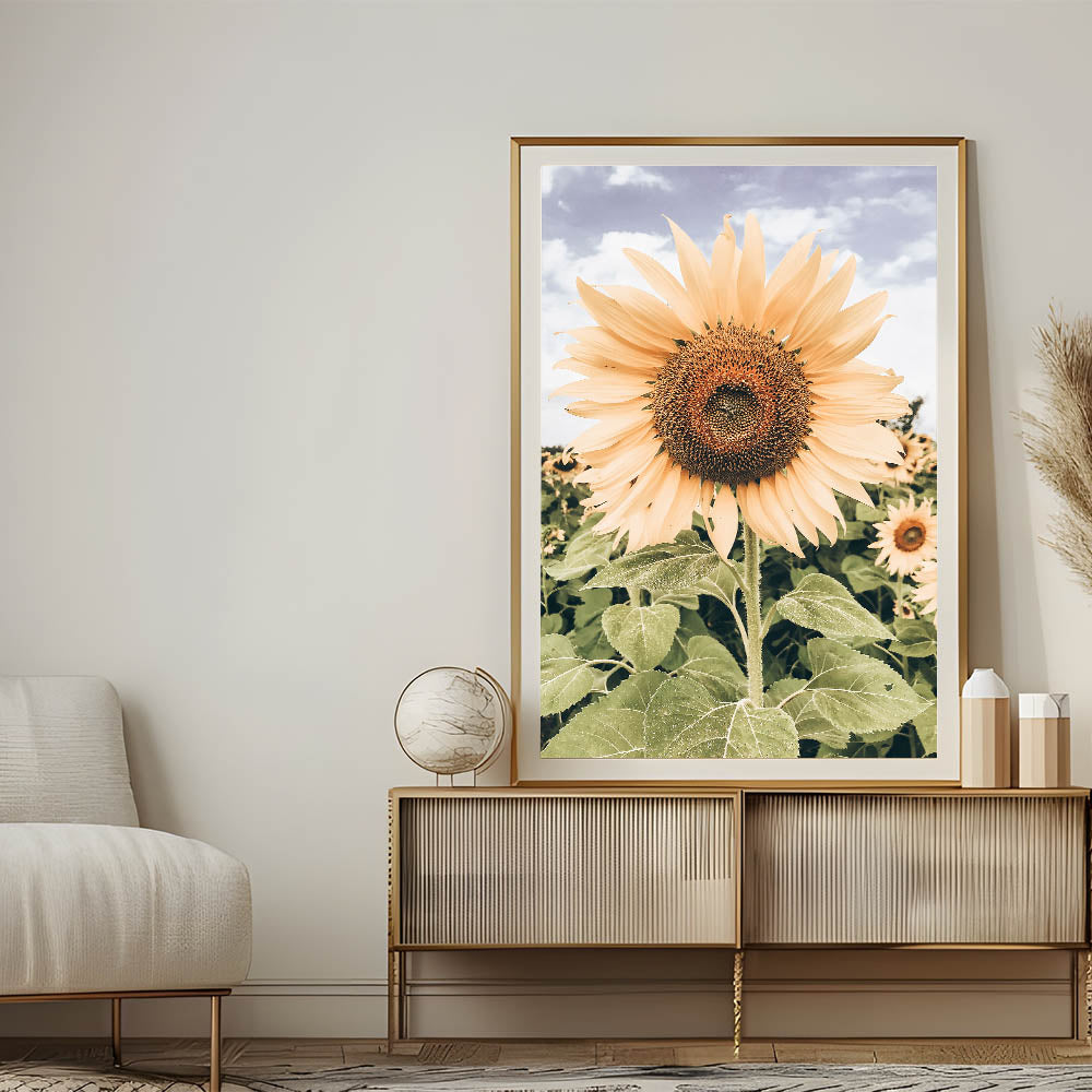 Add a touch of rustic charm to your home with this beautiful sunflower wall art. Featuring a serene sunflower basking under a soft sky, this artwork evokes the peaceful simplicity of country living. Its soft tones make it an ideal piece for any farmhouse-style decor, bringing both warmth and a connection to nature.