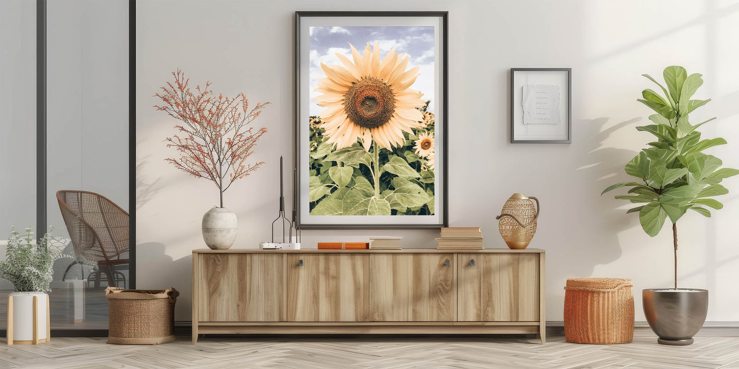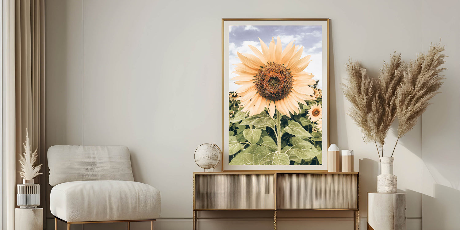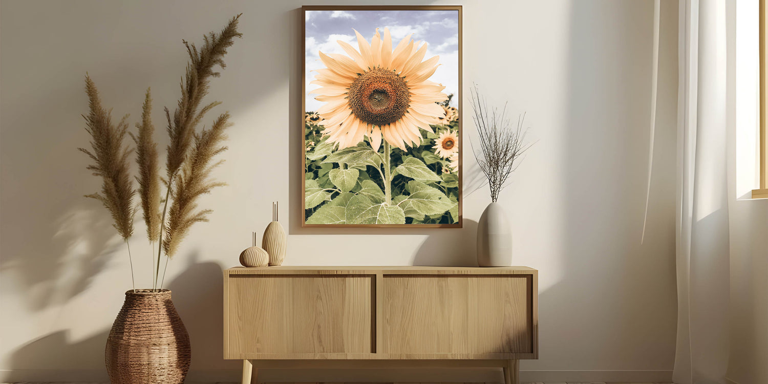 Add a touch of rustic charm to your home with this beautiful sunflower wall art. Featuring a serene sunflower basking under a soft sky, this artwork evokes the peaceful simplicity of country living. Its soft tones make it an ideal piece for any farmhouse-style decor, bringing both warmth and a connection to nature.