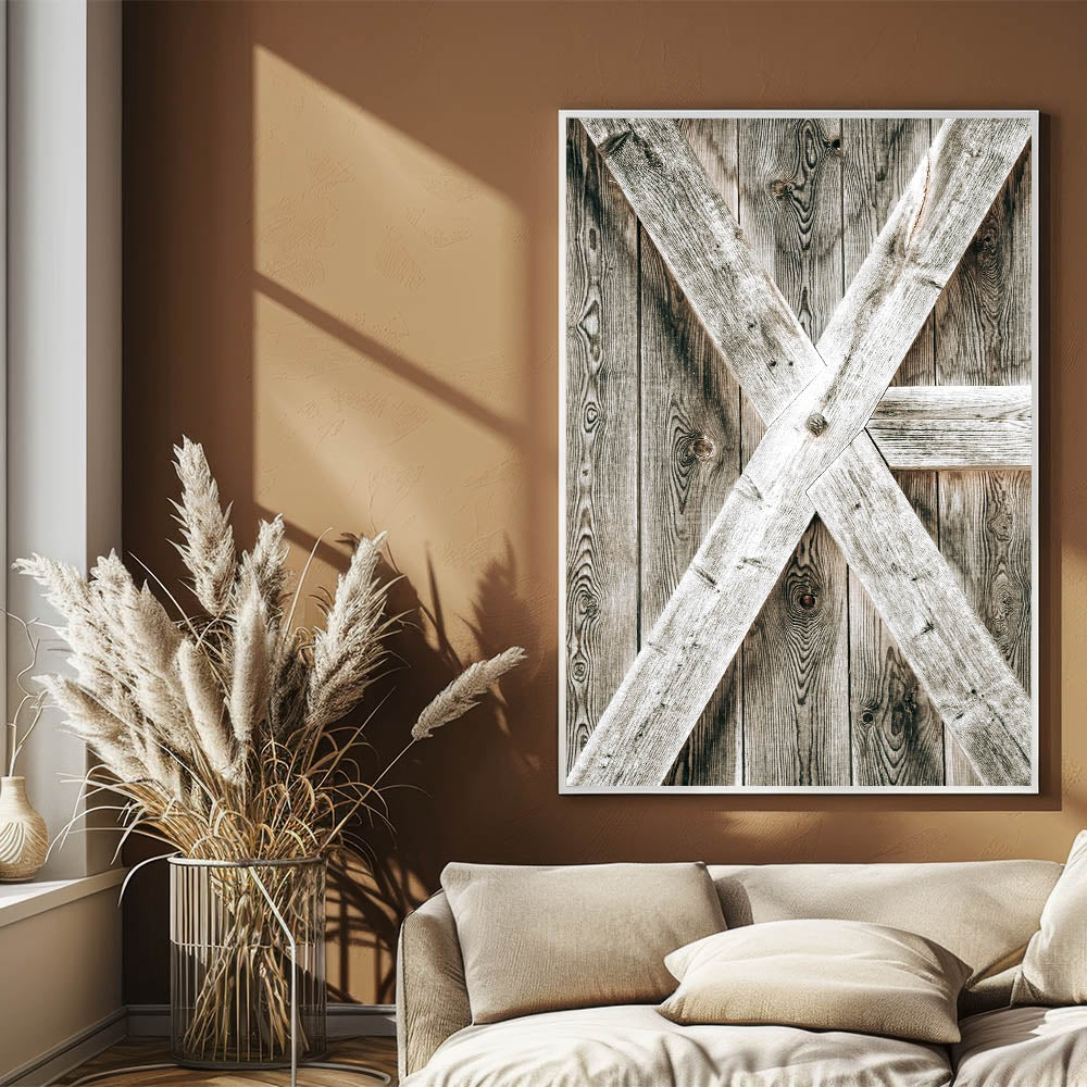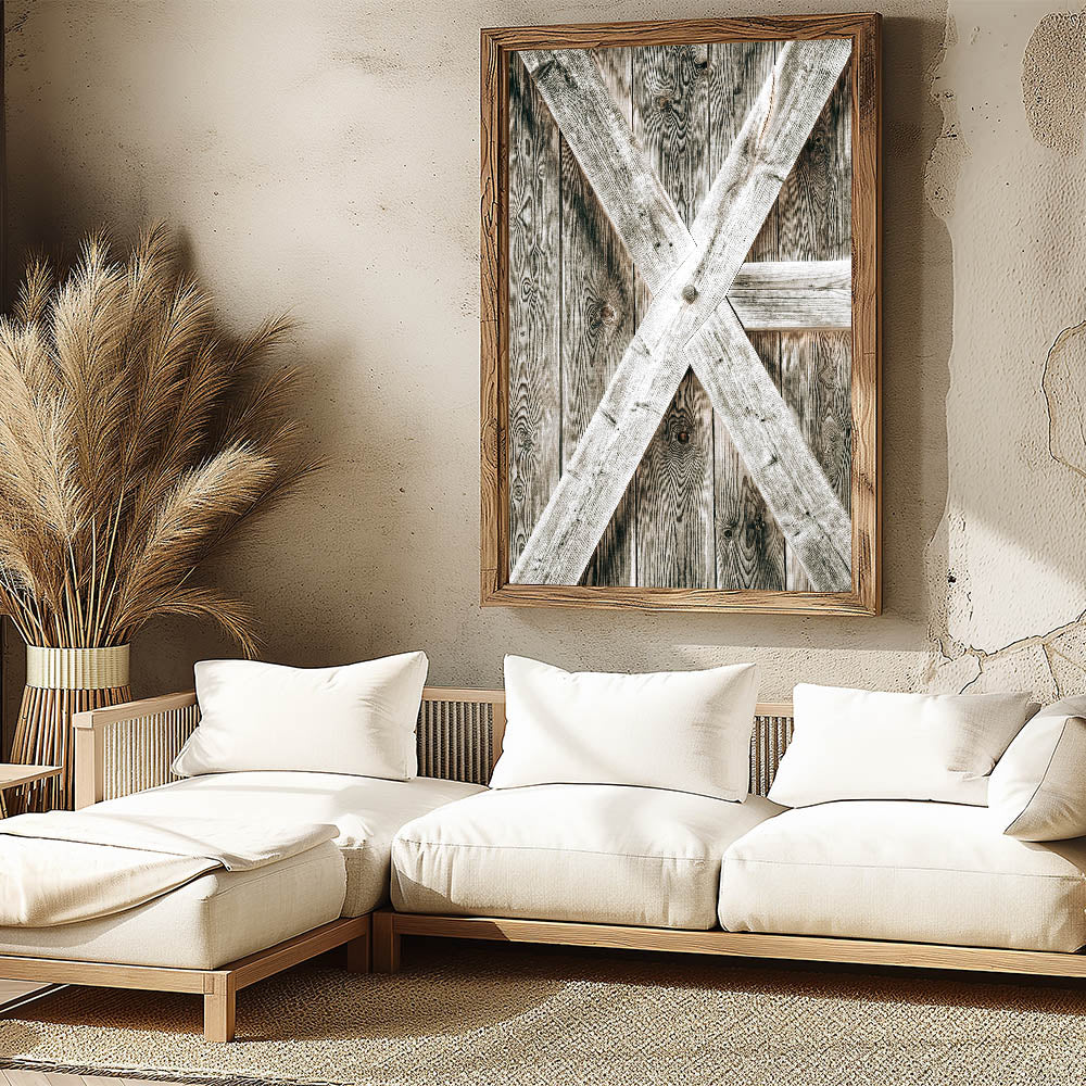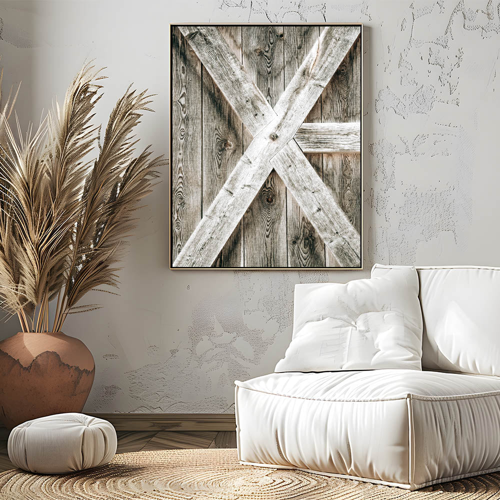 This rustic farmhouse decor wall art showcases a close-up of a classic wooden barn door with natural wood grain and cross-beam details. The weathered wood evokes the charm of country living style, perfect for bringing a touch of vintage-inspired aesthetics into your space. This piece captures the essence of antique farmhouse aesthetic, making it a beautiful addition to any room with a rustic charm theme.