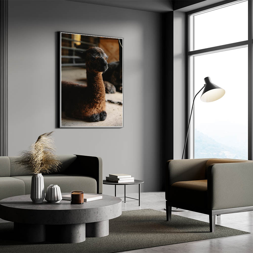 Capture the charm of farm life with this rustic wall art featuring an adorable alpaca resting comfortably in a cozy barn. The warm tones and textured fur of the alpaca provide a perfect focal point for those seeking farmhouse-style art prints. This heartwarming image will add a welcoming, rustic touch to any room, making it ideal for those looking to bring a bit of countryside charm into their home decor.