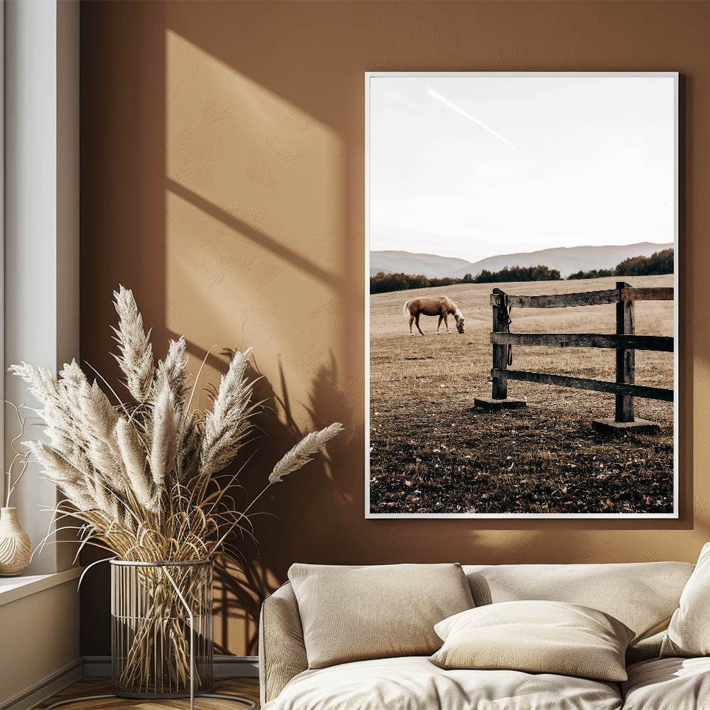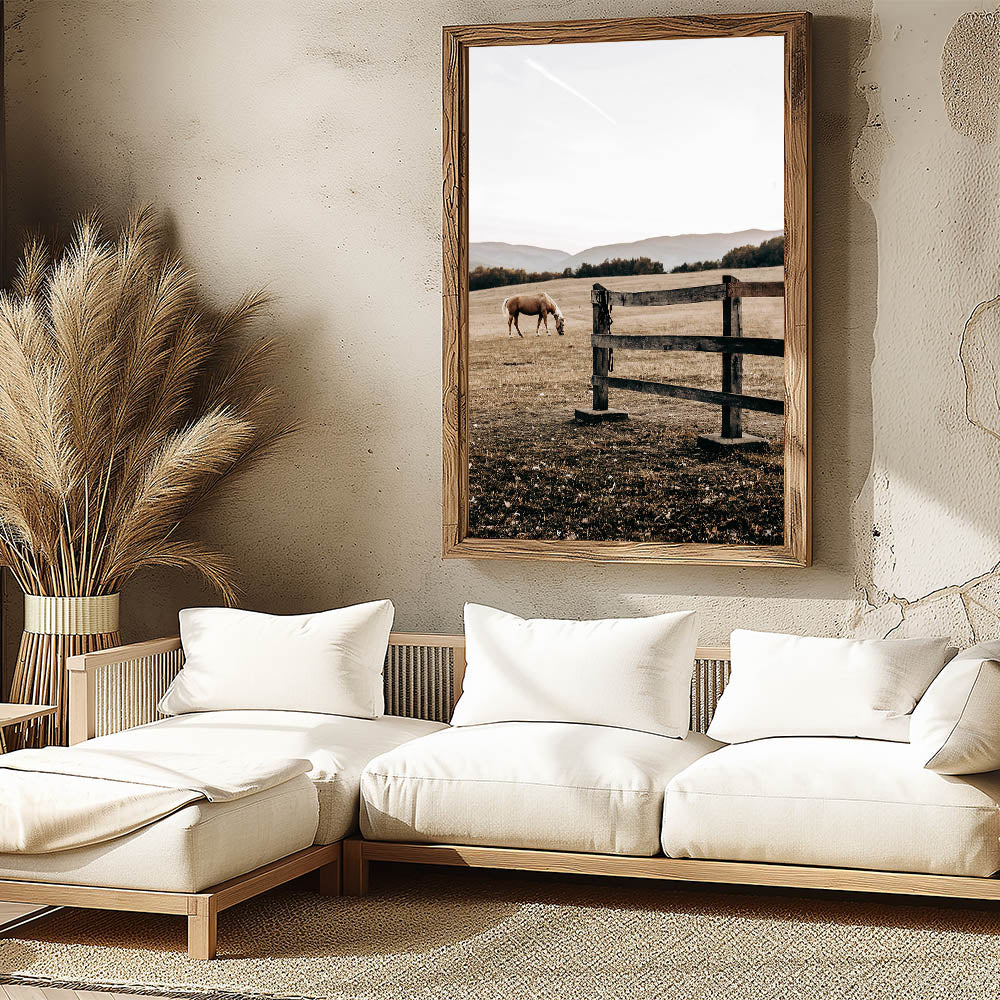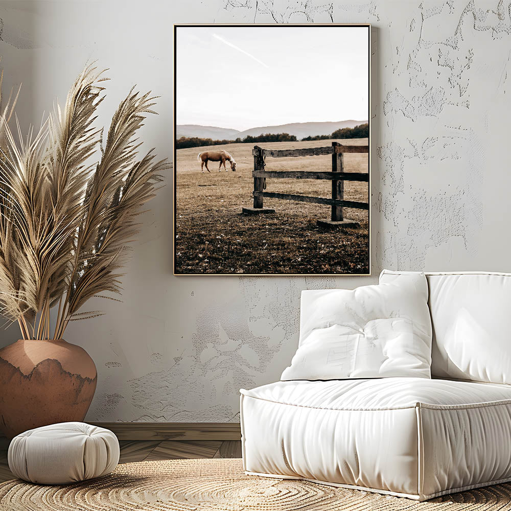 Elevate your rustic farmhouse decor with this serene piece of wall art featuring a grazing horse in a peaceful country landscape. Capturing the essence of country living, this artwork offers a soothing scene of wide-open fields and weathered wooden fencing. Perfect for those who appreciate vintage-inspired designs and the timeless appeal of rural life, this print embodies the antique farmhouse aesthetic with its muted earth tones and soft natural light.