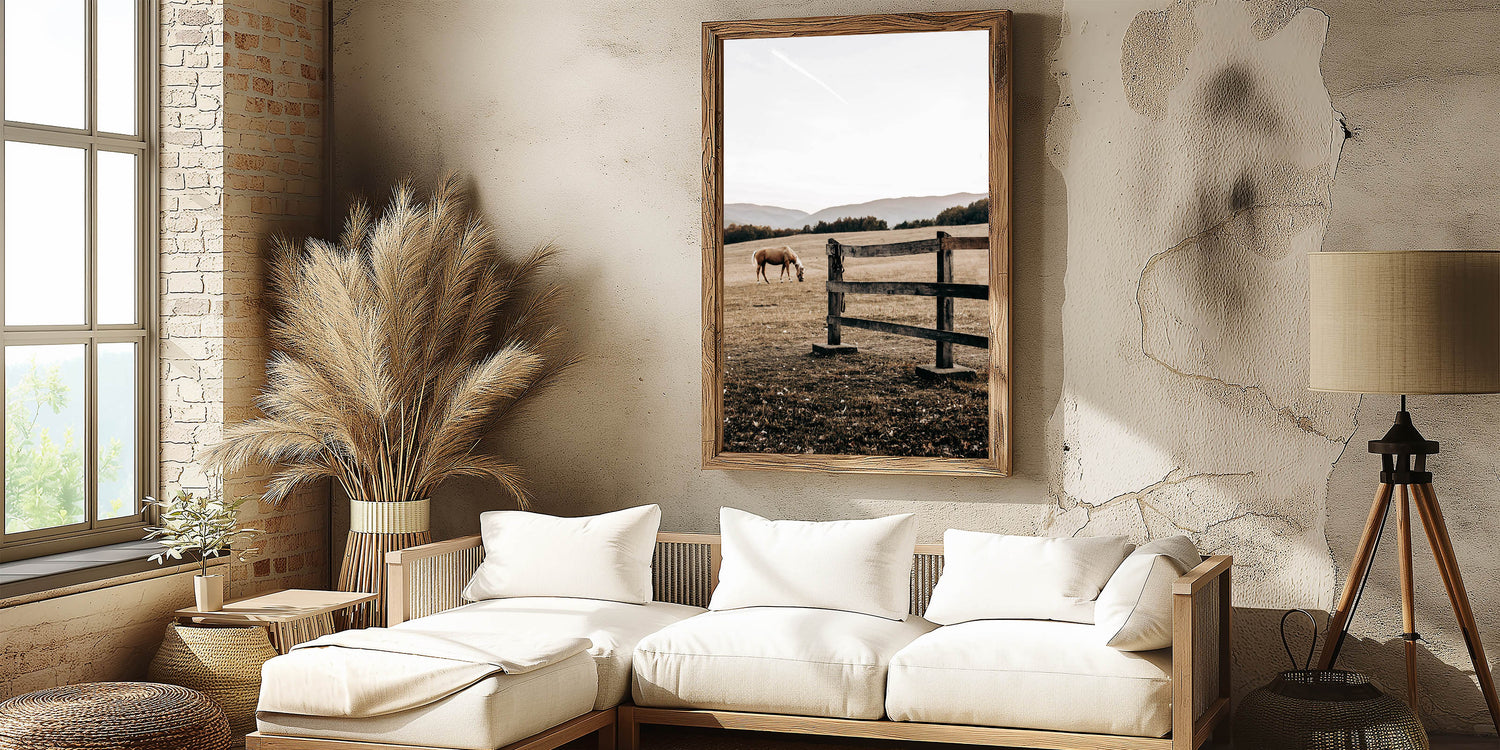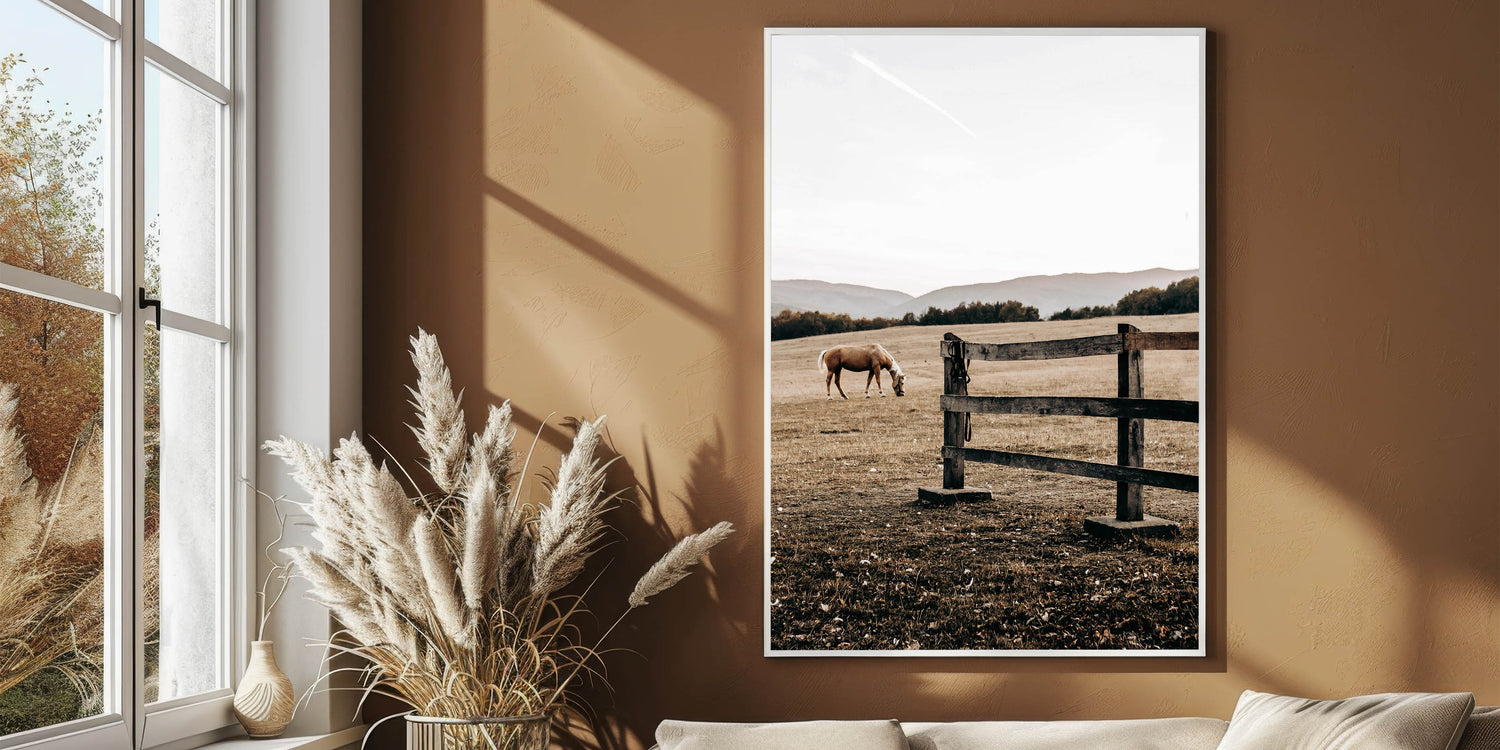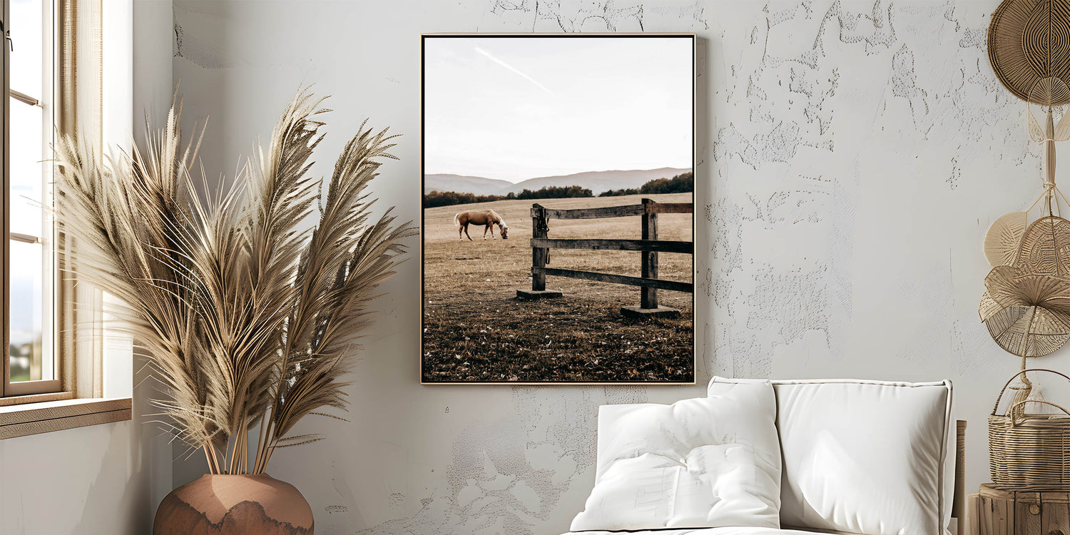 Elevate your rustic farmhouse decor with this serene piece of wall art featuring a grazing horse in a peaceful country landscape. Capturing the essence of country living, this artwork offers a soothing scene of wide-open fields and weathered wooden fencing. Perfect for those who appreciate vintage-inspired designs and the timeless appeal of rural life, this print embodies the antique farmhouse aesthetic with its muted earth tones and soft natural light.