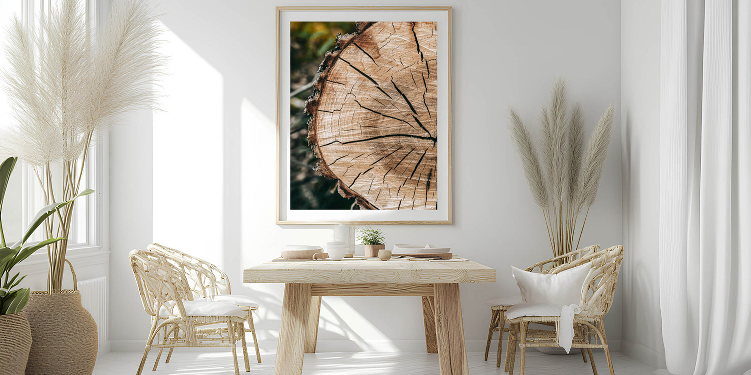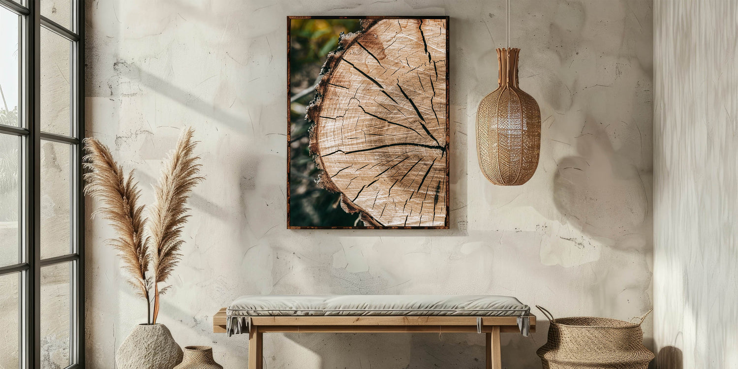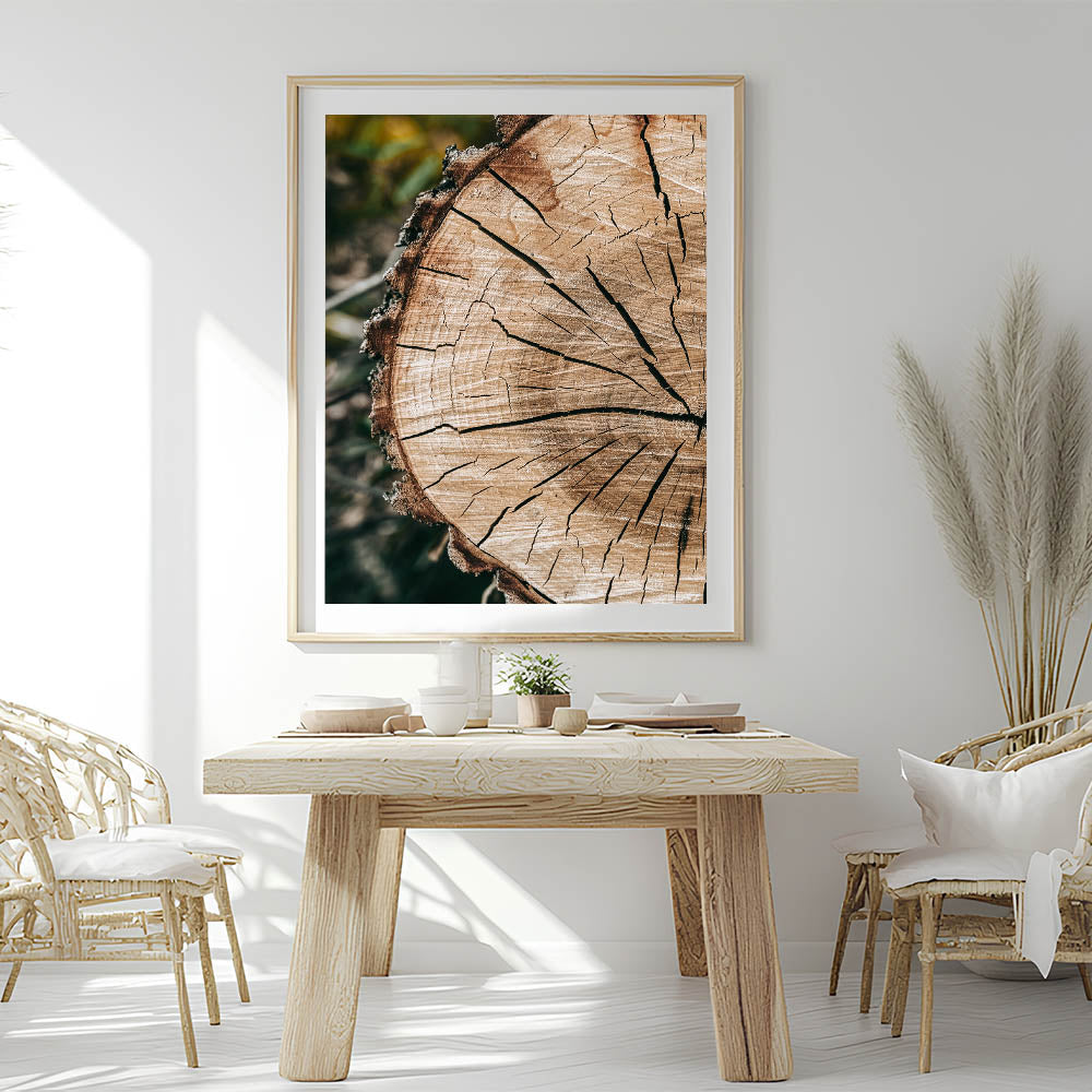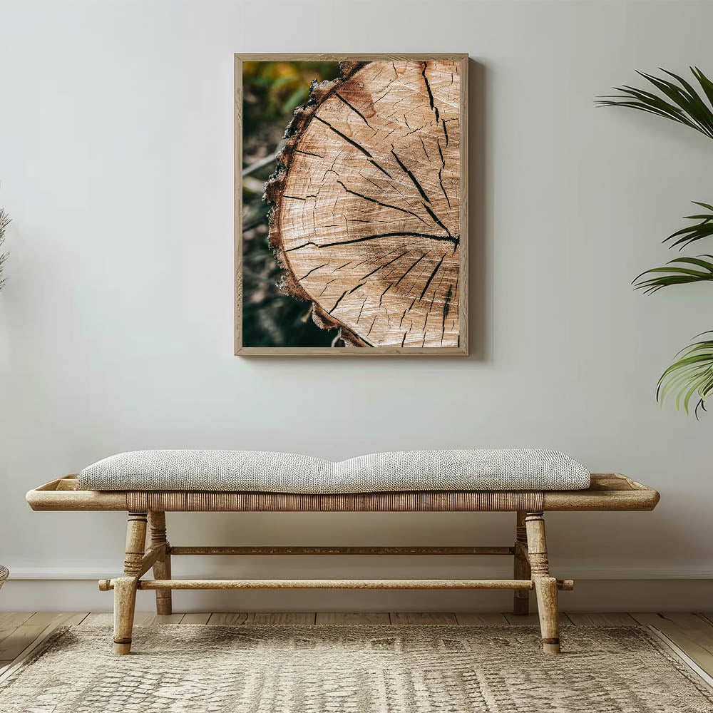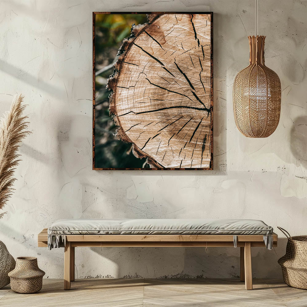 Celebrate the beauty of nature with this Rustic Farmhouse Wall Art, showcasing a detailed close-up of a tree cross-section. The intricate wood grain and natural cracks in the wood create a stunning visual that brings the outdoors inside. This artwork is perfect for adding a touch of country living style to your home, offering a timeless, vintage-inspired aesthetic that will complement any farmhouse or rustic decor.