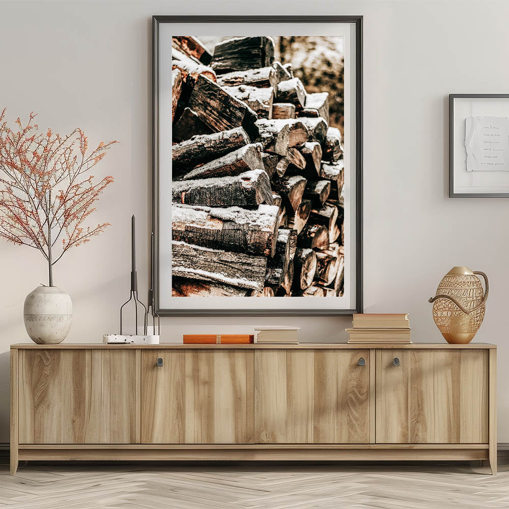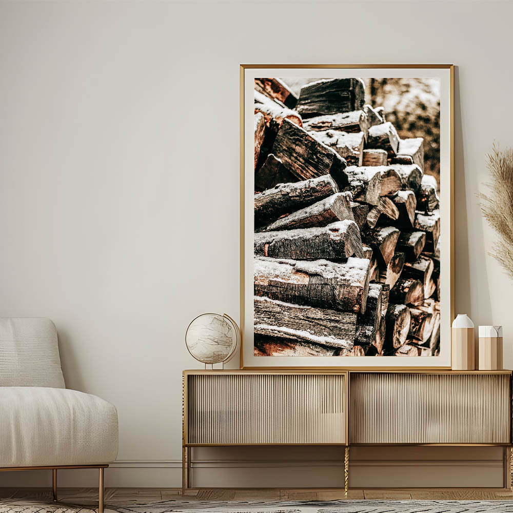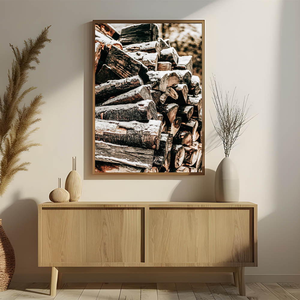 This artwork captures the rustic charm of the countryside and adds a sense of warmth and simplicity to your space. Whether you're enhancing a farmhouse-themed room or simply looking to add a touch of winter beauty, this firewood art will bring rustic elegance to any home.