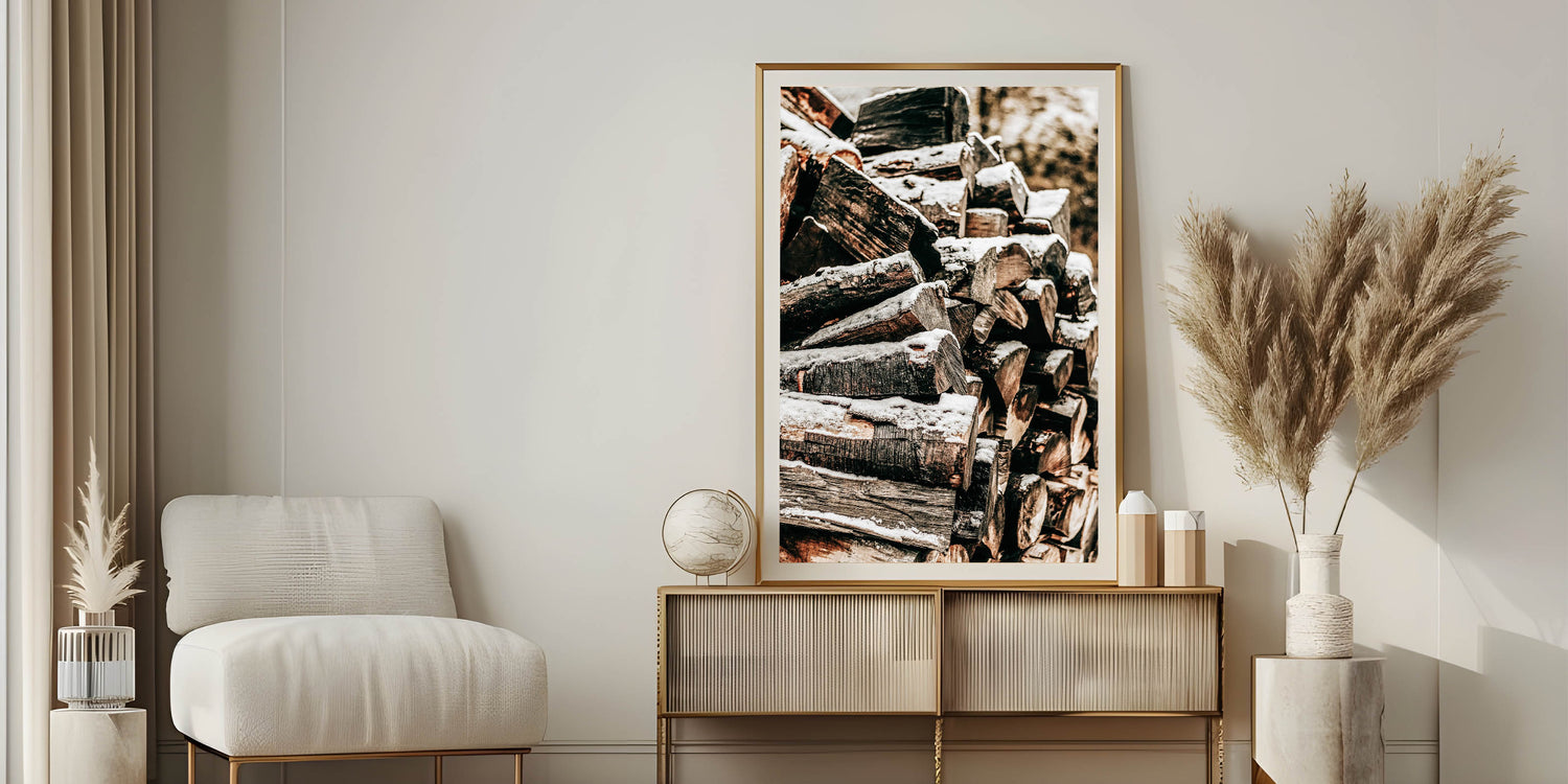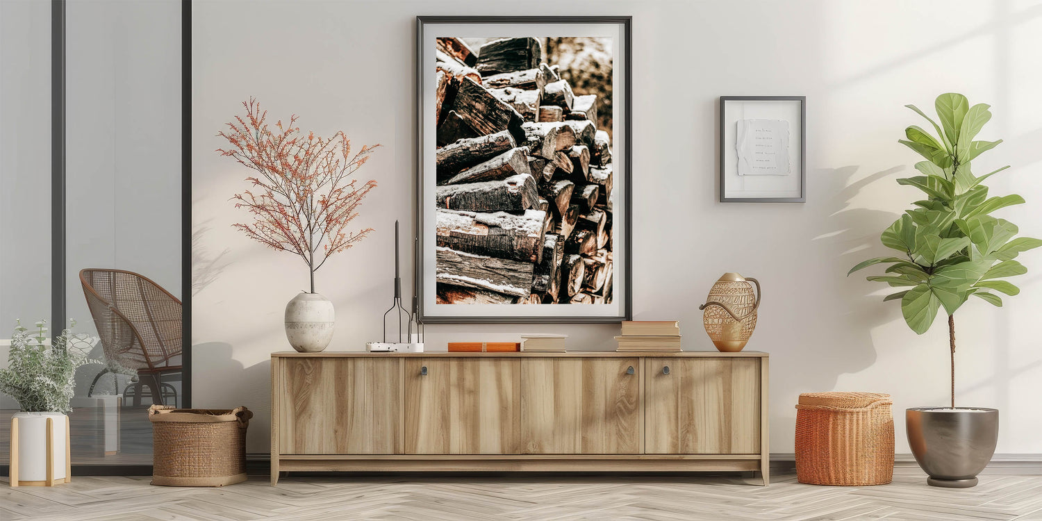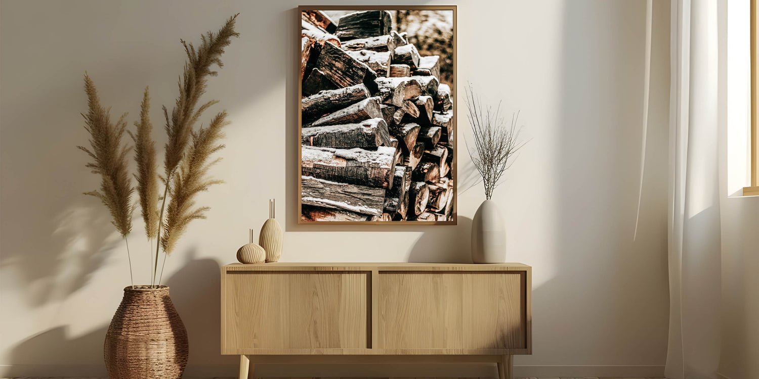 This artwork captures the rustic charm of the countryside and adds a sense of warmth and simplicity to your space. Whether you're enhancing a farmhouse-themed room or simply looking to add a touch of winter beauty, this firewood art will bring rustic elegance to any home.