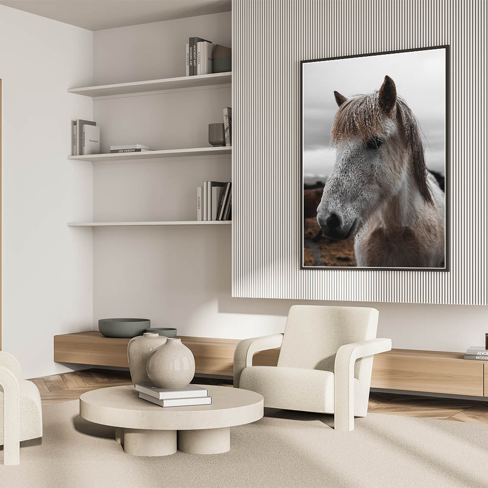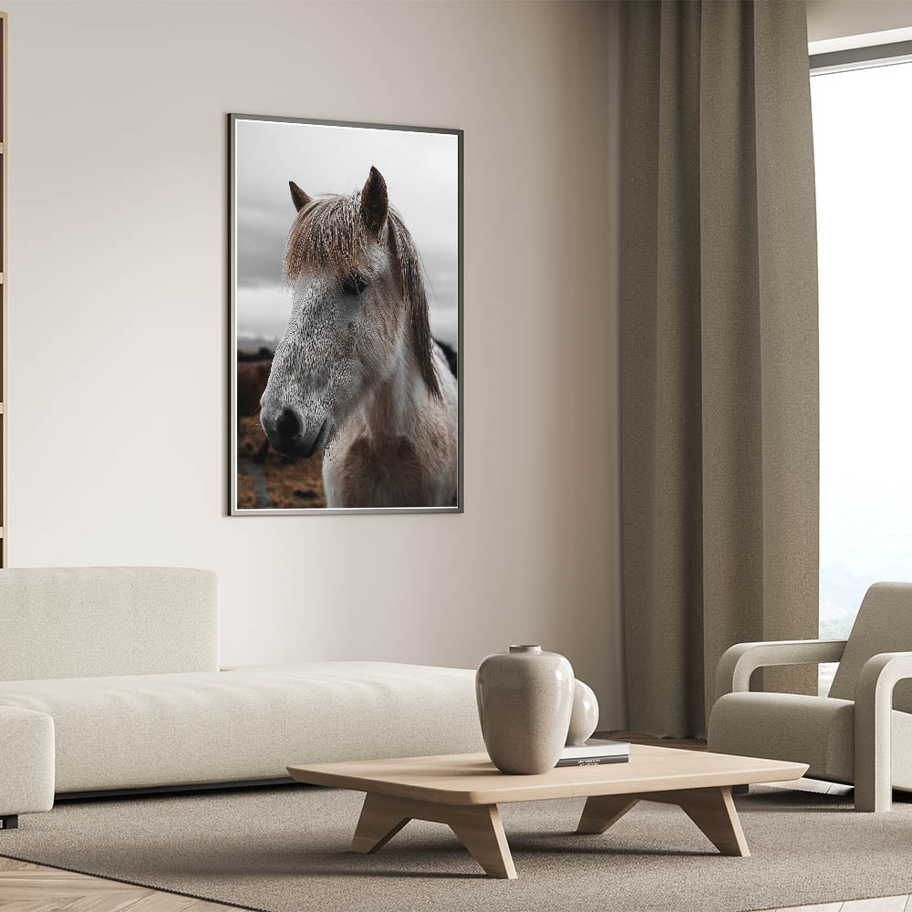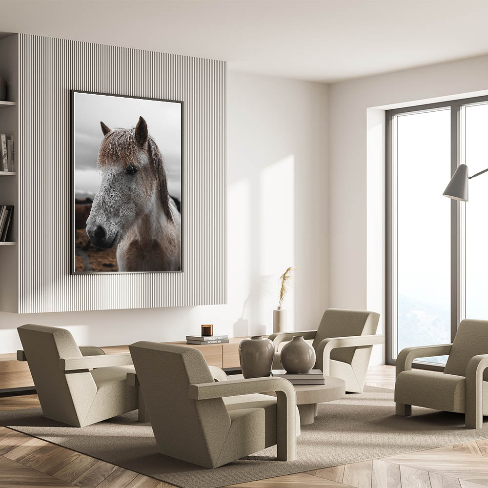This stunning horse portrait wall art captures the quiet beauty and strength of this majestic animal. The natural textures and neutral tones of the horse's coat, combined with the soft overcast sky, make this artwork a perfect addition to any rustic or farmhouse-style decor. Ideal for animal lovers and nature enthusiasts, this piece will add a calming and organic feel to any room in your home.