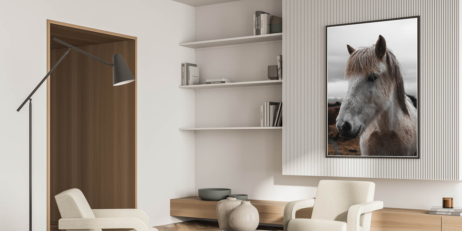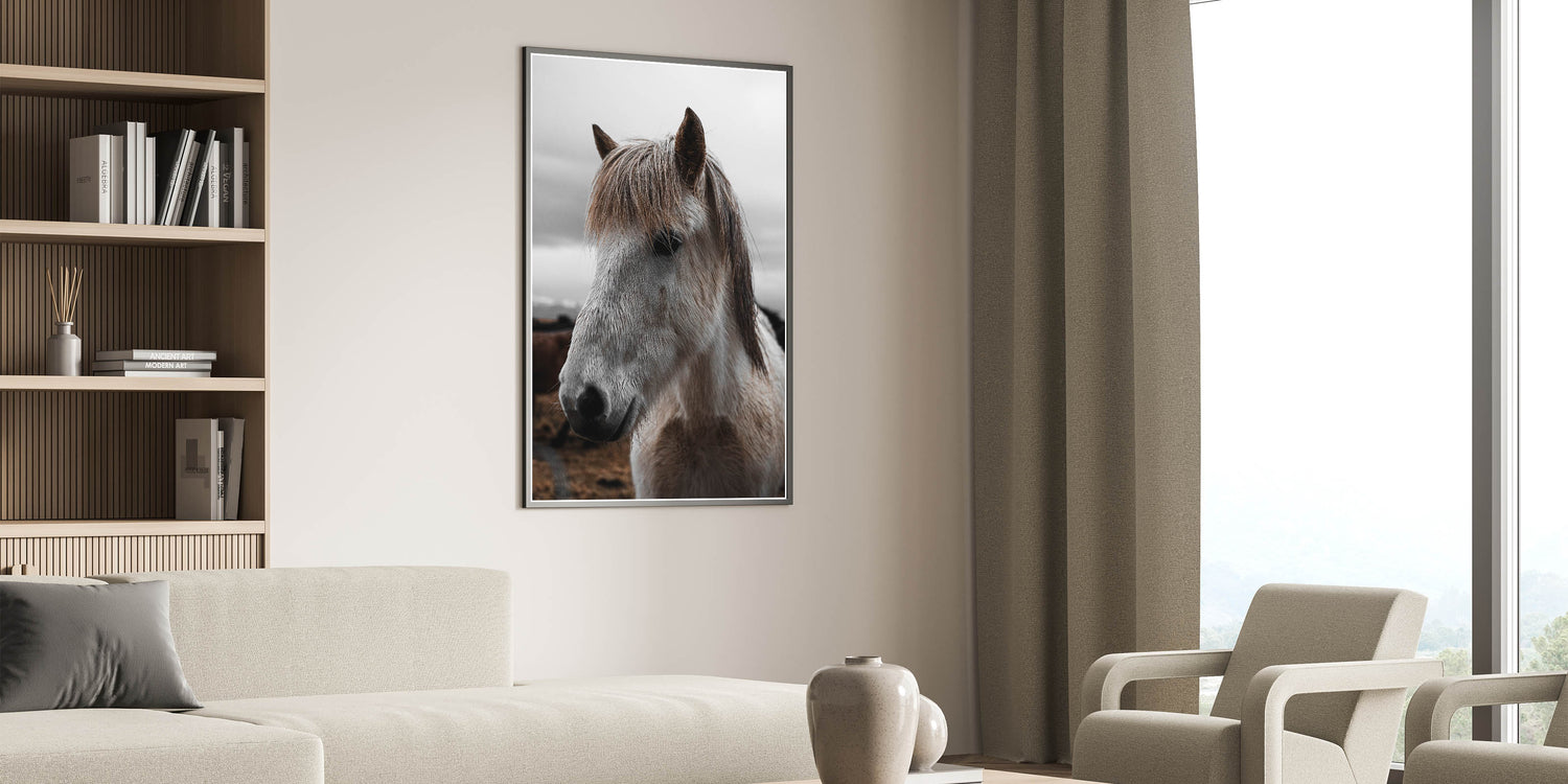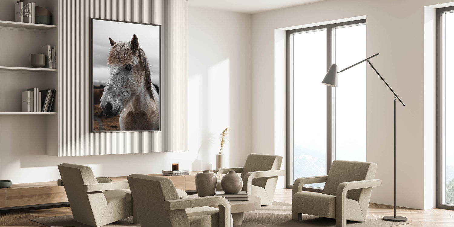 This stunning horse portrait wall art captures the quiet beauty and strength of this majestic animal. The natural textures and neutral tones of the horse's coat, combined with the soft overcast sky, make this artwork a perfect addition to any rustic or farmhouse-style decor. Ideal for animal lovers and nature enthusiasts, this piece will add a calming and organic feel to any room in your home.