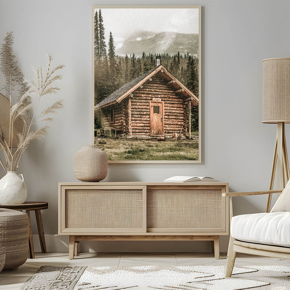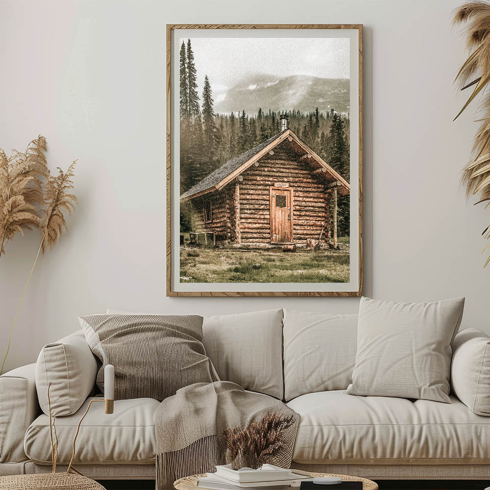 This stunning farmhouse wall art features a rustic log cabin nestled against a misty mountain backdrop, evoking the peaceful solitude of life in the wilderness. The natural textures of the wood cabin, combined with the surrounding towering trees and misty mountains, create a calming, vintage-inspired aesthetic. This artwork is ideal for those who love the rustic charm of country living and want to bring the beauty of nature into their home.