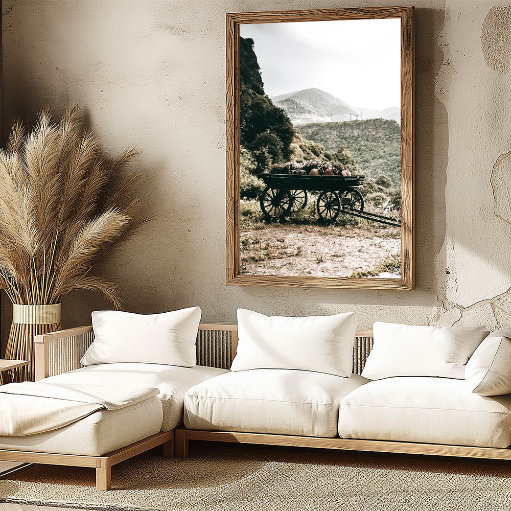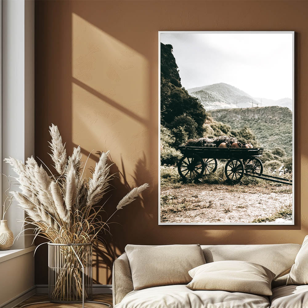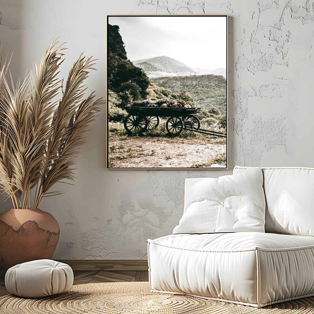 Transform your living space with this captivating rustic mountain wagon wall art. Featuring an old-fashioned wagon filled with earthen pottery, set against a peaceful mountain landscape, this piece is ideal for creating a cozy and serene atmosphere. The design perfectly captures the essence of country living, making it an excellent addition to any farmhouse-style decor.