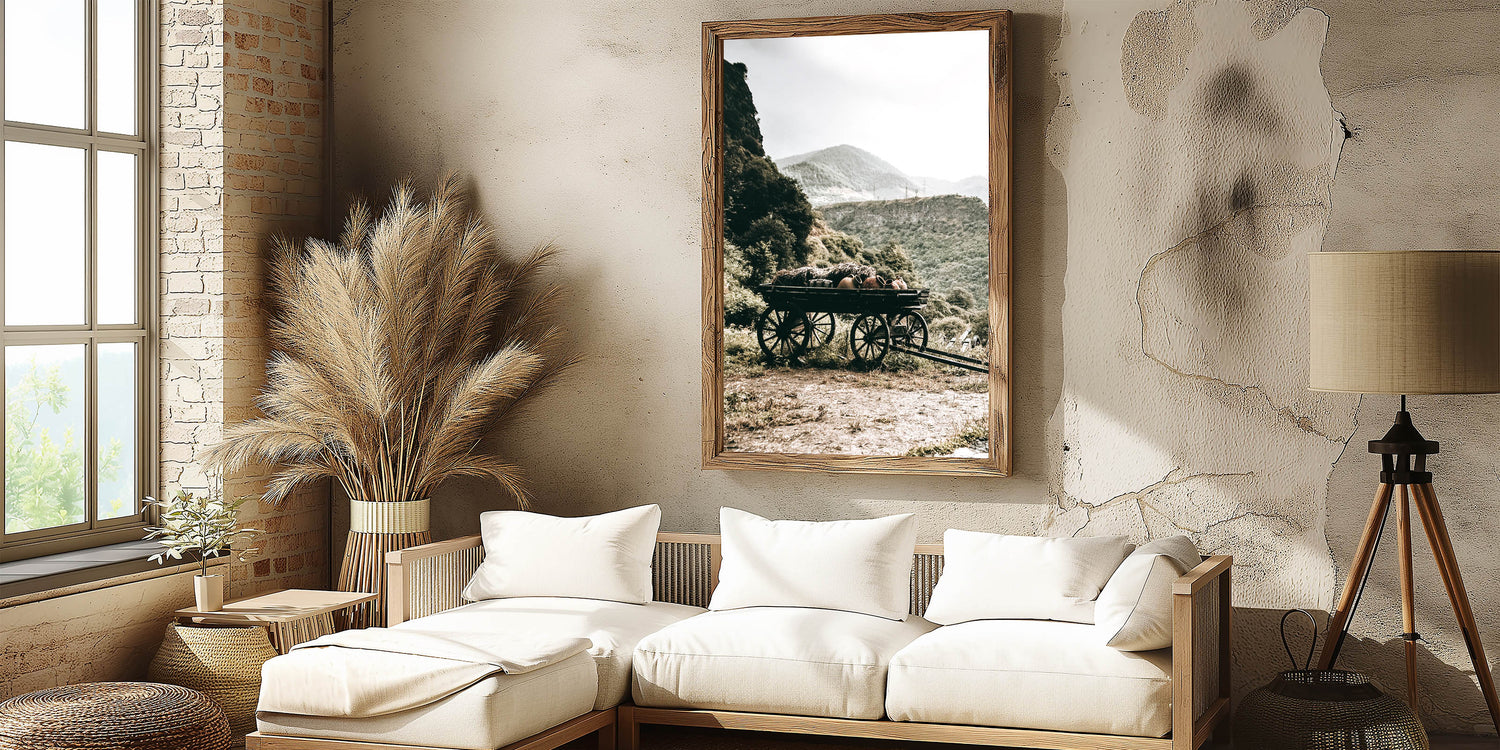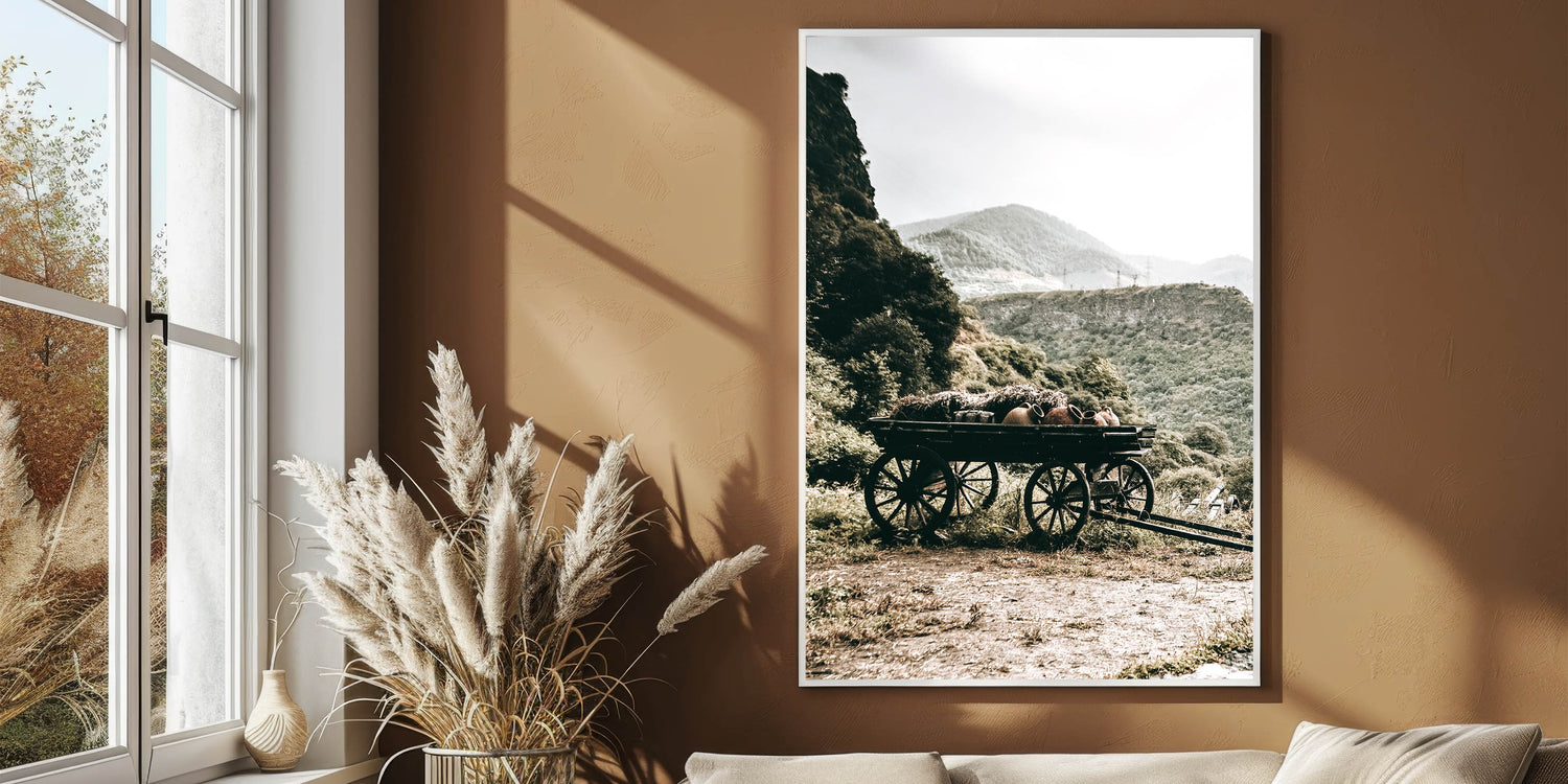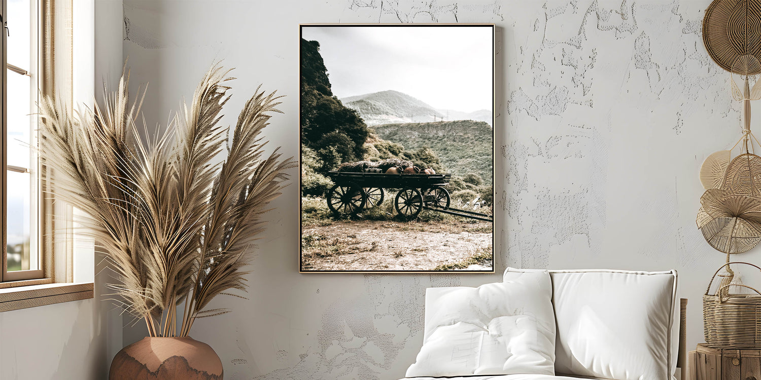 Transform your living space with this captivating rustic mountain wagon wall art. Featuring an old-fashioned wagon filled with earthen pottery, set against a peaceful mountain landscape, this piece is ideal for creating a cozy and serene atmosphere. The design perfectly captures the essence of country living, making it an excellent addition to any farmhouse-style decor.