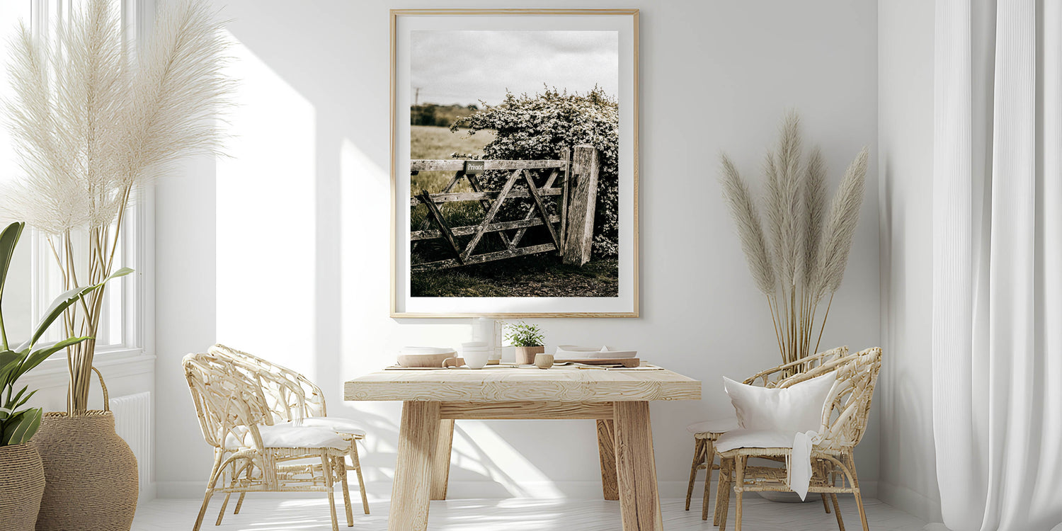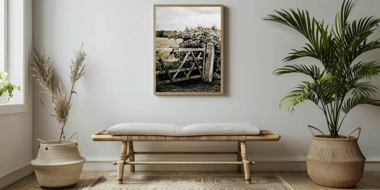 The image captures a rustic gate weathered by time, complemented by a bush filled with white blossoms, evoking a sense of serenity and privacy. This piece is ideal for anyone looking to enhance their farmhouse décor, adding a natural and authentic rural vibe to living rooms, hallways, or even outdoor patio spaces.