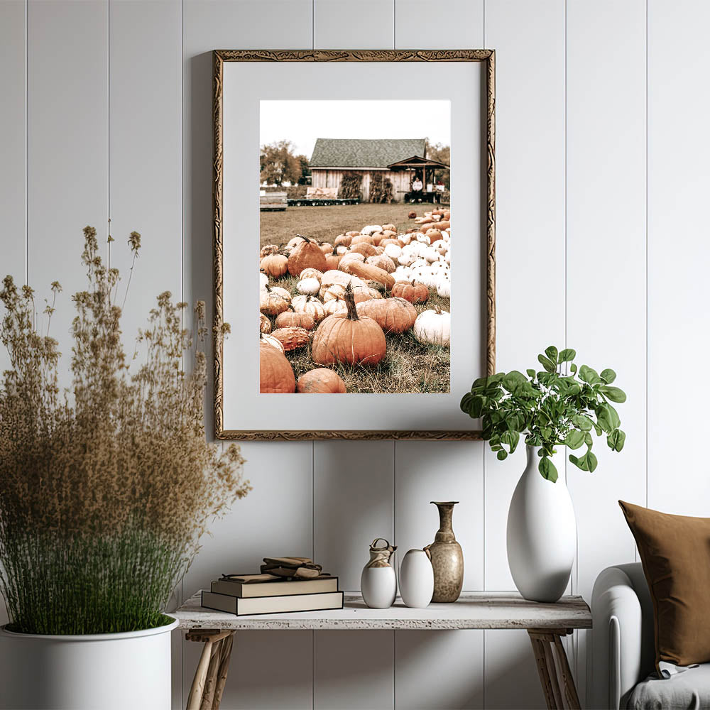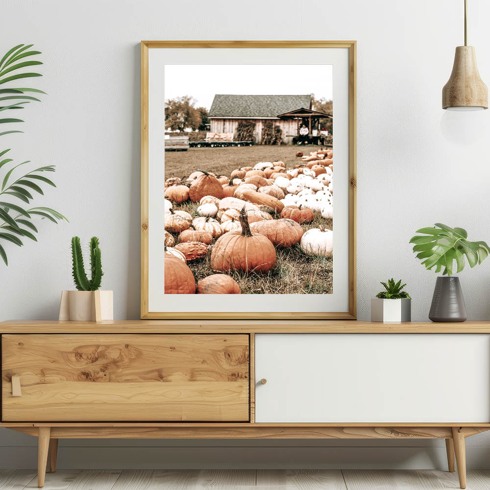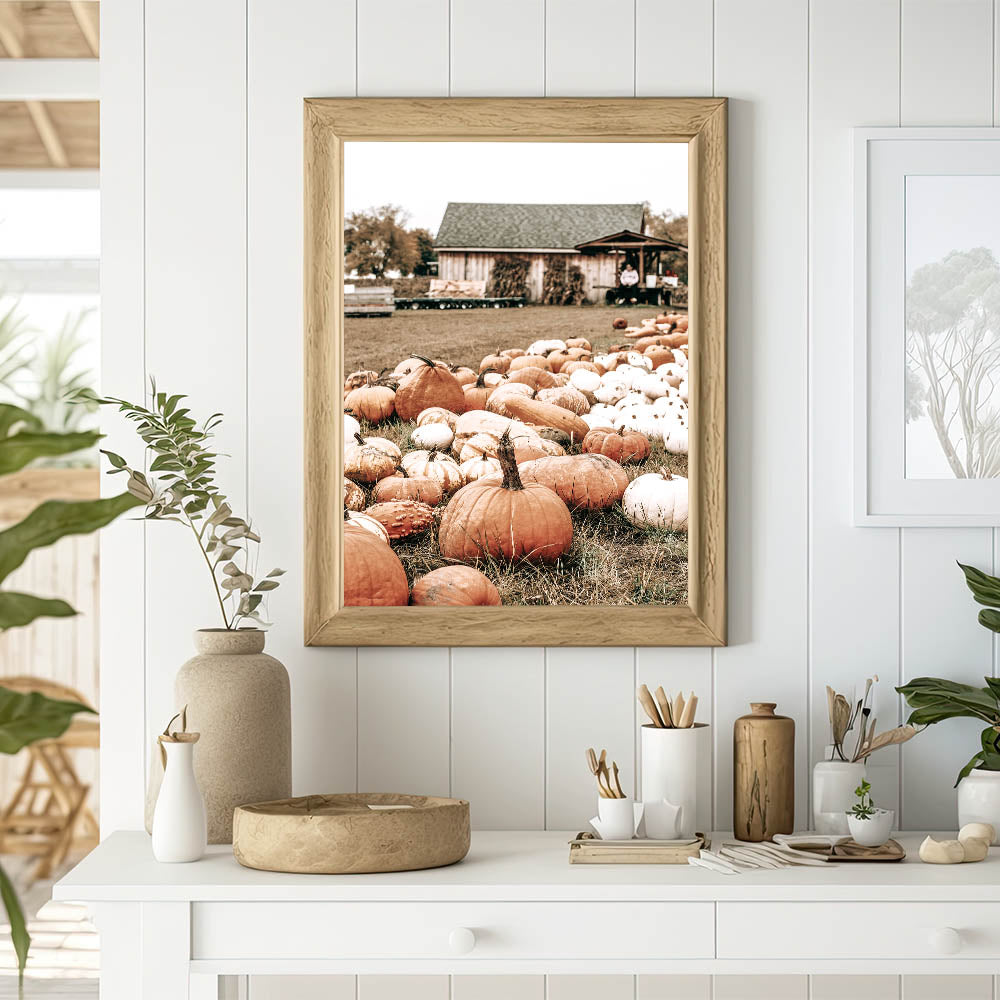 Celebrate the beauty of the fall season with this rustic pumpkin harvest wall art. Featuring an array of pumpkins in various shapes and colors spread across a field, this piece captures the essence of autumn’s warmth and charm. The weathered barn in the background adds to the cozy, country aesthetic, making this artwork the perfect addition to your farmhouse-style decor, especially during the fall months.