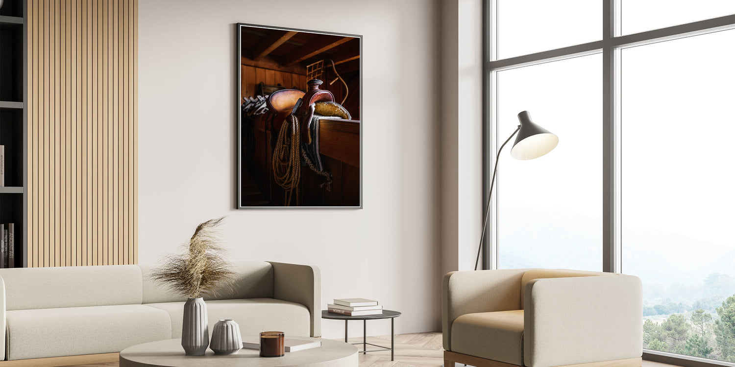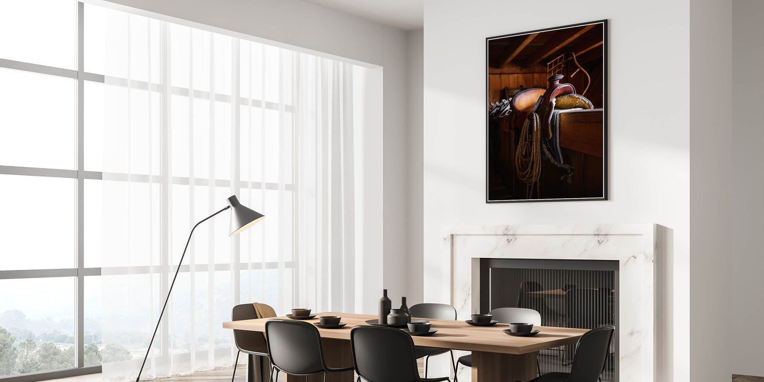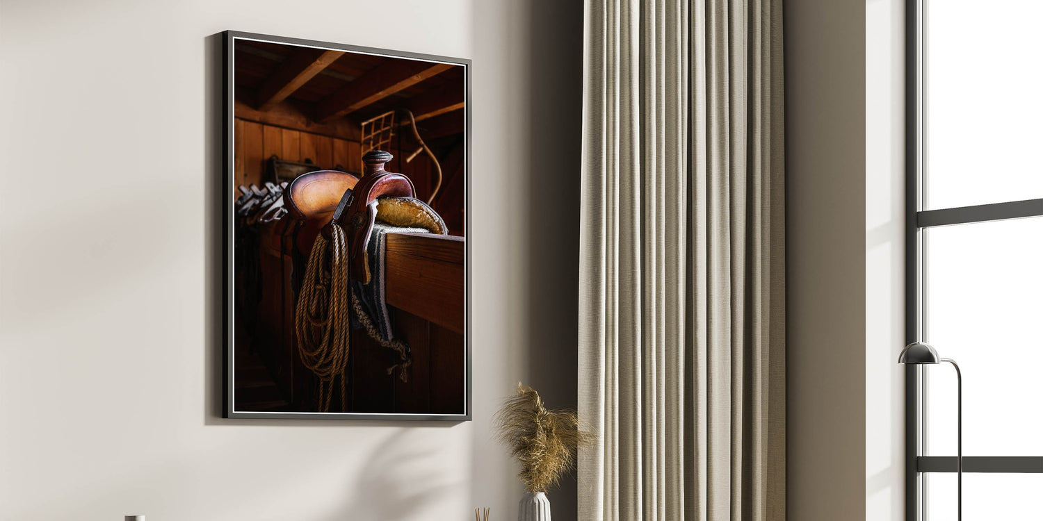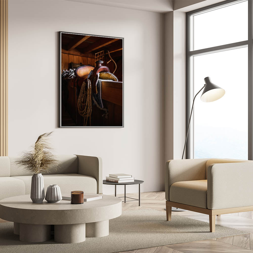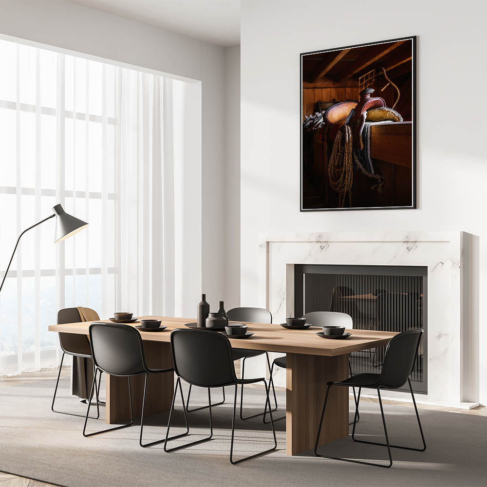 - Design: A detailed portrayal of a rustic leather saddle in a barn, perfect for adding warmth and depth to your home’s decor.