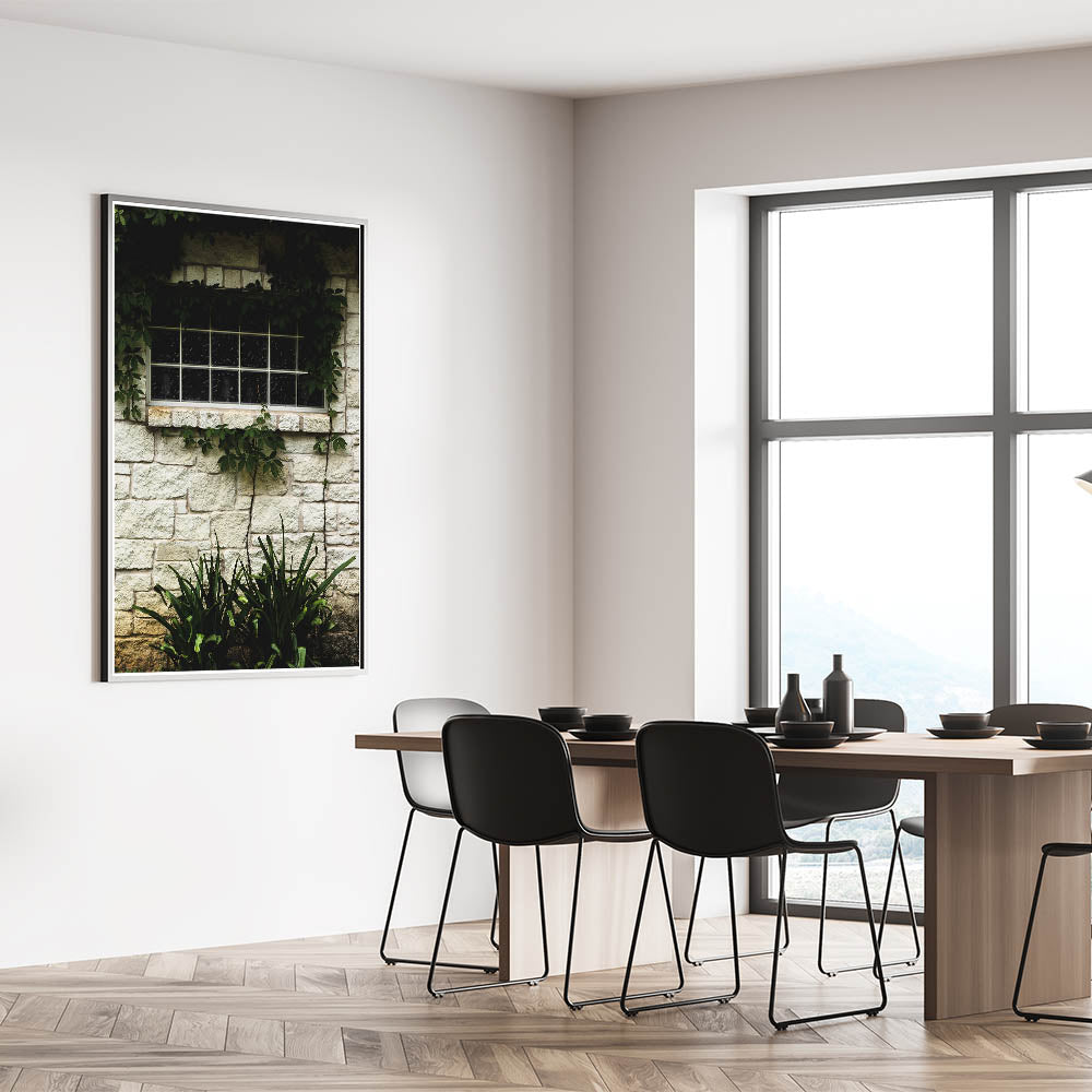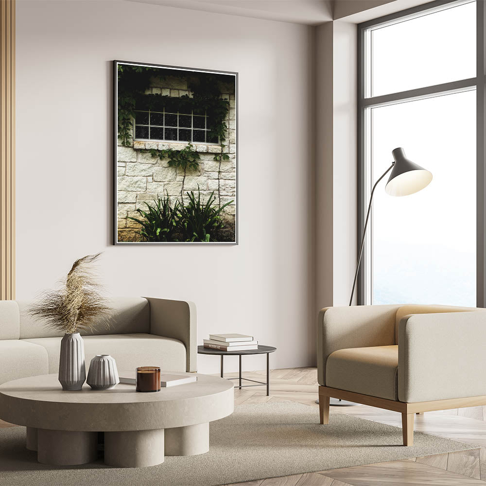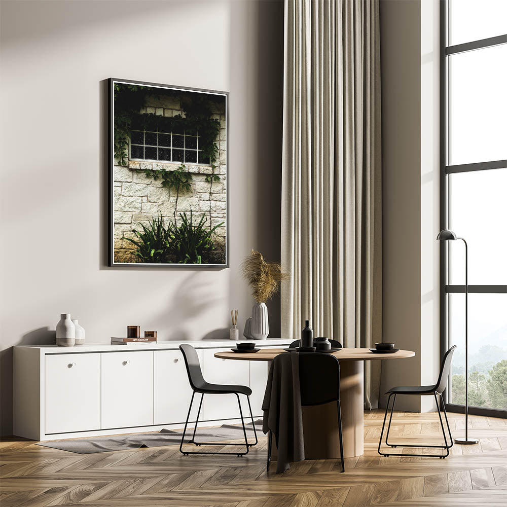 This charming rustic wall art captures the timeless beauty of nature blending with architecture. The ivy climbing over the stone wall and the rustic window creates a peaceful and serene atmosphere, making it the perfect piece for farmhouse decor. The natural tones of the stone and greenery complement a variety of rustic and nature-inspired styles, adding warmth and tranquility to your space.