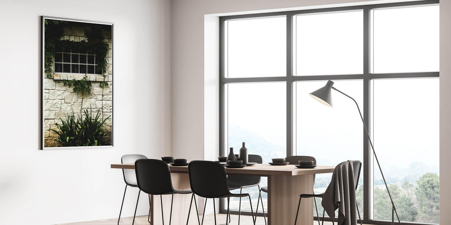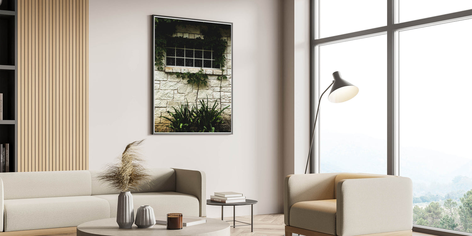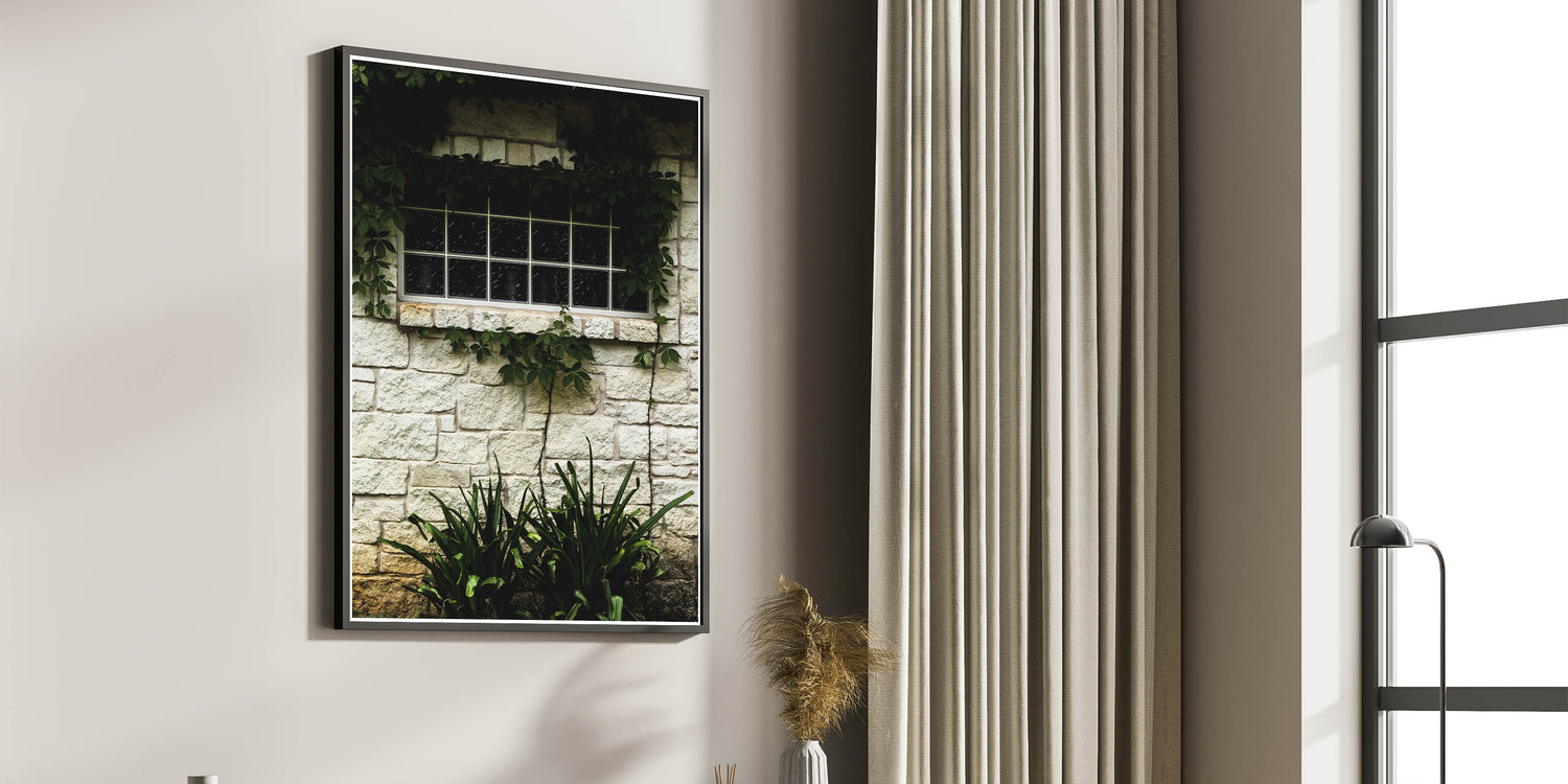 This charming rustic wall art captures the timeless beauty of nature blending with architecture. The ivy climbing over the stone wall and the rustic window creates a peaceful and serene atmosphere, making it the perfect piece for farmhouse decor. The natural tones of the stone and greenery complement a variety of rustic and nature-inspired styles, adding warmth and tranquility to your space.