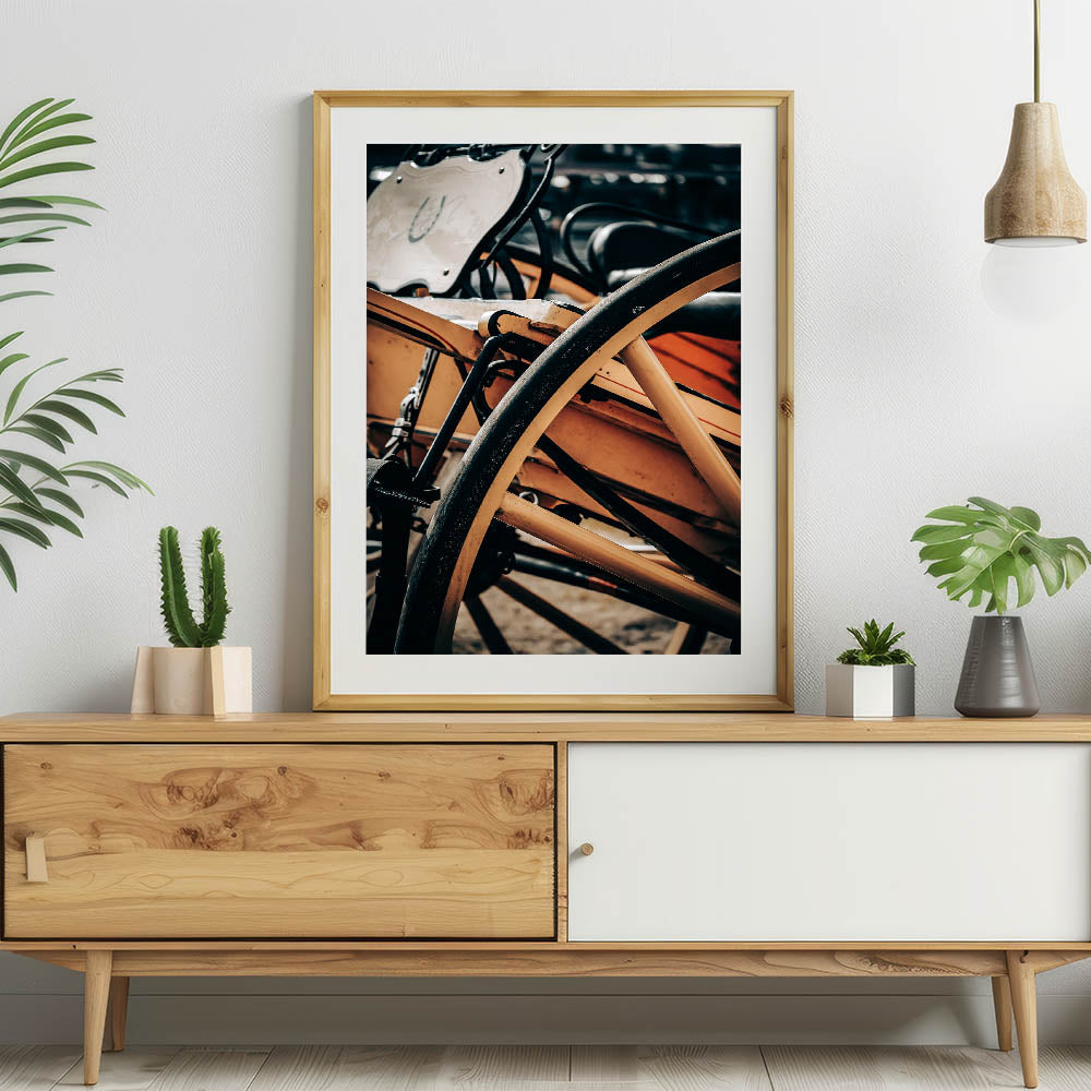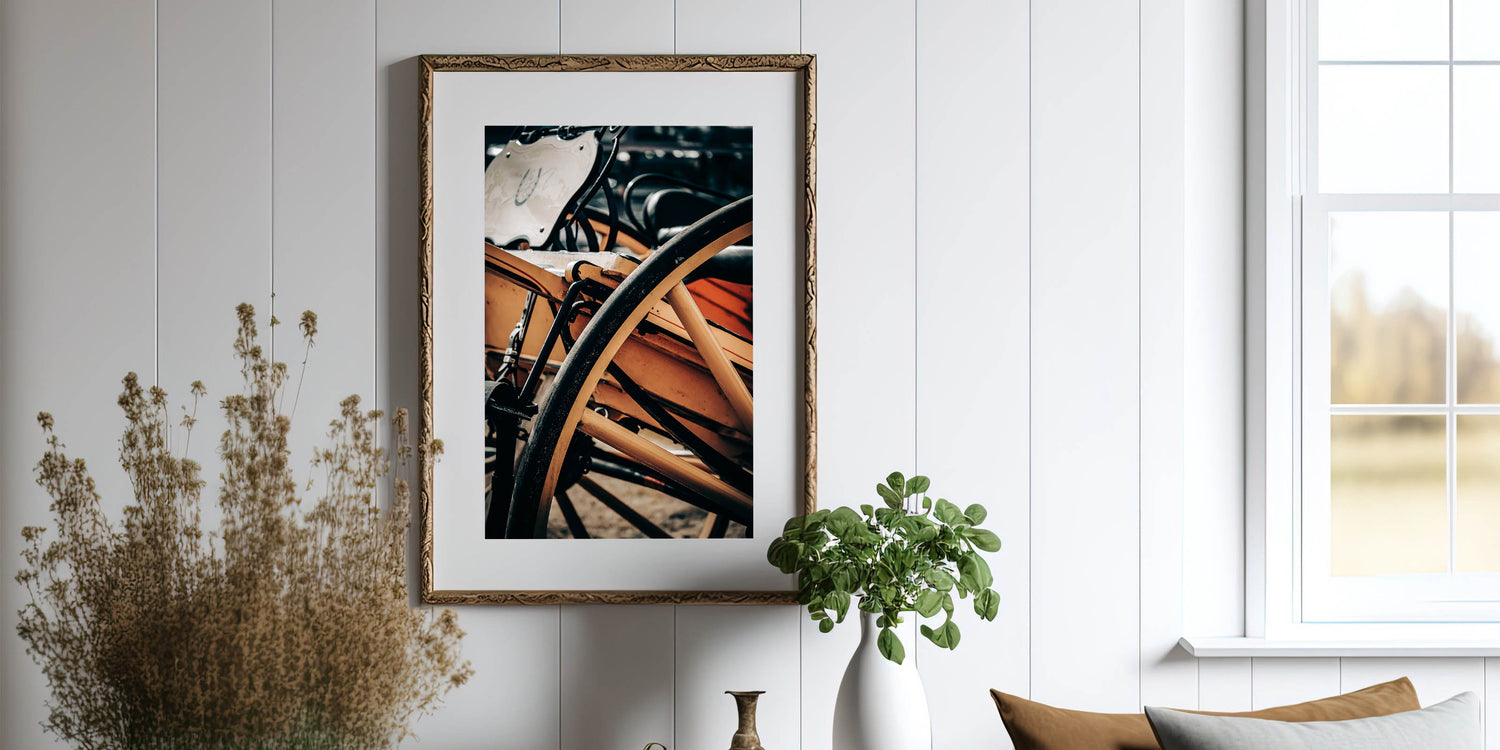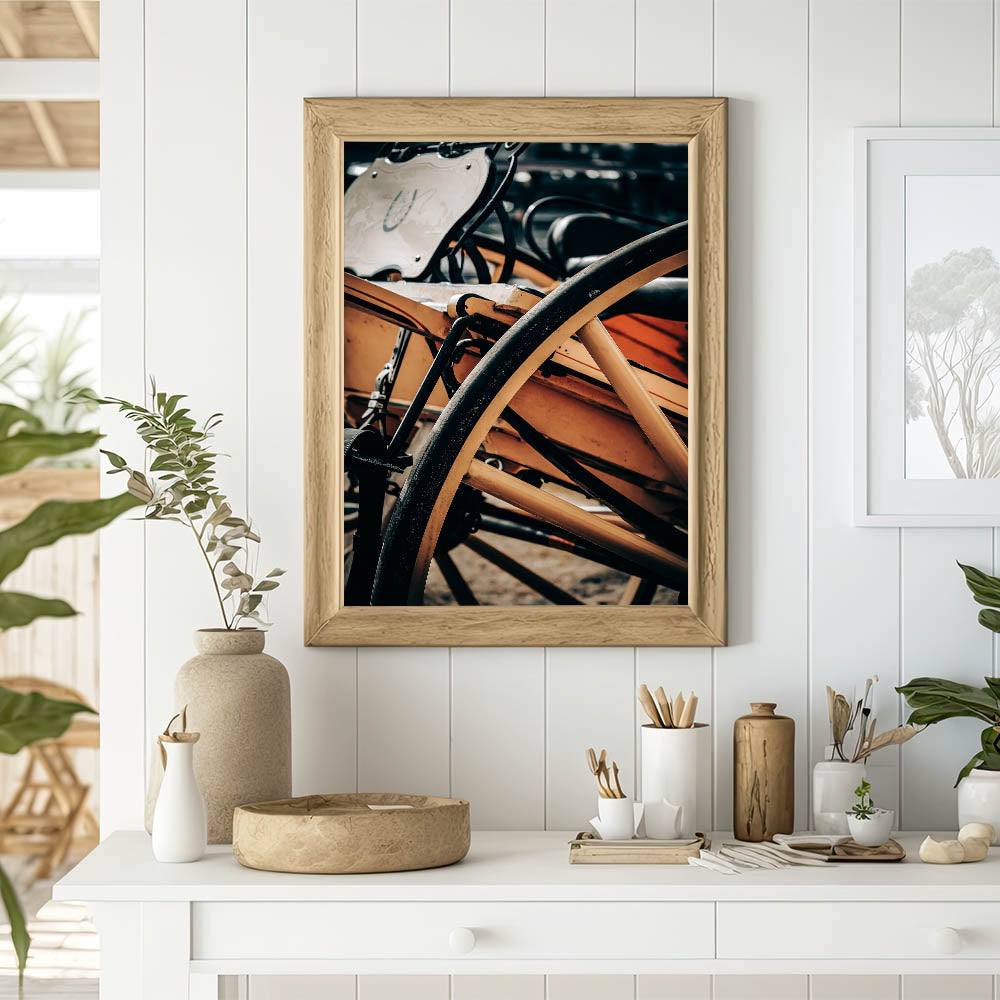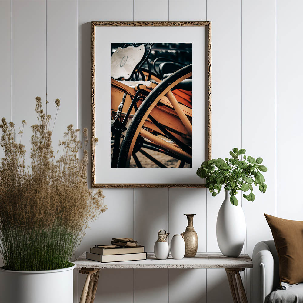 Bring a sense of rustic elegance to your home with this close-up wall art of a vintage wagon wheel. The detailed textures of the weathered wood and metal elements evoke the hardworking spirit and charm of rural life. This vintage-inspired artwork perfectly captures the simplicity and beauty of country living, making it a wonderful addition to any farmhouse-style decor. The rich, warm tones of the wheel and wagon create a cozy and inviting atmosphere, offering a touch of rustic charm to your space.