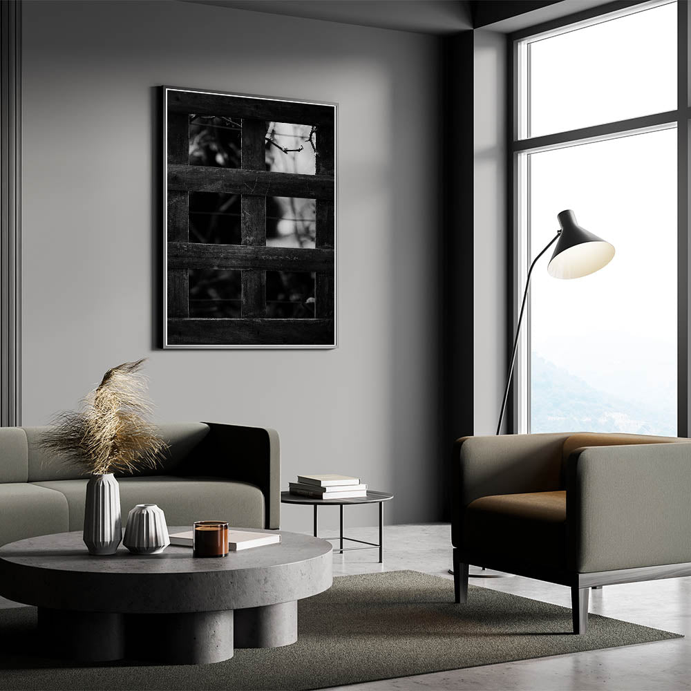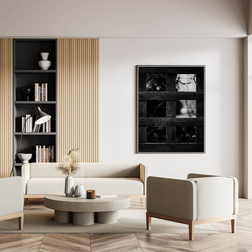 Embrace the simplicity and elegance of rustic decor with this captivating black and white wall art featuring a wooden lattice. The stark contrast of the aged wood and the shadows behind creates a timeless, vintage-inspired aesthetic, making it the perfect addition to any farmhouse or industrial-style interior. Whether you're decorating a living room, hallway, or office, this piece captures the essence of rustic charm and natural beauty.