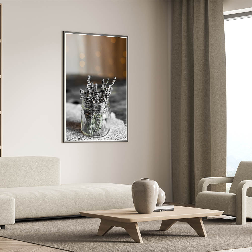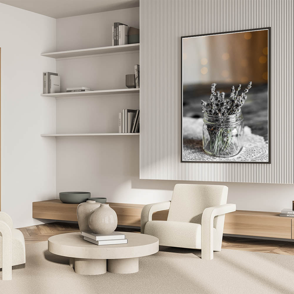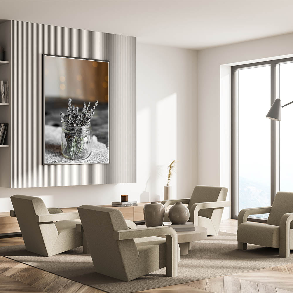 - Features a delicate lavender bouquet in a glass jar, perfect for farmhouse-style art prints