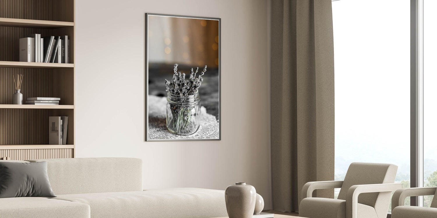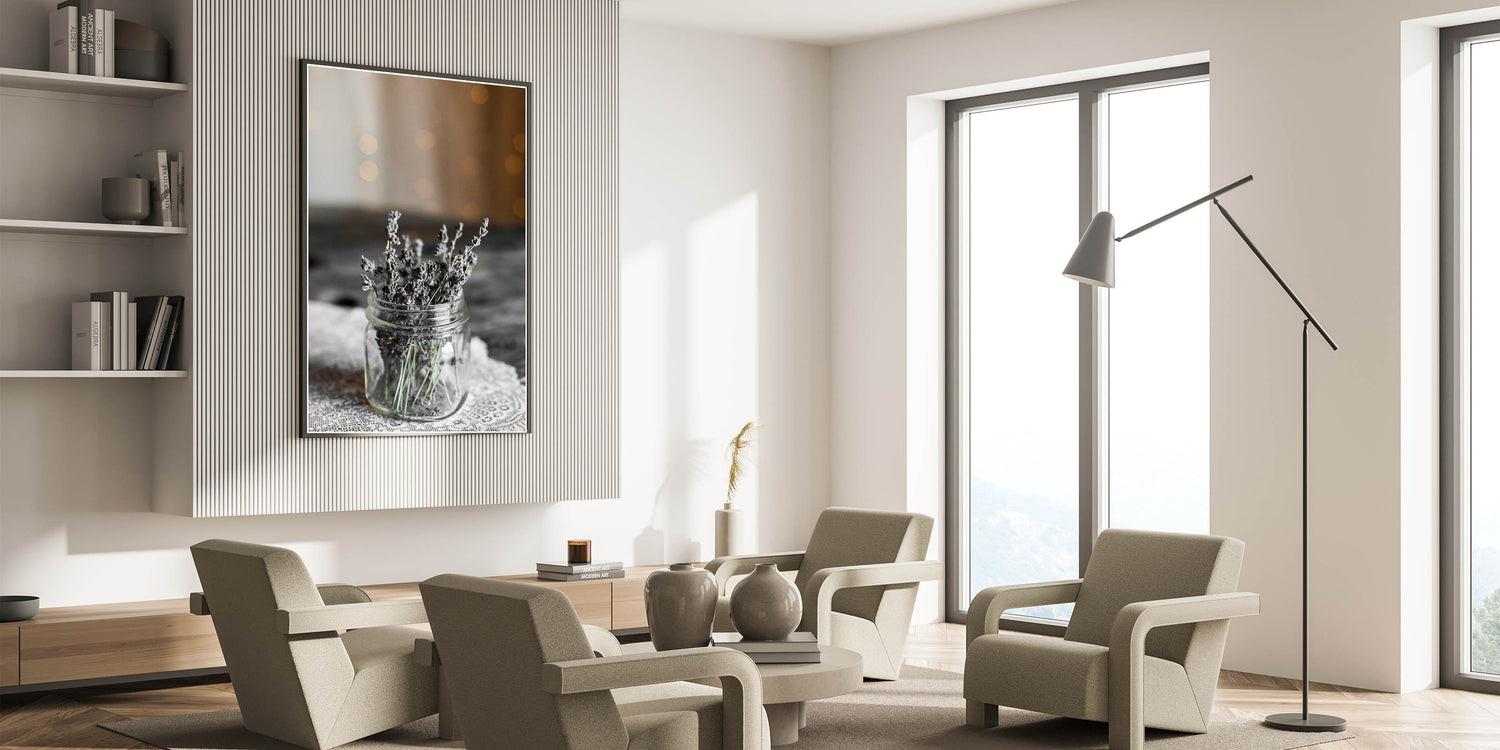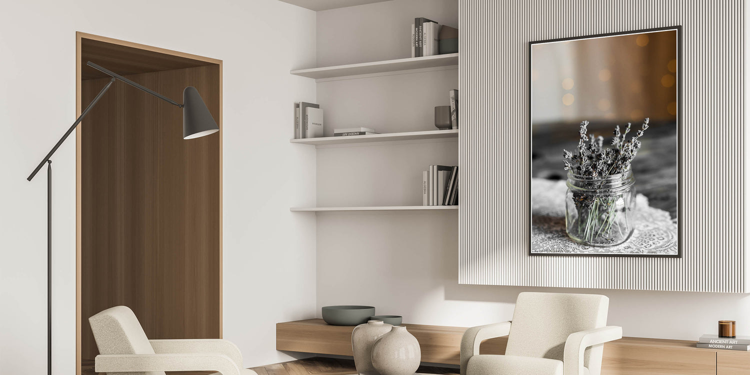 - Features a delicate lavender bouquet in a glass jar, perfect for farmhouse-style art prints