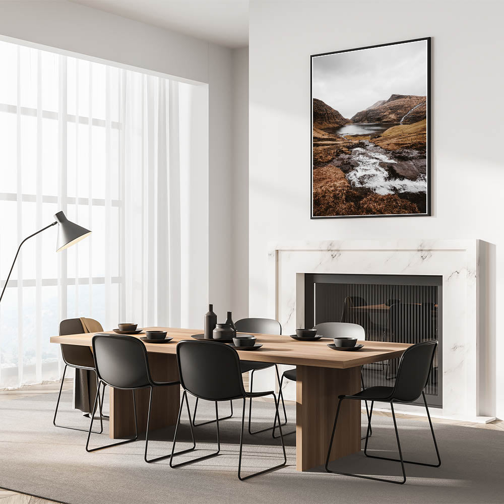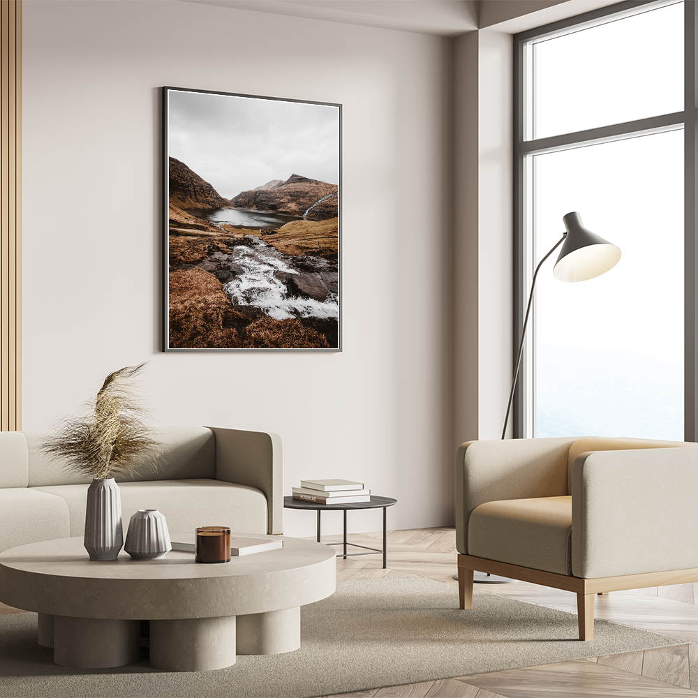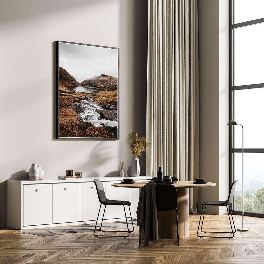 • Captures a stunning mountain landscape with a flowing stream, ideal for adding rustic nature scenes to your home