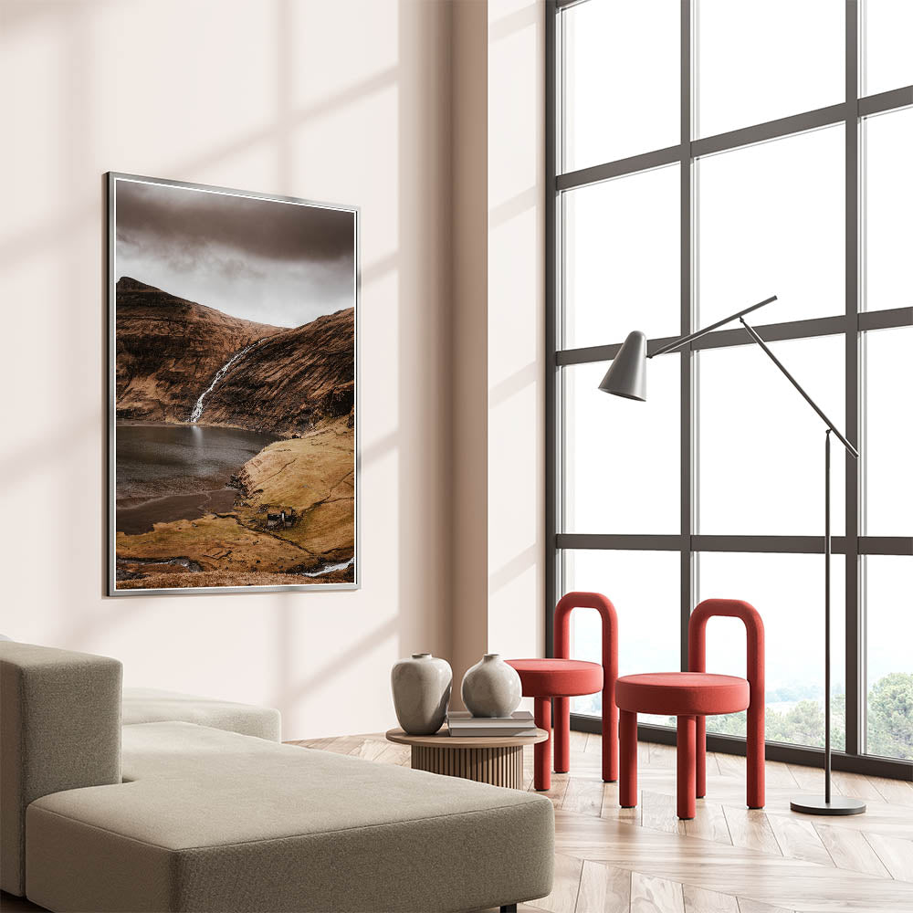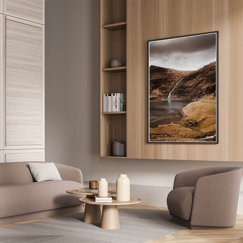• Depicts a serene waterfall flowing into a lake, with a quaint cabin tucked away in the hills, perfect for bringing a calming, rustic charm into your space