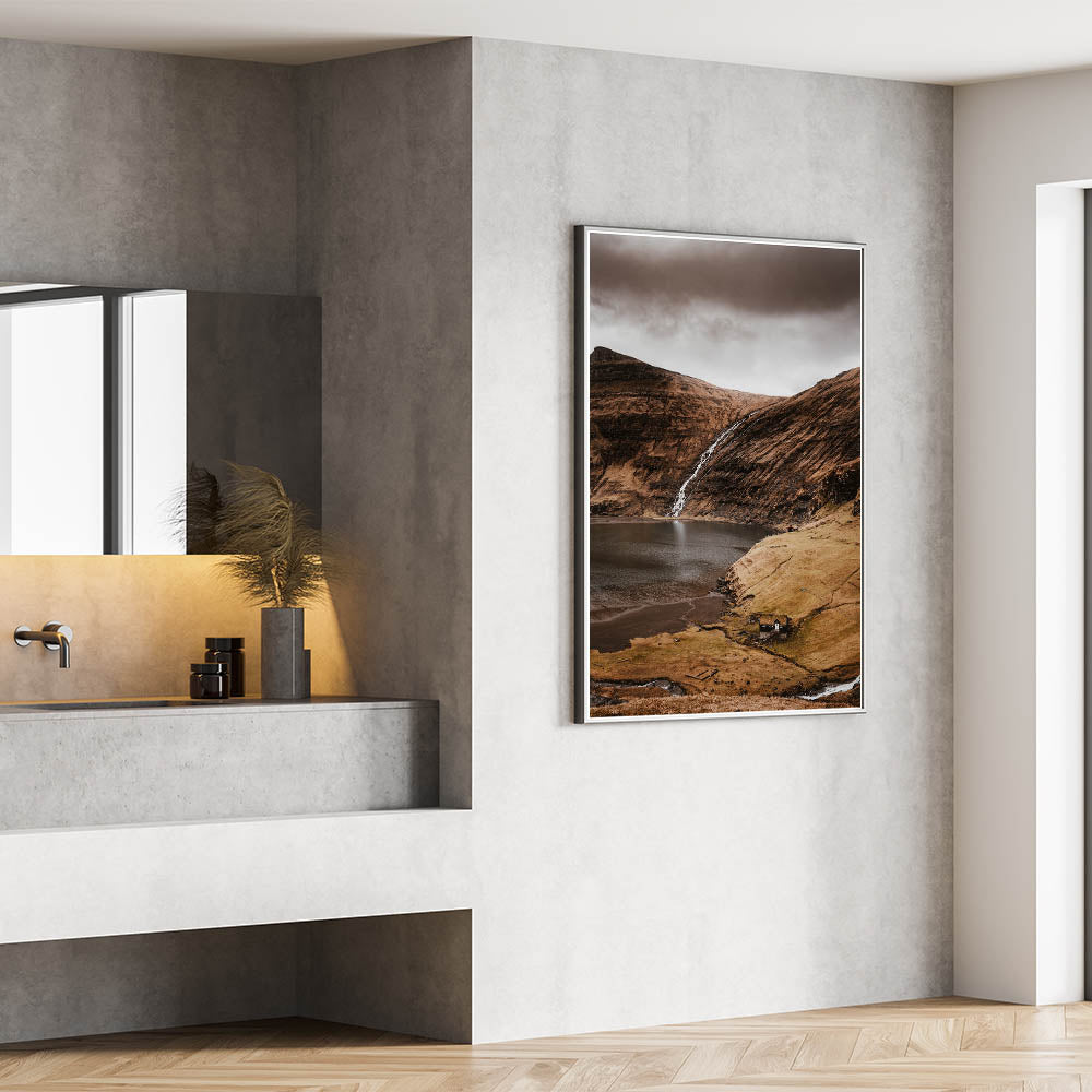 Transform your space with the natural beauty of this rustic wall art featuring a dramatic mountain landscape with a cascading waterfall and a charming cabin nestled in the valley. The earthy tones of the mountains and the stillness of the water create a peaceful yet dynamic scene, perfect for adding a touch of nature and tranquility to your farmhouse-inspired decor. The rich textures and colors make this artwork a captivating addition to any room.