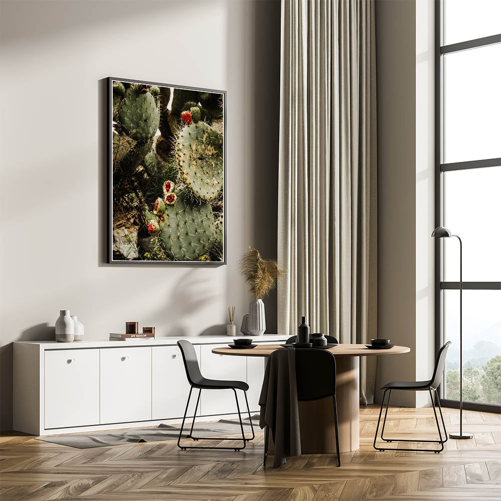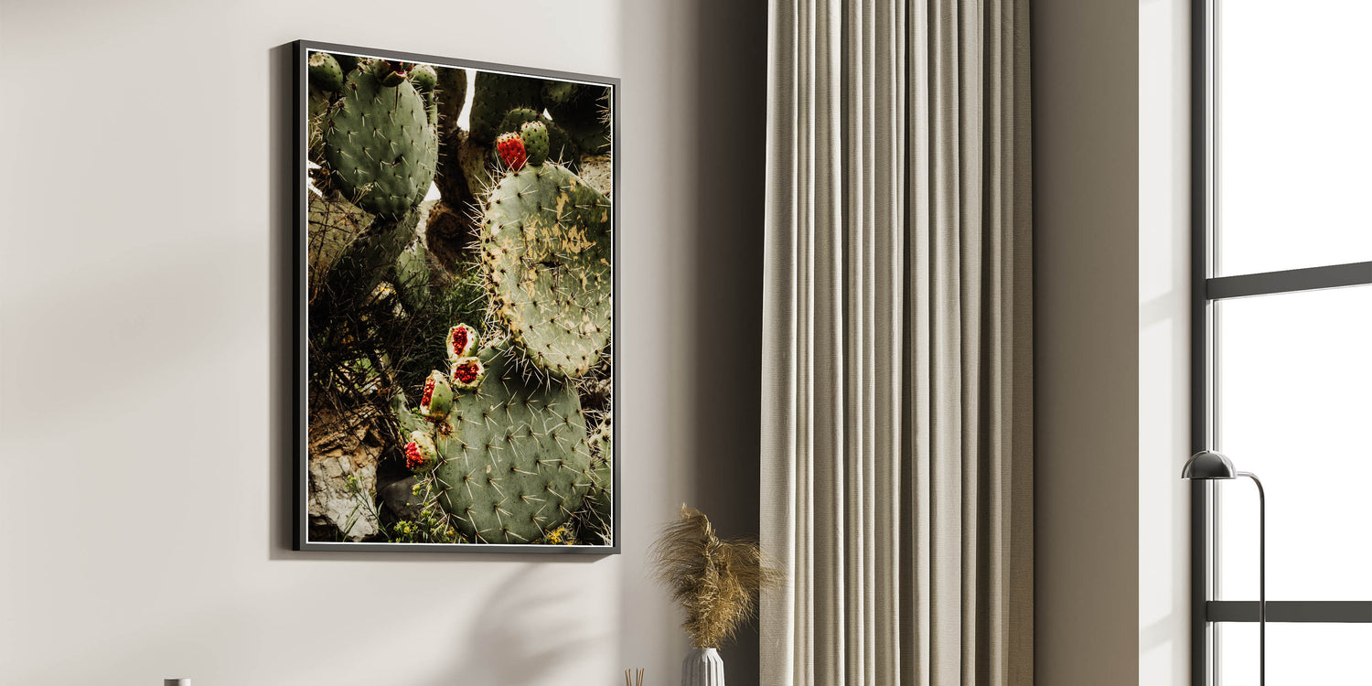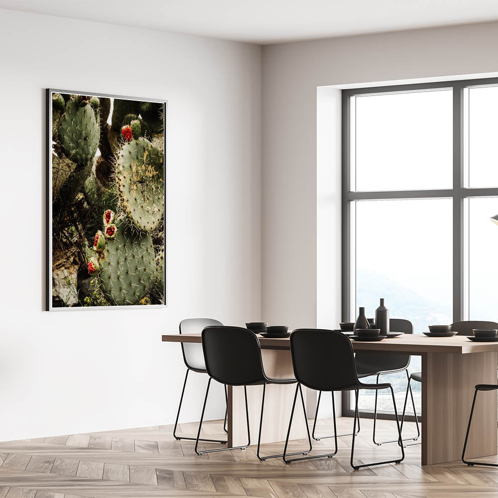 Bring the beauty and rugged charm of the desert into your home with this Rustic Wall Art, featuring a striking close-up of a prickly pear cactus adorned with vibrant red fruit. The earthy green tones of the cactus combined with the bold pop of red make this piece a stunning addition to any farmhouse decor or vintage-inspired wall art collection. The intricate details of the cactus spines and natural textures evoke the raw beauty of nature, perfect for adding a rustic touch to your space.