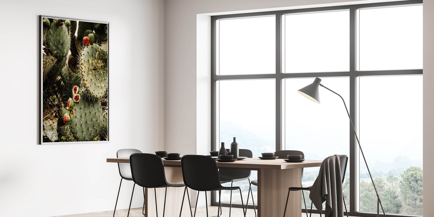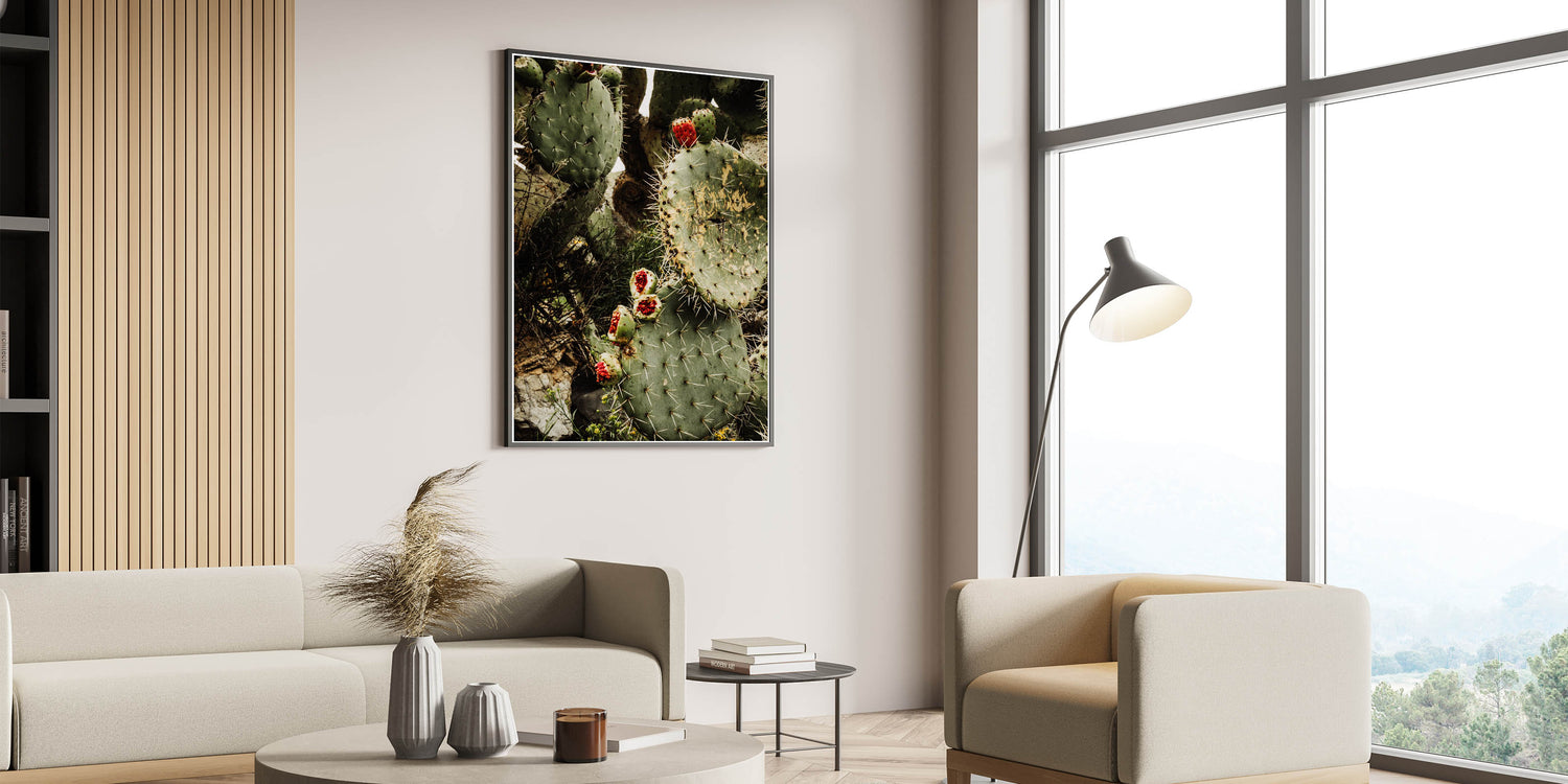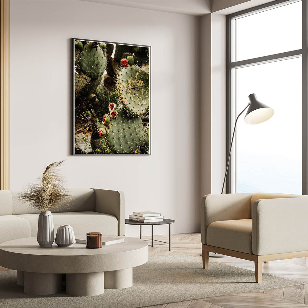 Bring the beauty and rugged charm of the desert into your home with this Rustic Wall Art, featuring a striking close-up of a prickly pear cactus adorned with vibrant red fruit. The earthy green tones of the cactus combined with the bold pop of red make this piece a stunning addition to any farmhouse decor or vintage-inspired wall art collection. The intricate details of the cactus spines and natural textures evoke the raw beauty of nature, perfect for adding a rustic touch to your space.