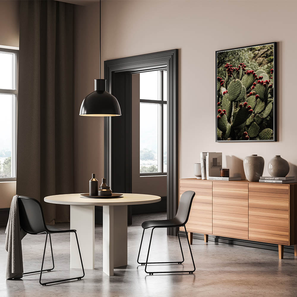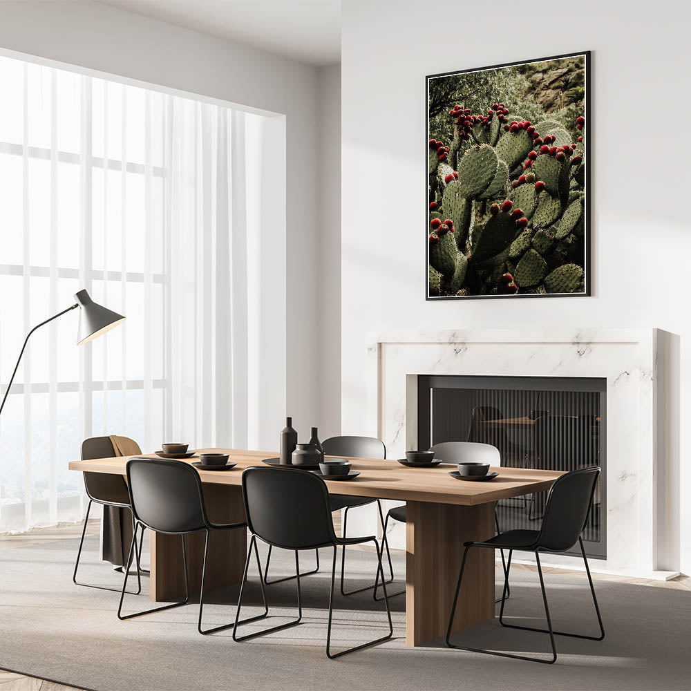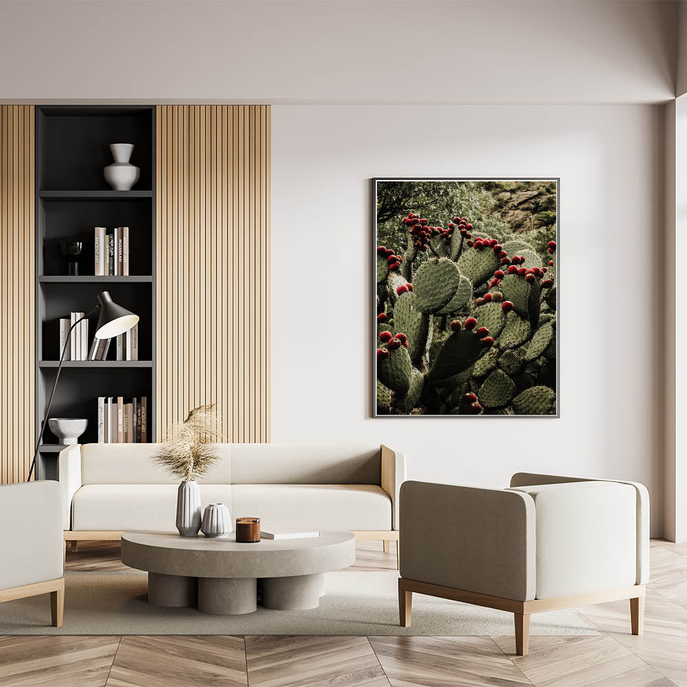 Transform your space with this vibrant Rustic Wall Art featuring a striking display of prickly pear cacti adorned with red fruit. The rich green hues of the cacti, contrasted by the bold pops of red, create a lively and dynamic composition that adds rustic charm to any room. Perfect for anyone looking to bring the warmth of the desert into their home, this piece enhances any farmhouse decor or vintage-inspired wall art collection.