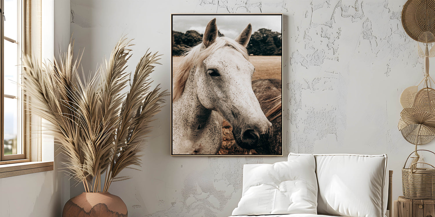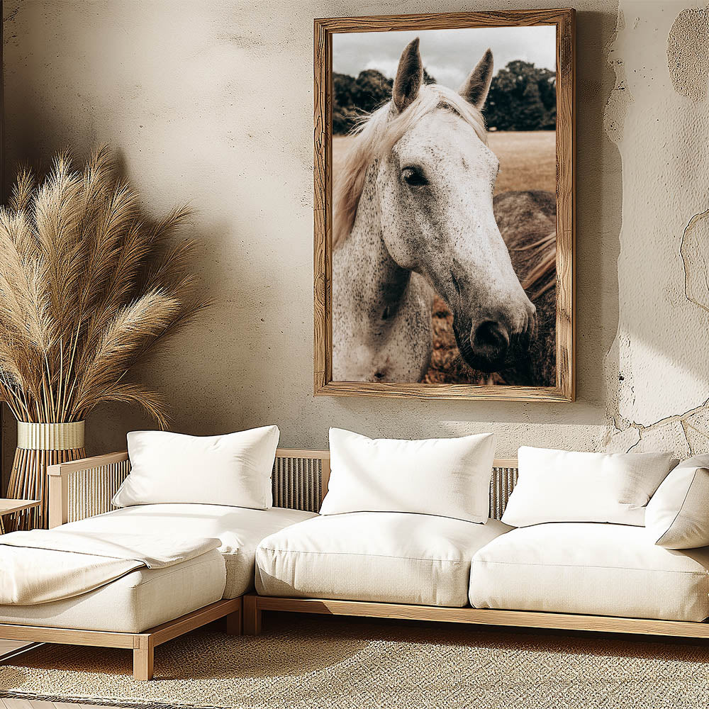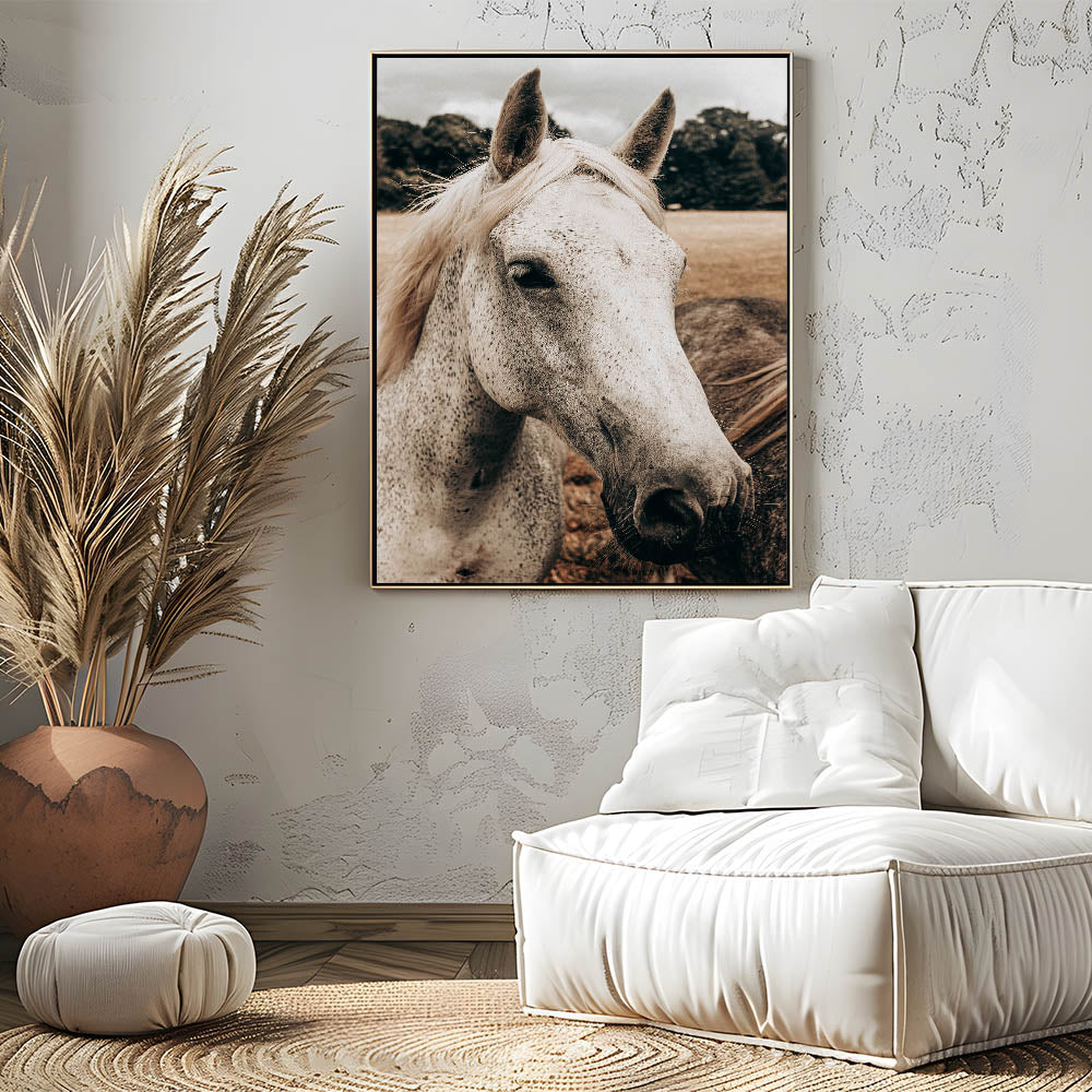 Add a touch of rustic elegance to your home with this close-up portrait of a white horse. This detailed artwork captures the serene beauty of the countryside, offering a perfect blend of rustic charm and antique farmhouse aesthetic. The soft tones and fine textures of the horse’s coat and the surrounding natural landscape make this piece an ideal addition to any farmhouse-style decor. Perfect for those who love the simplicity and peacefulness of rural life, this artwork will bring warmth and character to any room.