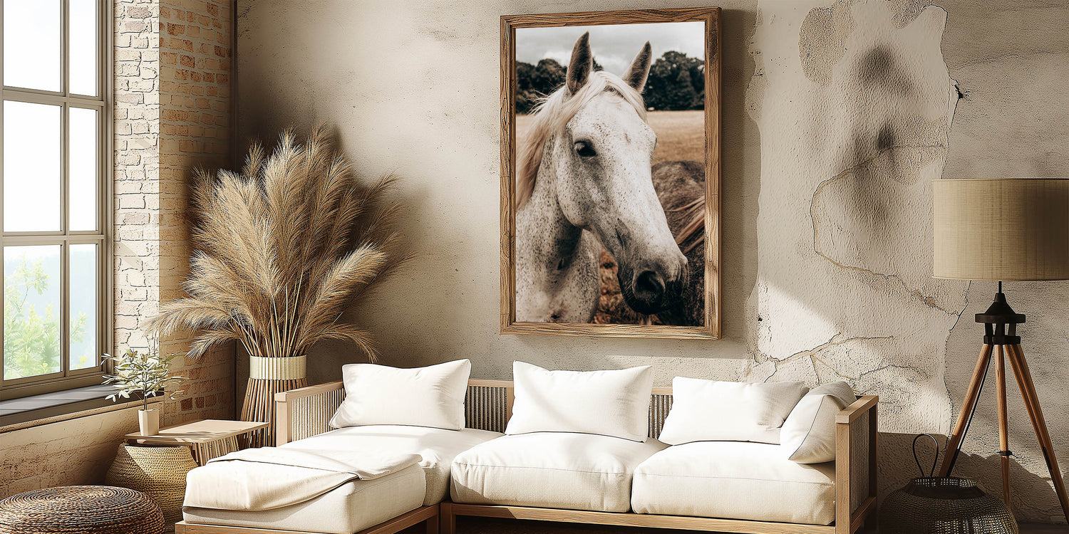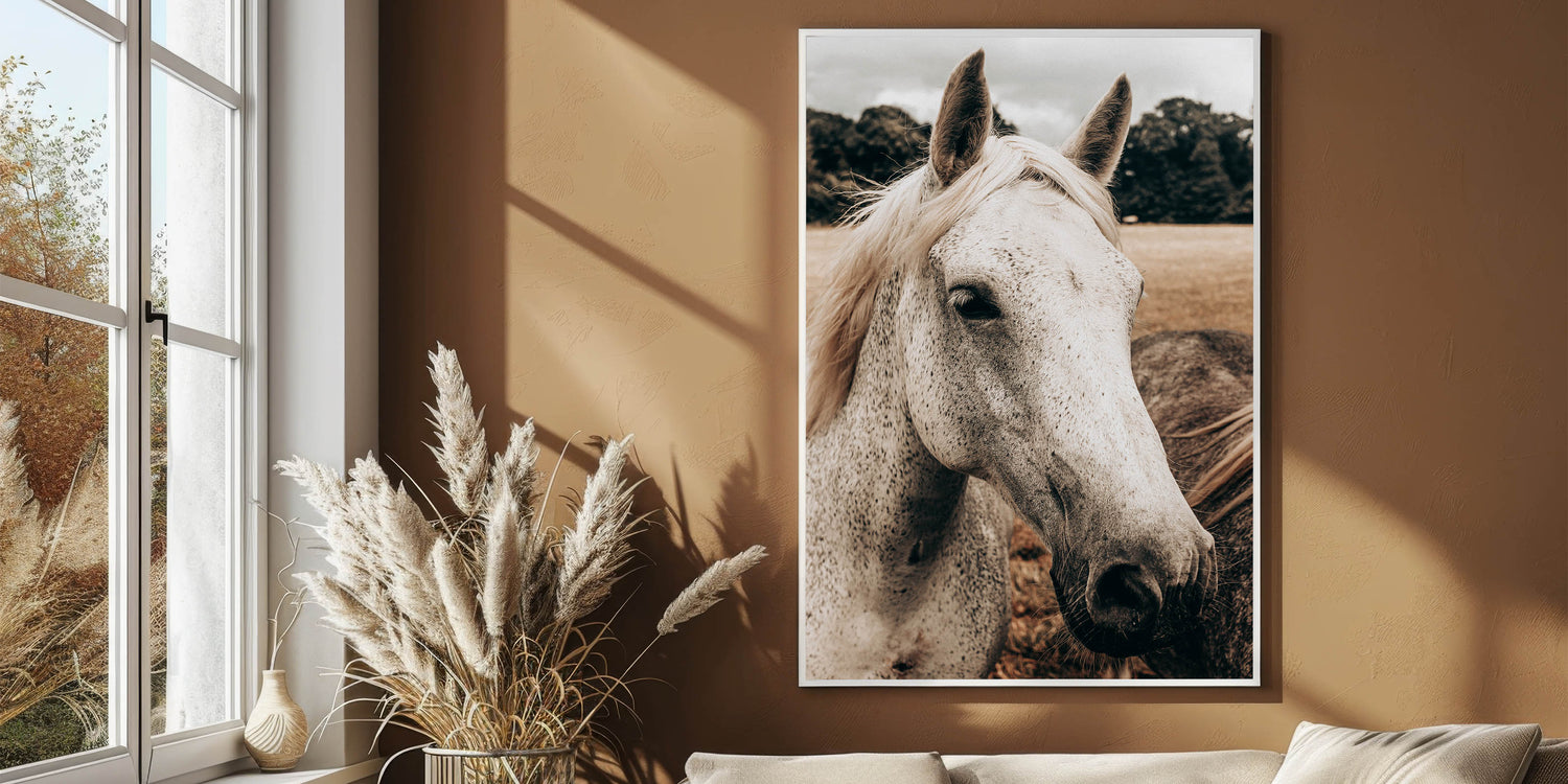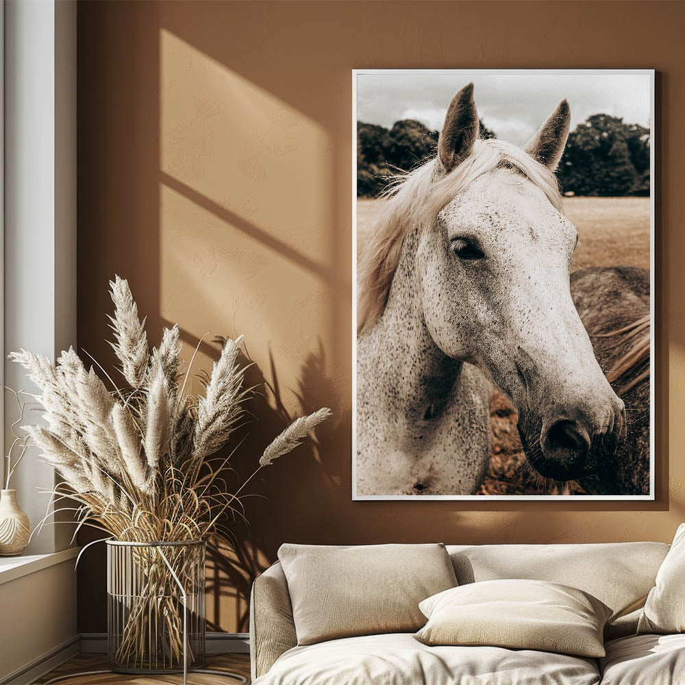 Add a touch of rustic elegance to your home with this close-up portrait of a white horse. This detailed artwork captures the serene beauty of the countryside, offering a perfect blend of rustic charm and antique farmhouse aesthetic. The soft tones and fine textures of the horse’s coat and the surrounding natural landscape make this piece an ideal addition to any farmhouse-style decor. Perfect for those who love the simplicity and peacefulness of rural life, this artwork will bring warmth and character to any room.