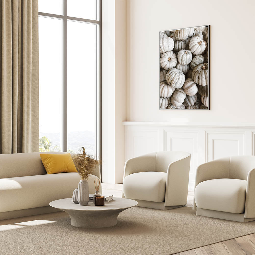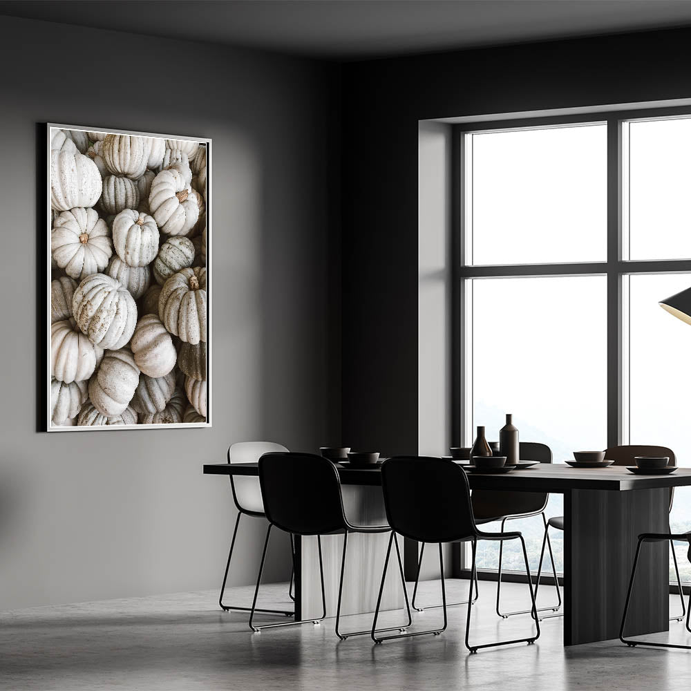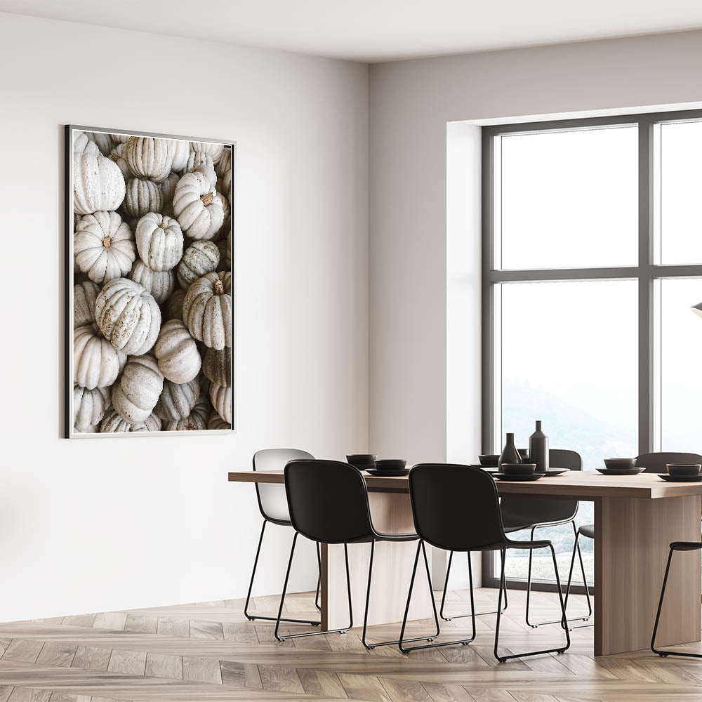 Celebrate the essence of autumn with this rustic white pumpkin wall art. The soft neutral tones and organic textures of the pumpkins create a calming yet festive atmosphere, perfect for enhancing your farmhouse decor. This artwork captures the beauty of a seasonal harvest while offering a modern take on rustic design, making it ideal for any room where you want to add warmth and subtle sophistication.