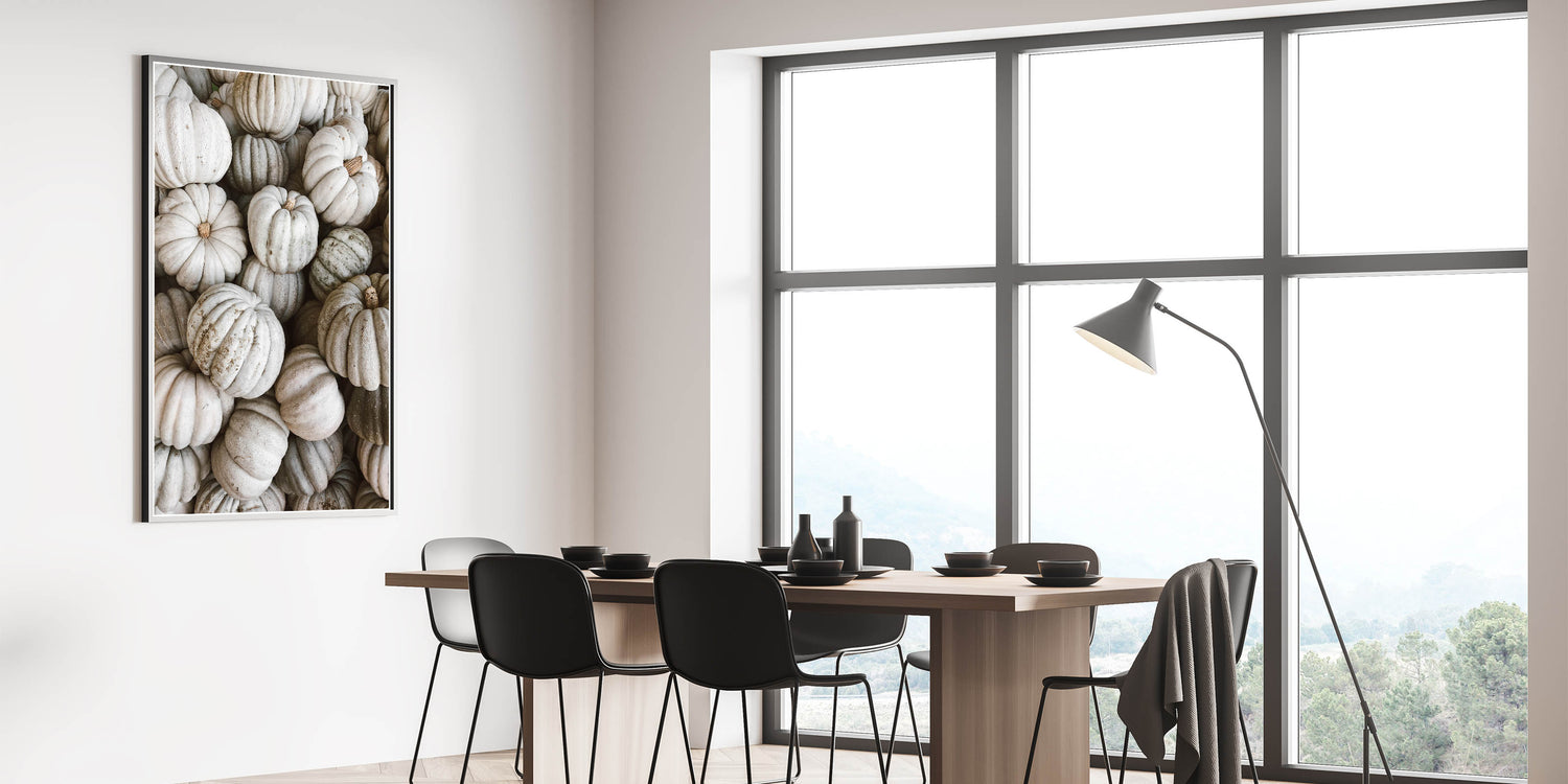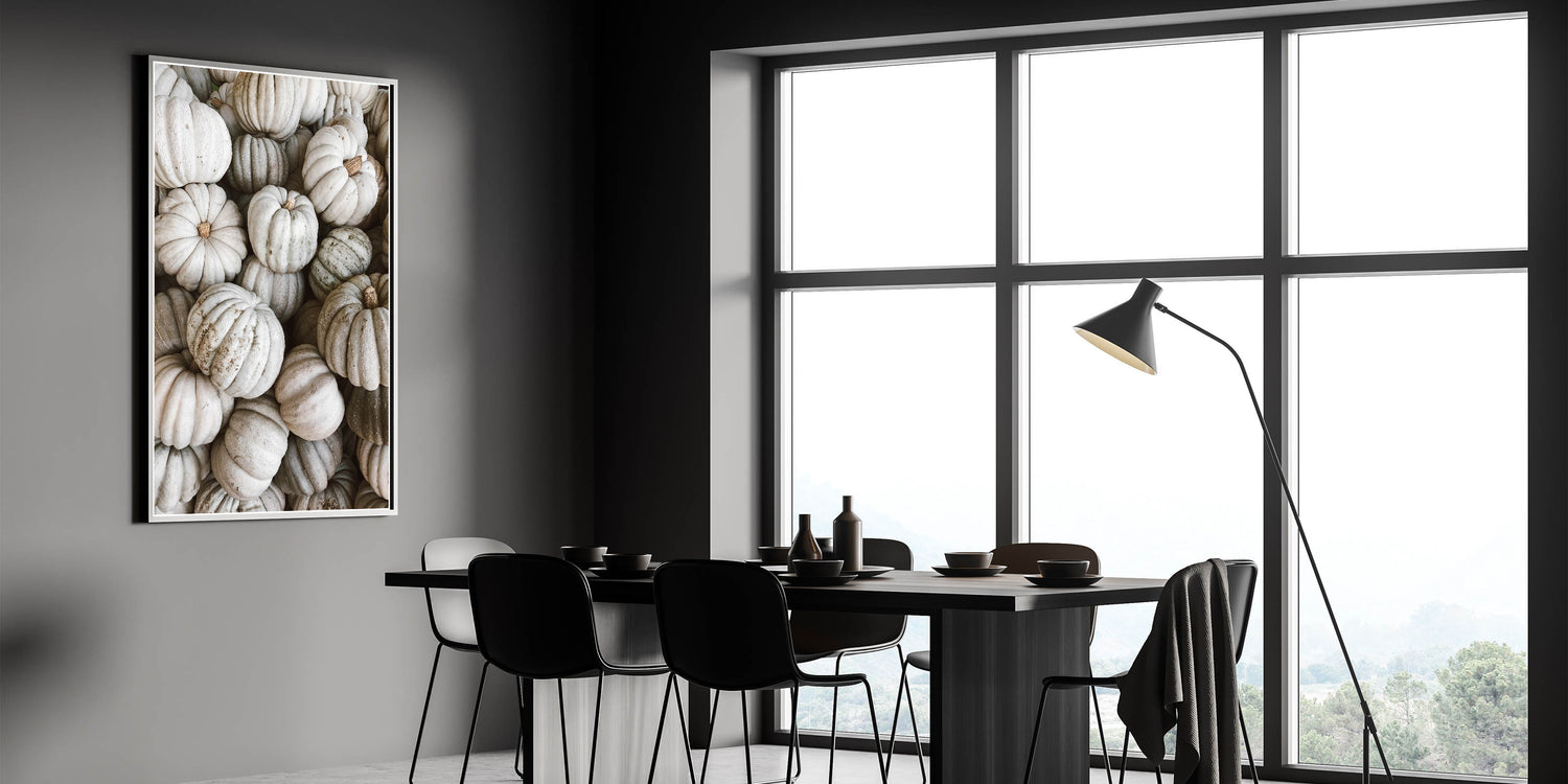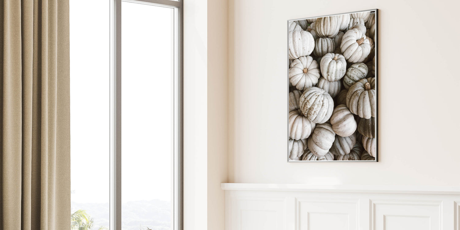Celebrate the essence of autumn with this rustic white pumpkin wall art. The soft neutral tones and organic textures of the pumpkins create a calming yet festive atmosphere, perfect for enhancing your farmhouse decor. This artwork captures the beauty of a seasonal harvest while offering a modern take on rustic design, making it ideal for any room where you want to add warmth and subtle sophistication.