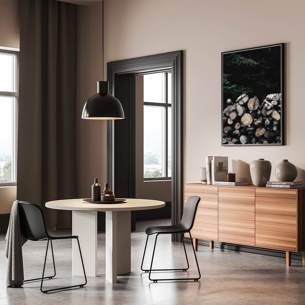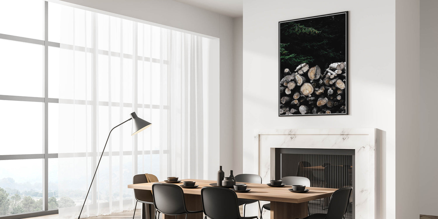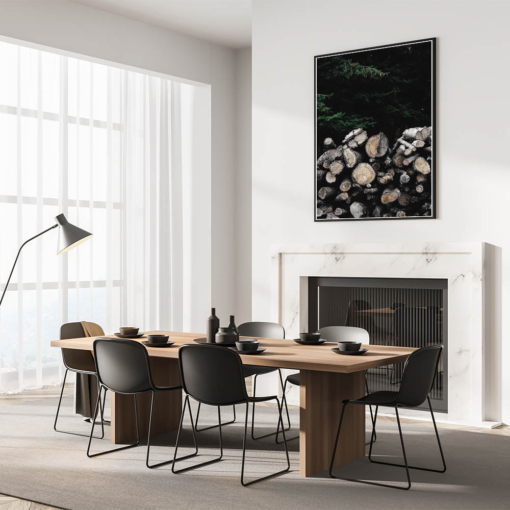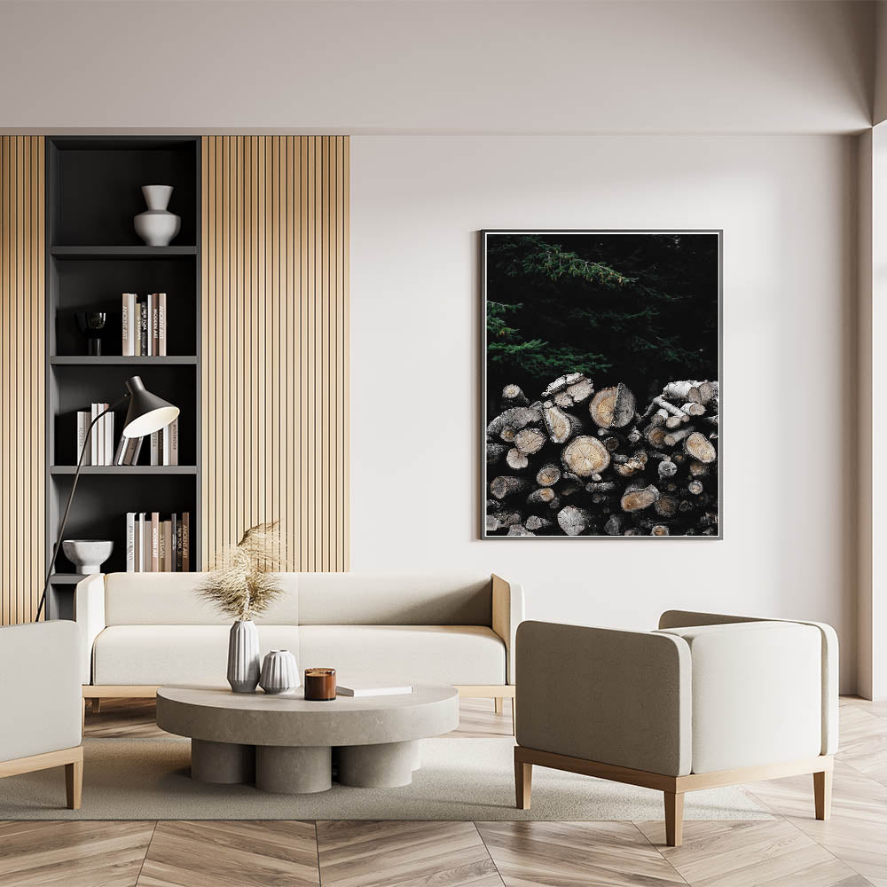 Bring the beauty of the outdoors inside with this striking piece of rustic wall art, showcasing a stack of freshly cut logs against a backdrop of dense evergreen trees. Perfect for those looking to add a touch of rustic charm to their home, this artwork embodies the essence of nature and rugged countryside living. Whether you're decorating a modern farmhouse or adding a natural element to your living space, this piece offers endless rustic home decor ideas.