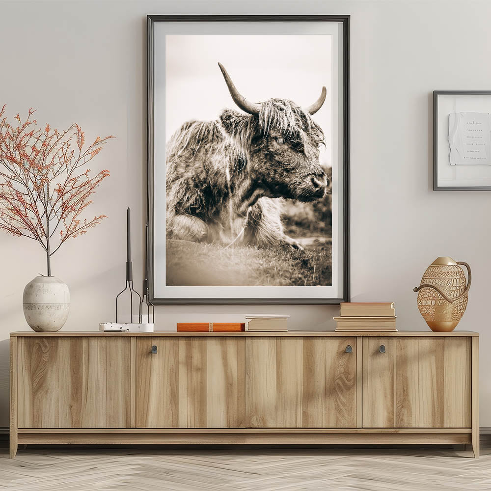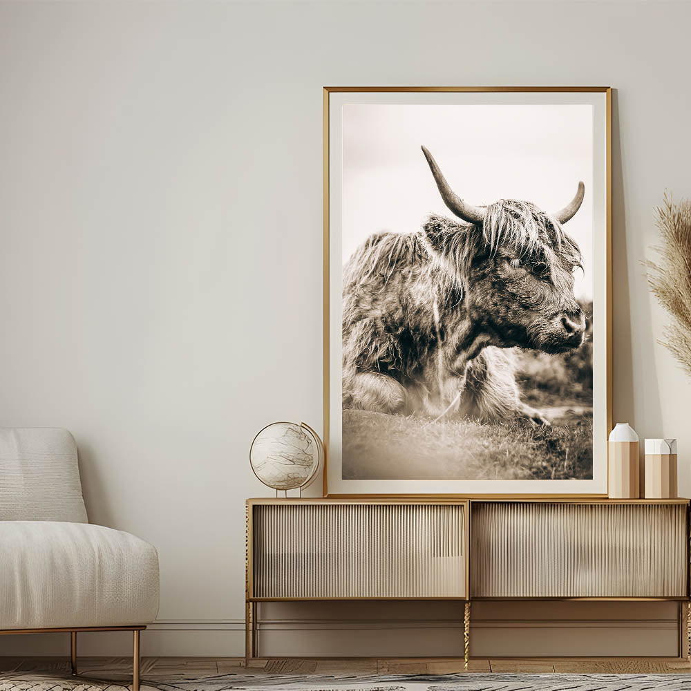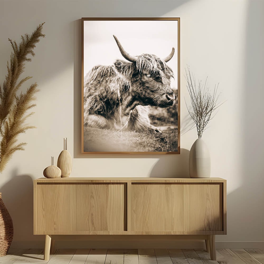 Sepia Highland Cow Wall Art | Tranquil Farmhouse Animal Decor