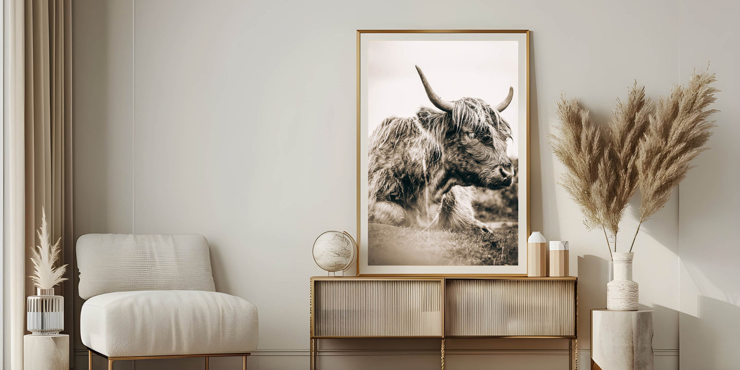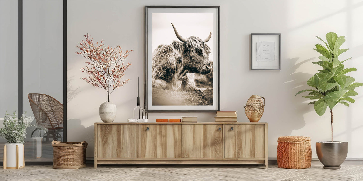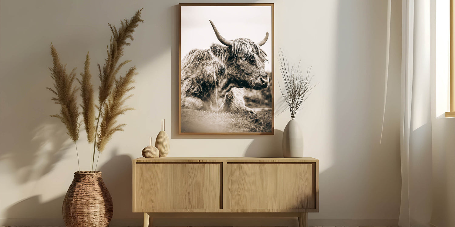 Sepia Highland Cow Wall Art | Tranquil Farmhouse Animal Decor