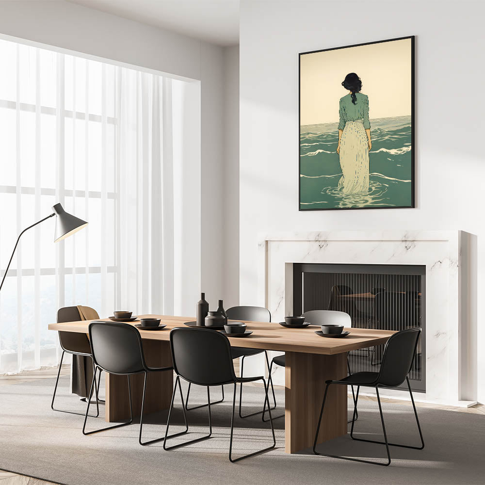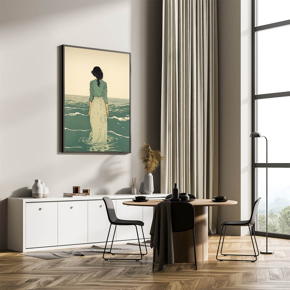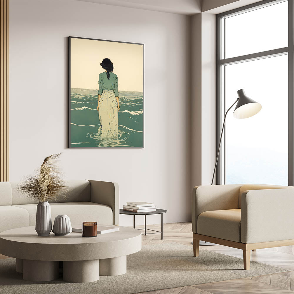 Immerse yourself in the tranquil beauty of this electric wall art, depicting a serene moment of a woman standing by the sea. The minimalist lines and soothing green and beige tones create a calming atmosphere, making this piece a perfect fit for those who love coastal-inspired decor. This unique electric artwork captures the essence of solitude and reflection, blending modern aesthetics with a timeless, peaceful scene.
