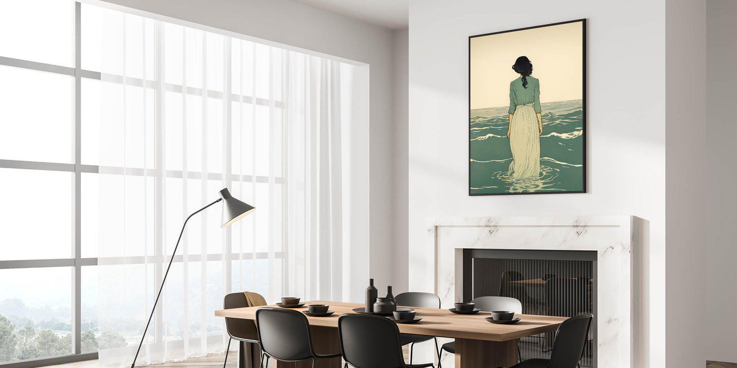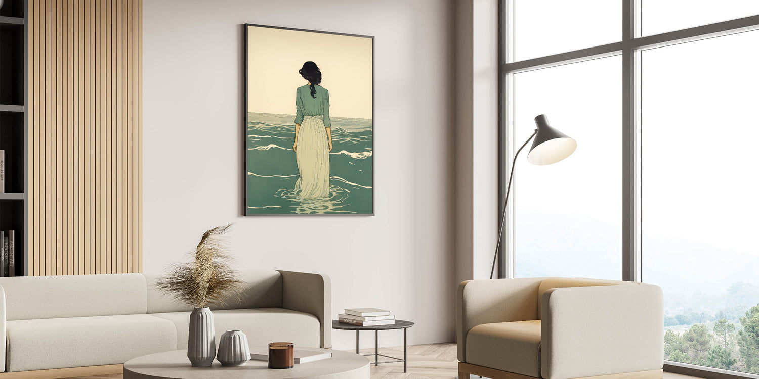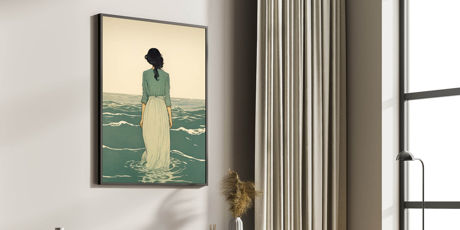 Immerse yourself in the tranquil beauty of this electric wall art, depicting a serene moment of a woman standing by the sea. The minimalist lines and soothing green and beige tones create a calming atmosphere, making this piece a perfect fit for those who love coastal-inspired decor. This unique electric artwork captures the essence of solitude and reflection, blending modern aesthetics with a timeless, peaceful scene.