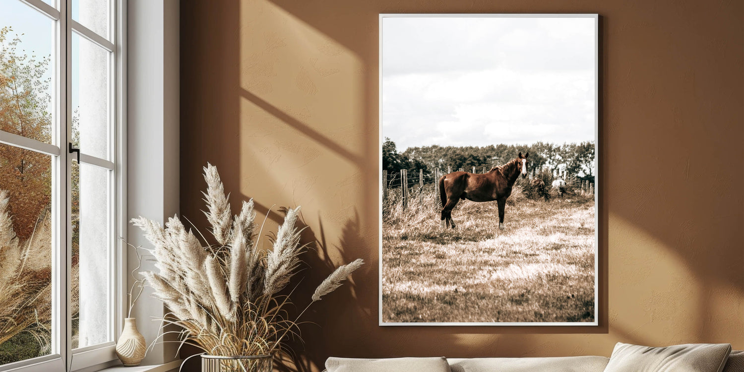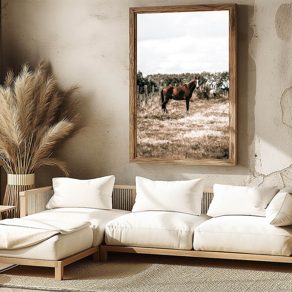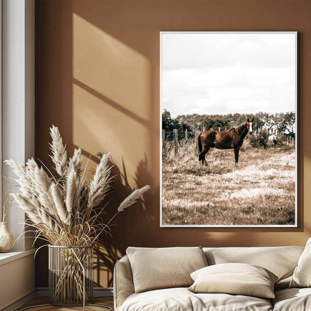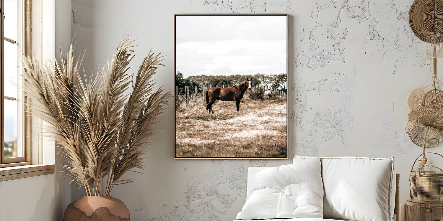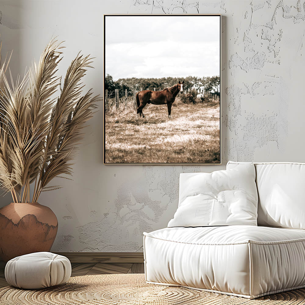 Bring the peaceful beauty of rural life into your home with this serene horse in the field wall art. Featuring a horse standing gracefully in an open field, this piece perfectly captures the quiet charm of the countryside. The soft, earthy tones make it an ideal addition to any farmhouse-style decor, adding a sense of calm and simplicity to your space.