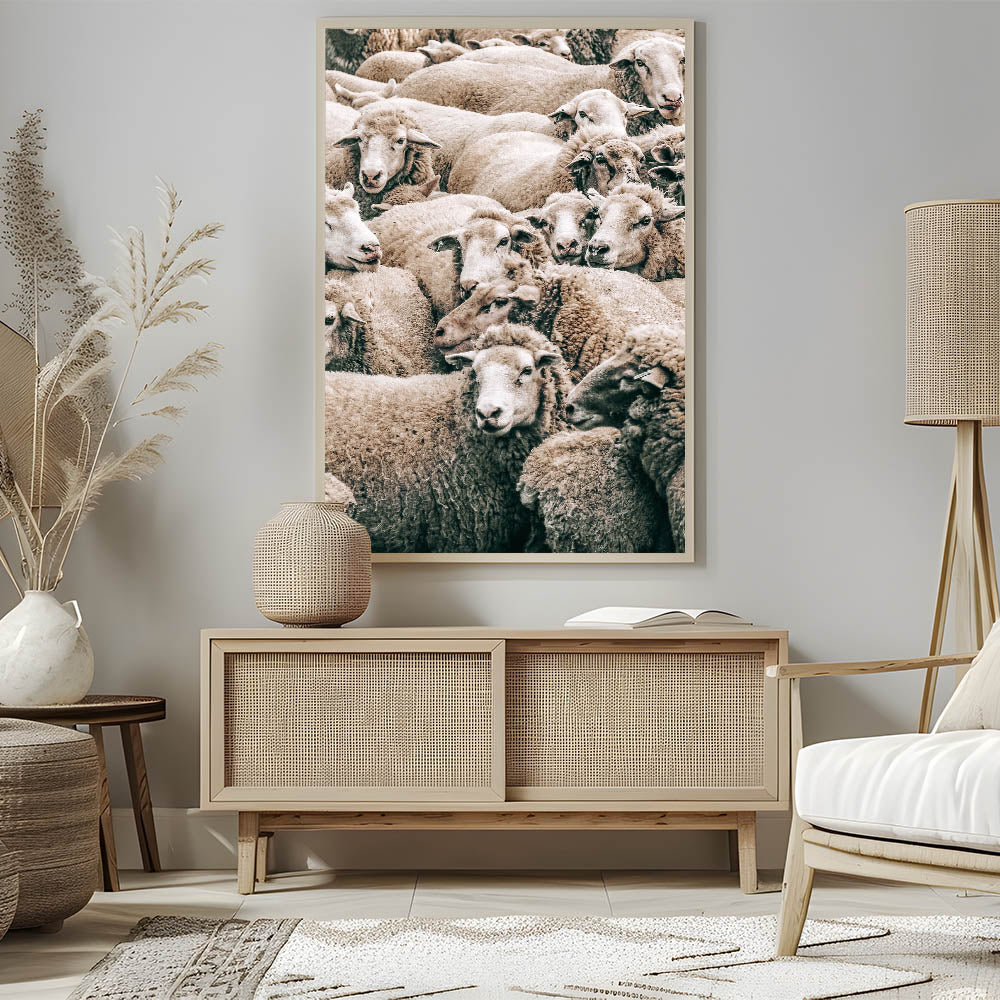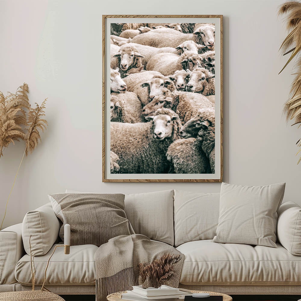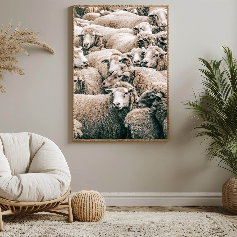 Add a touch of rural charm to your home with this beautiful sheep herd wall art, perfect for enhancing your farmhouse or country-style decor. This artwork captures a peaceful moment in the countryside, showcasing a dense group of sheep with soft, natural textures and earthy tones. The warmth and simplicity of the composition bring a sense of calm and tranquility, making this piece ideal for living rooms, kitchens, or any space seeking rustic charm.