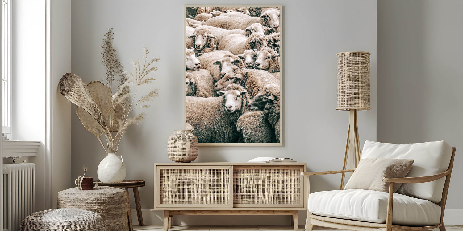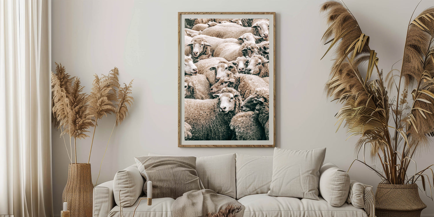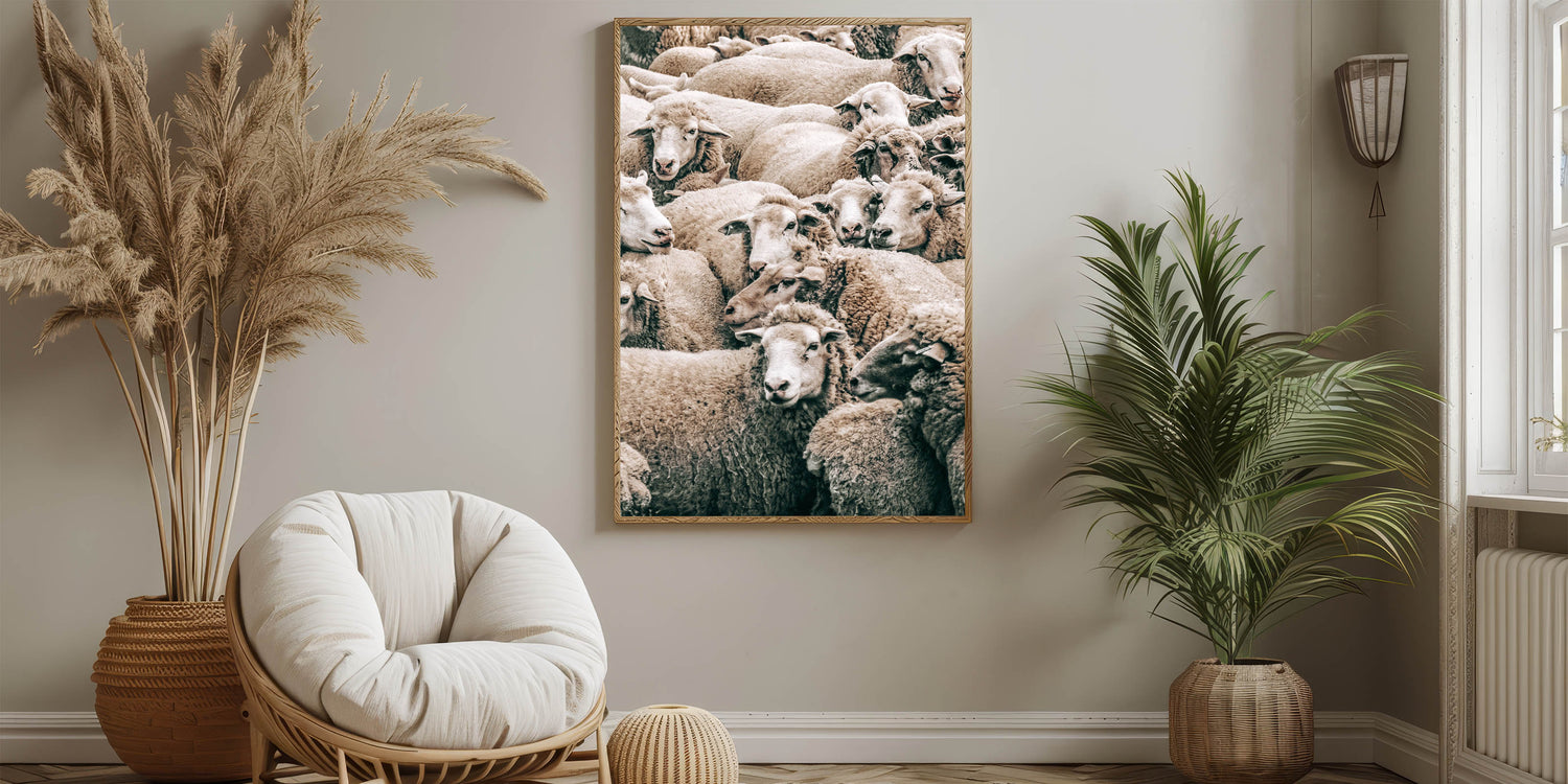 Add a touch of rural charm to your home with this beautiful sheep herd wall art, perfect for enhancing your farmhouse or country-style decor. This artwork captures a peaceful moment in the countryside, showcasing a dense group of sheep with soft, natural textures and earthy tones. The warmth and simplicity of the composition bring a sense of calm and tranquility, making this piece ideal for living rooms, kitchens, or any space seeking rustic charm.