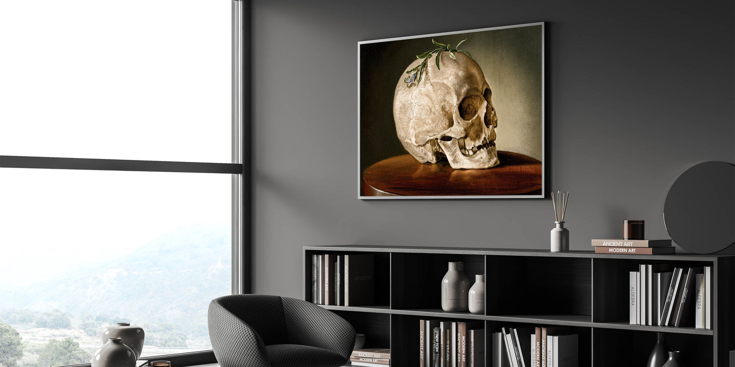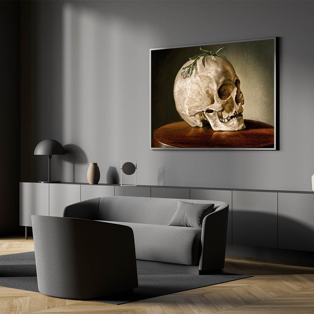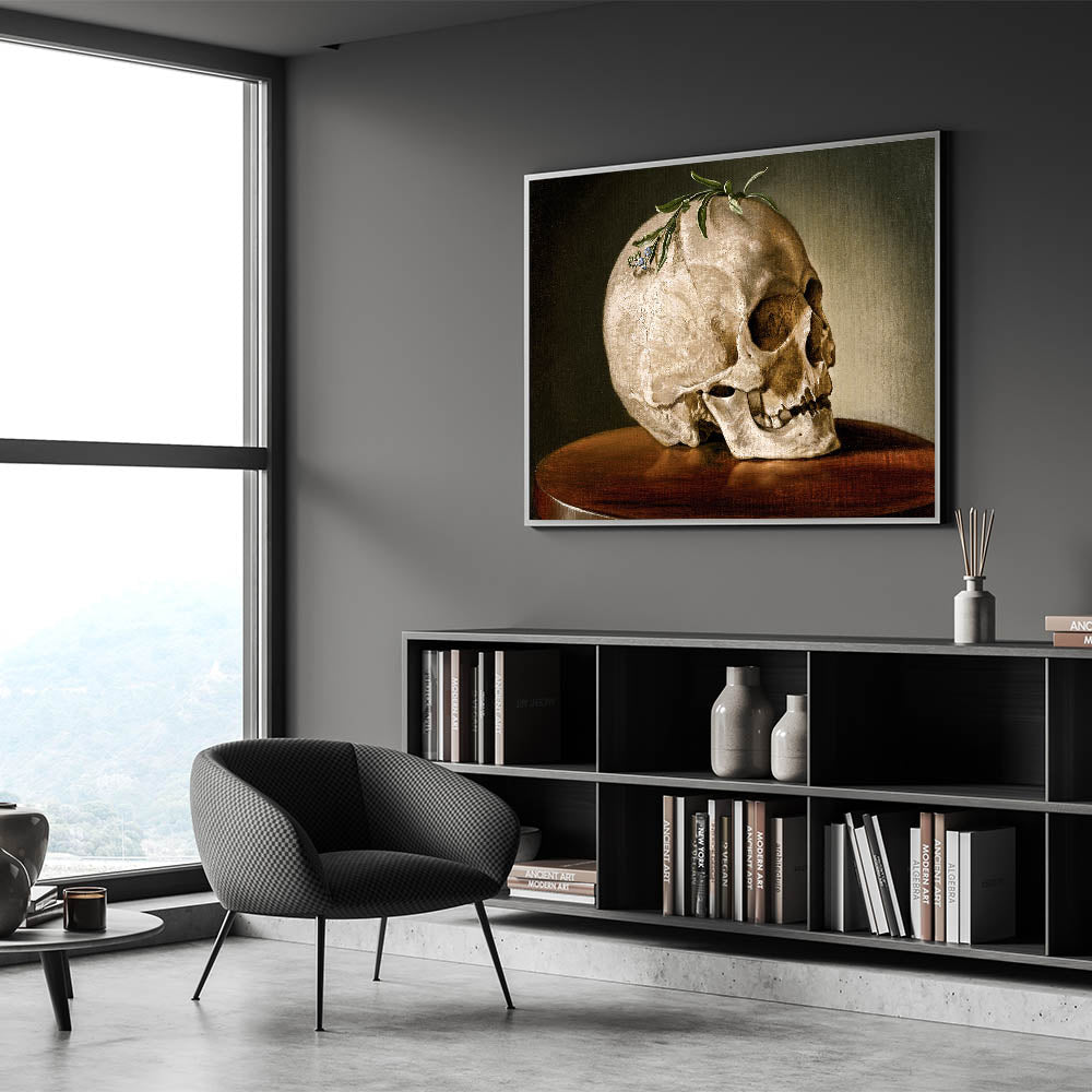 This striking Dark Academia Wall Art features a beautifully detailed skull resting on a wooden table, adorned with a sprig of greenery. Perfect for adding a touch of classic Gothic elegance to your space, this piece captures the contemplative themes of life and death often explored in Gothic Literature Art. The earthy tones and meticulous details make it a perfect focal point for a study, library, or any room where a Moody Aesthetic Decor is desired.