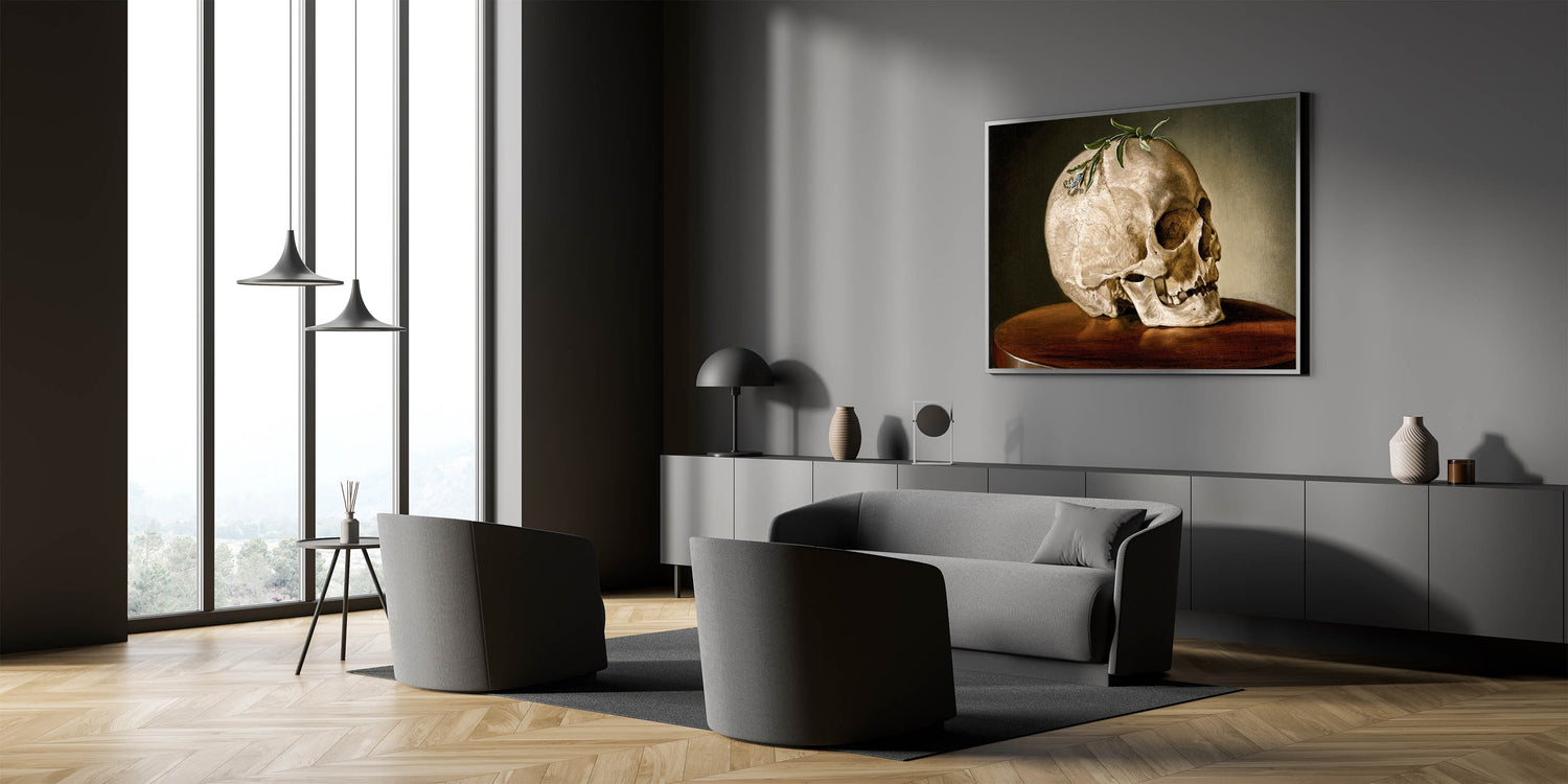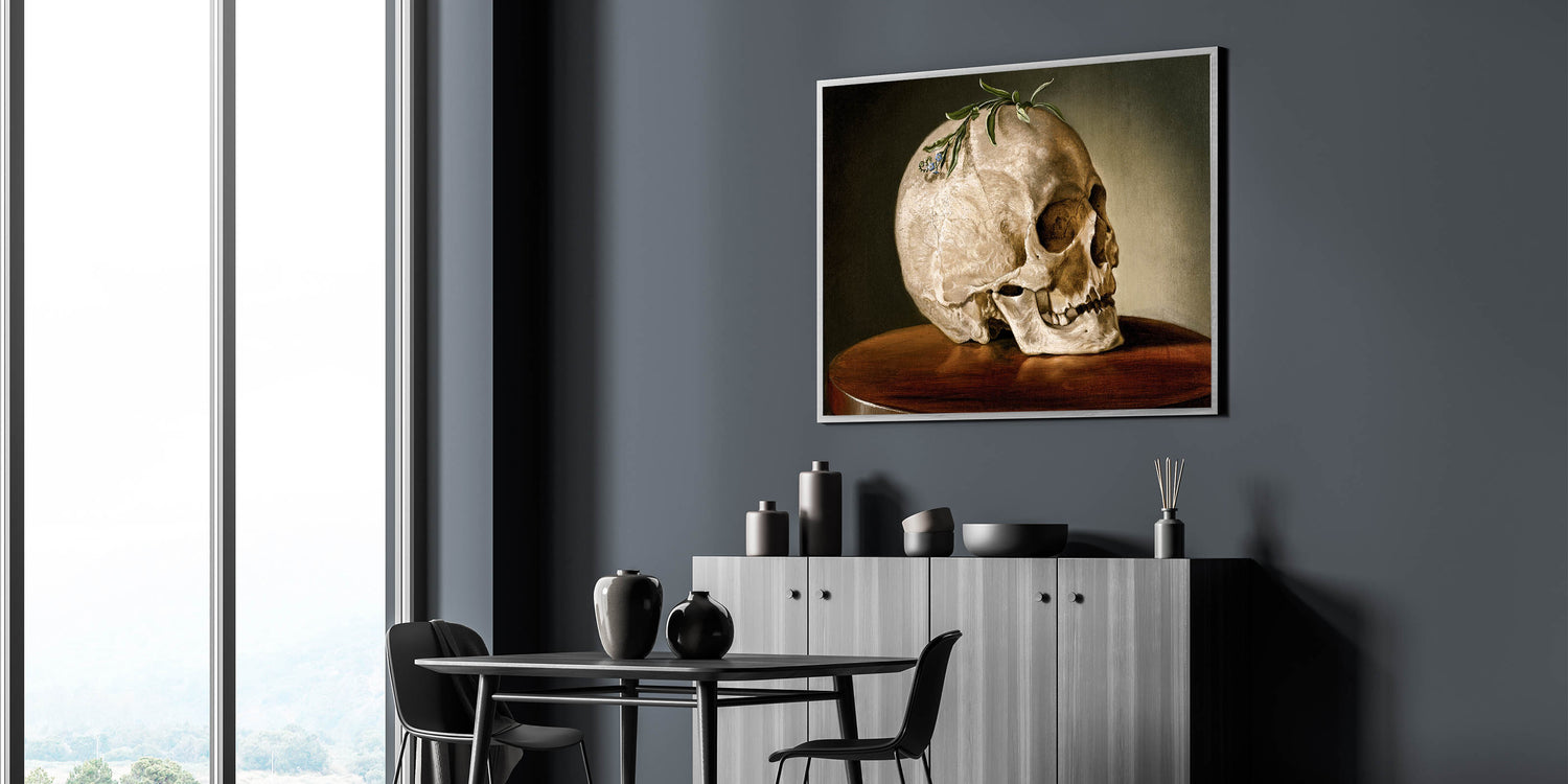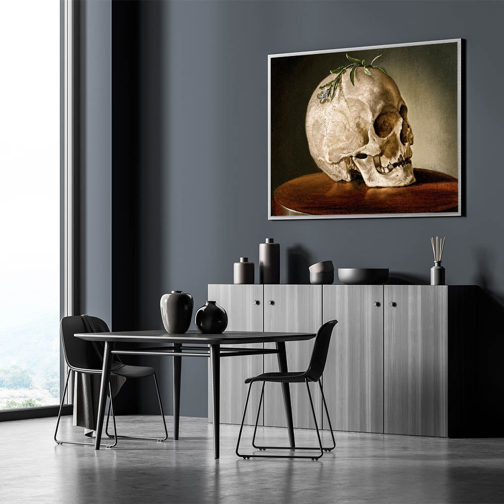 This striking Dark Academia Wall Art features a beautifully detailed skull resting on a wooden table, adorned with a sprig of greenery. Perfect for adding a touch of classic Gothic elegance to your space, this piece captures the contemplative themes of life and death often explored in Gothic Literature Art. The earthy tones and meticulous details make it a perfect focal point for a study, library, or any room where a Moody Aesthetic Decor is desired.