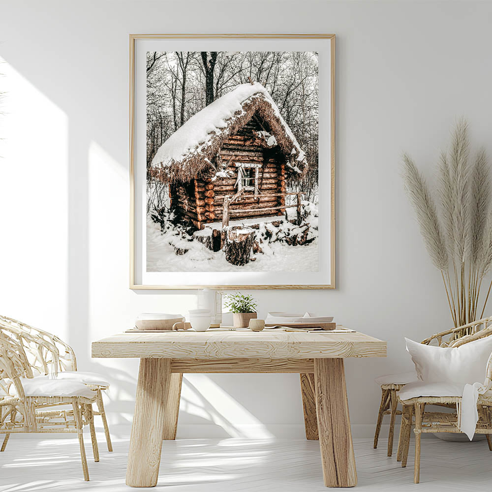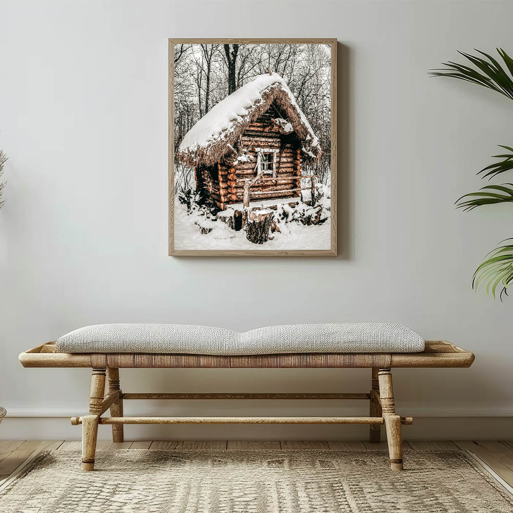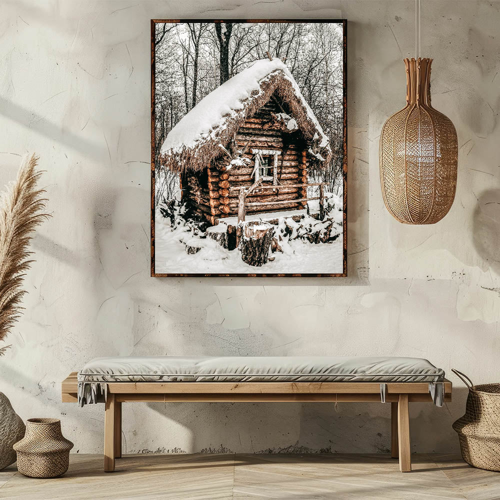 This captivating farmhouse wall art showcases a charming log cabin nestled in the snow, evoking the rustic beauty of winter in the countryside. The snow-covered cabin with its thatched roof and natural wood textures creates a cozy, vintage-inspired aesthetic perfect for any room looking to capture the warmth and simplicity of farmhouse-style decor. The wintry scene brings a peaceful and tranquil vibe, ideal for adding a touch of nature’s serenity to your space.