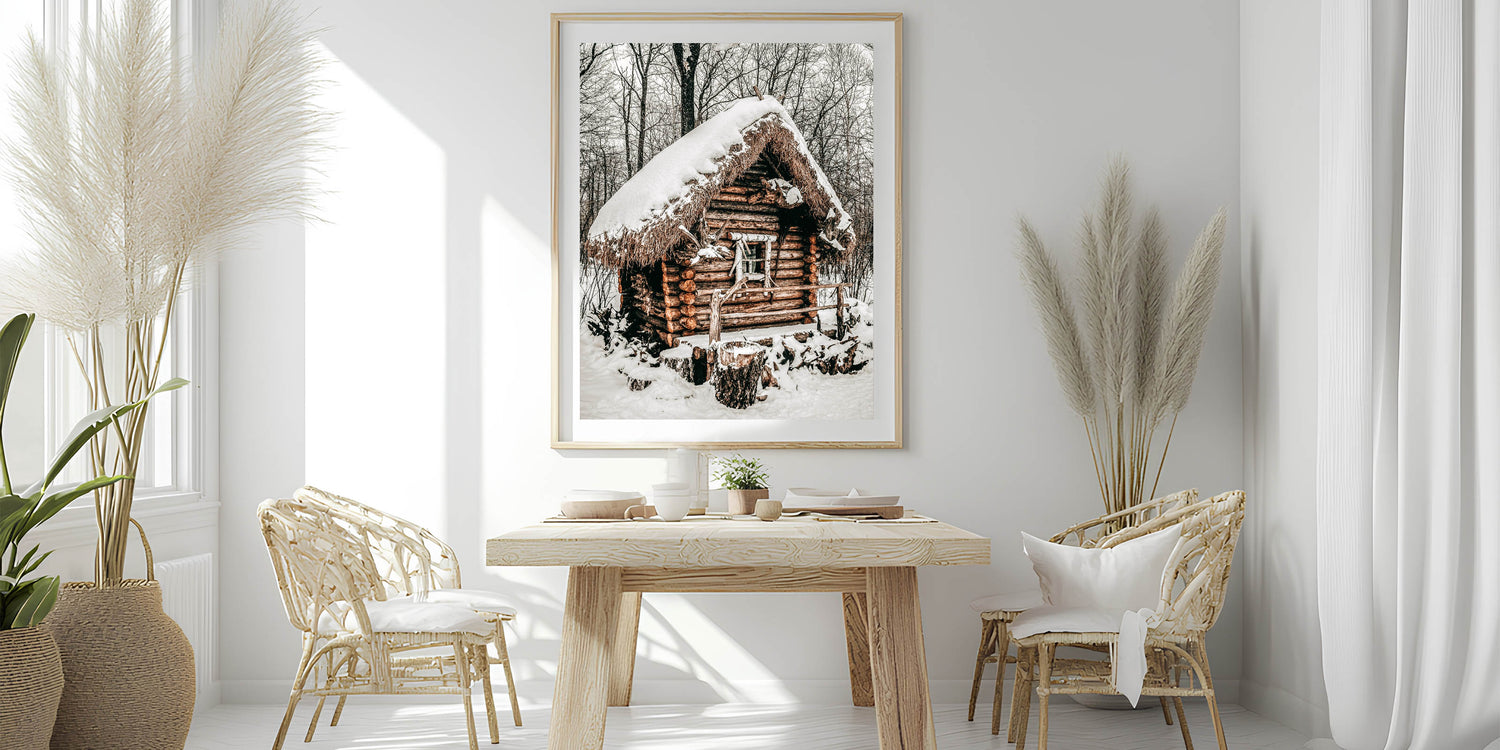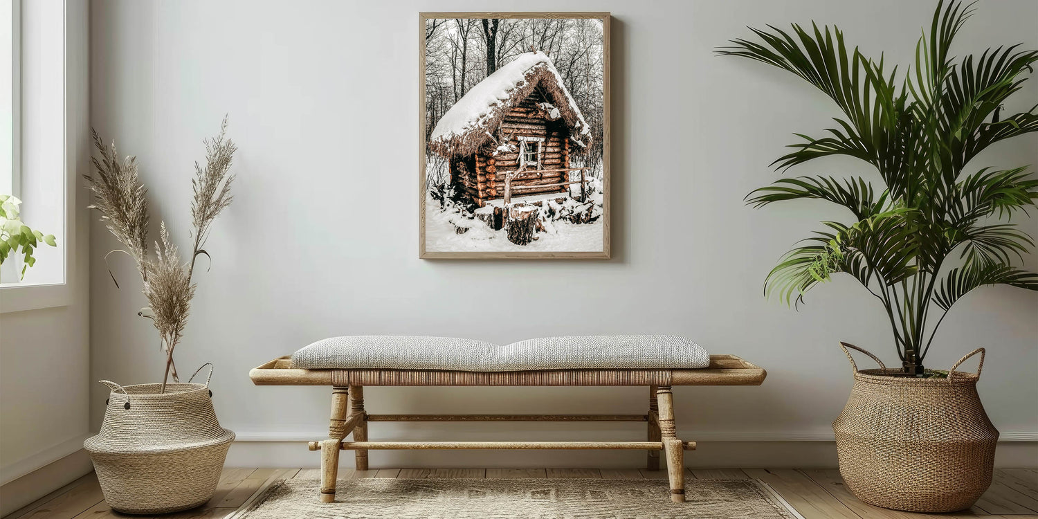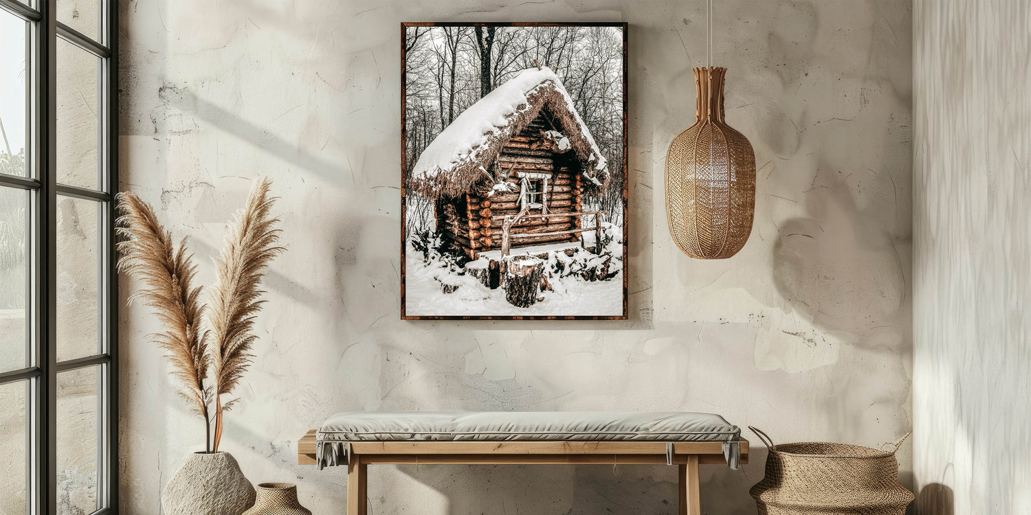 This captivating farmhouse wall art showcases a charming log cabin nestled in the snow, evoking the rustic beauty of winter in the countryside. The snow-covered cabin with its thatched roof and natural wood textures creates a cozy, vintage-inspired aesthetic perfect for any room looking to capture the warmth and simplicity of farmhouse-style decor. The wintry scene brings a peaceful and tranquil vibe, ideal for adding a touch of nature’s serenity to your space.