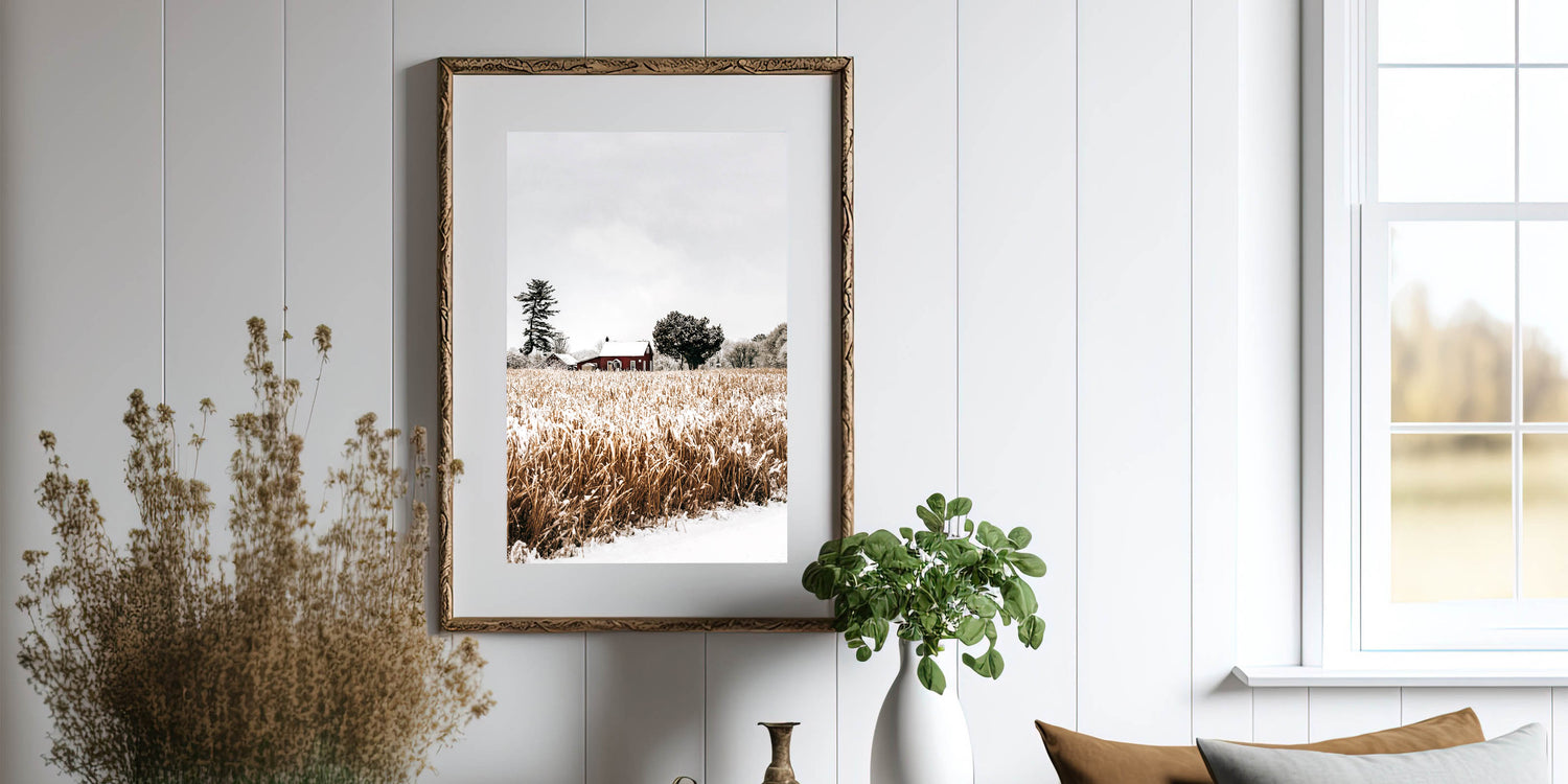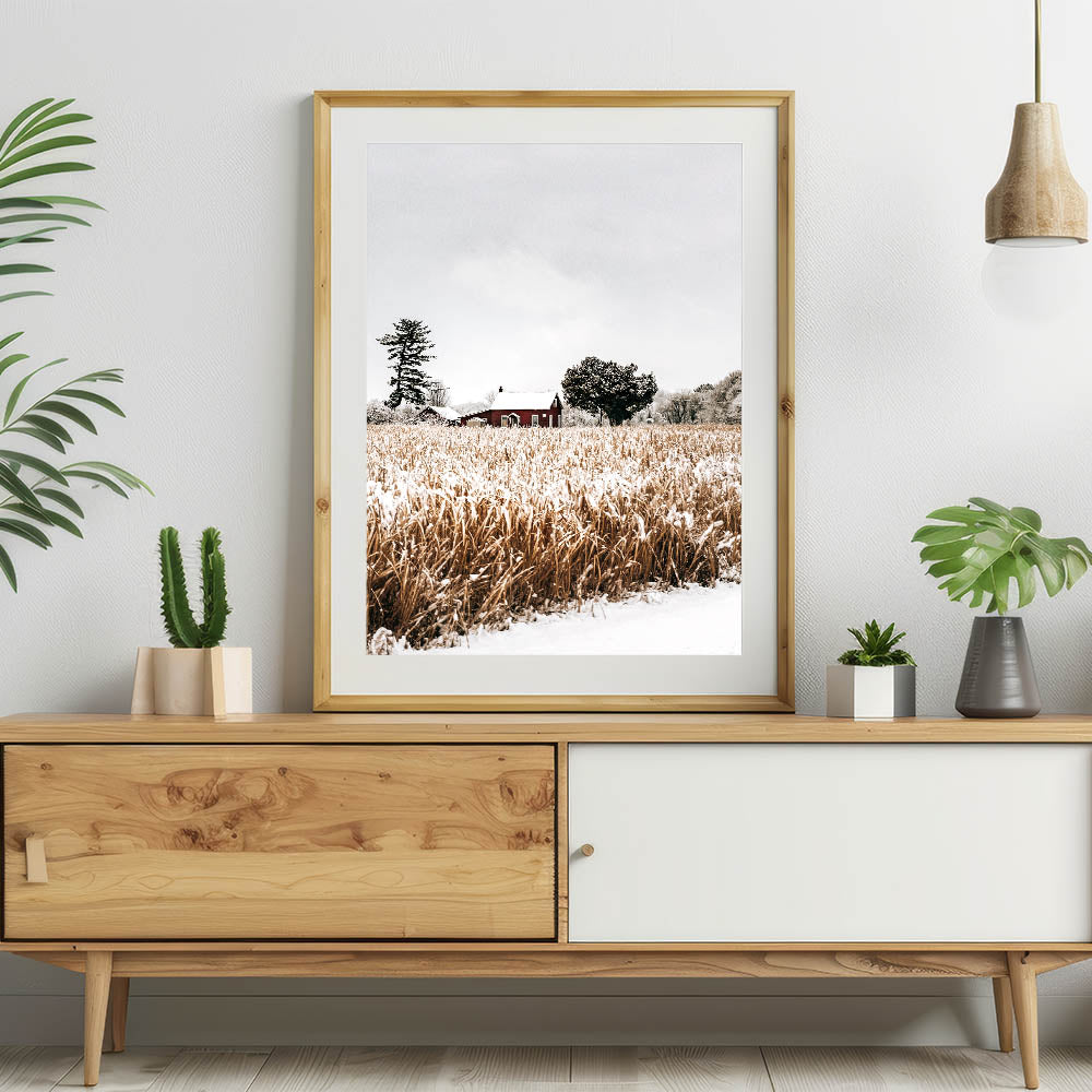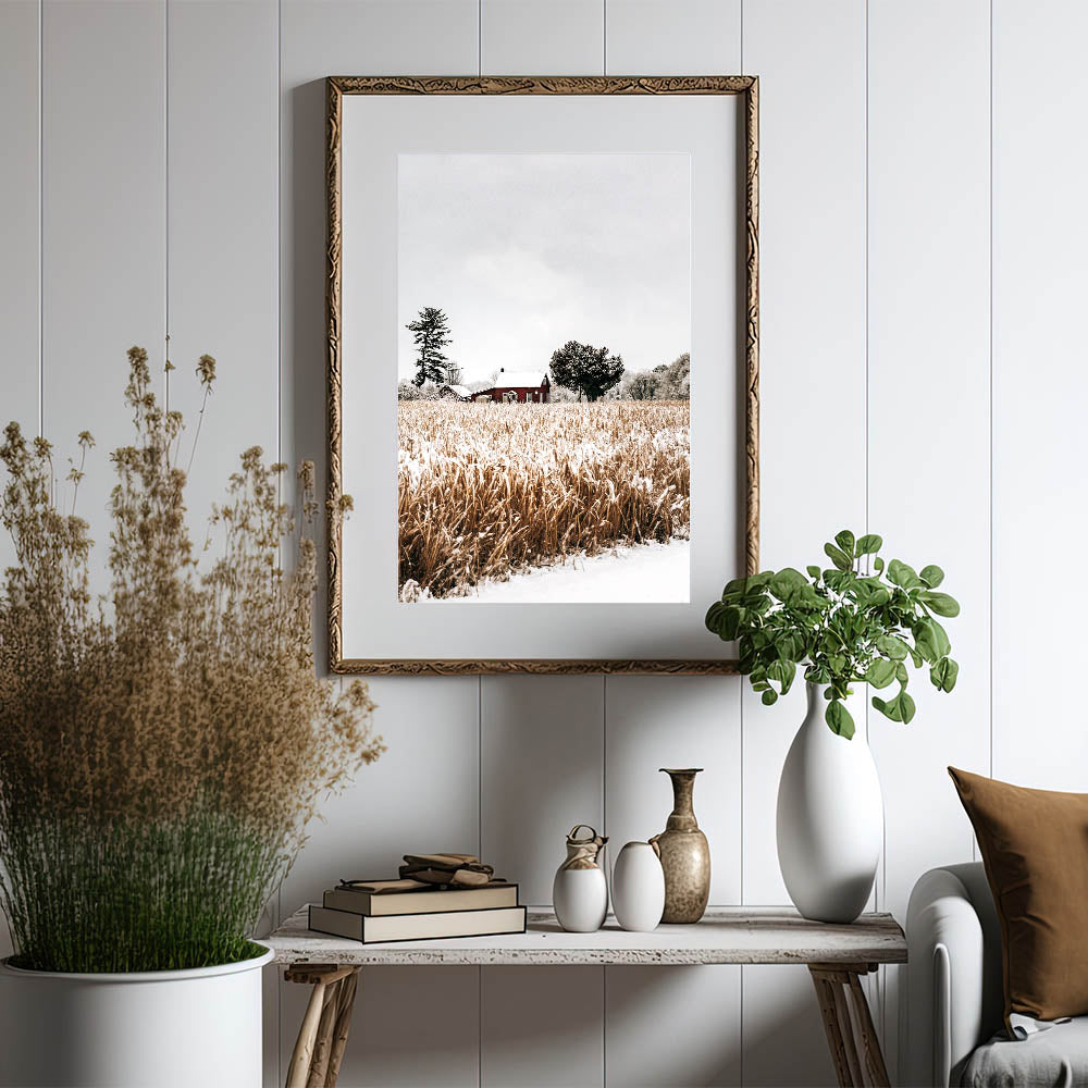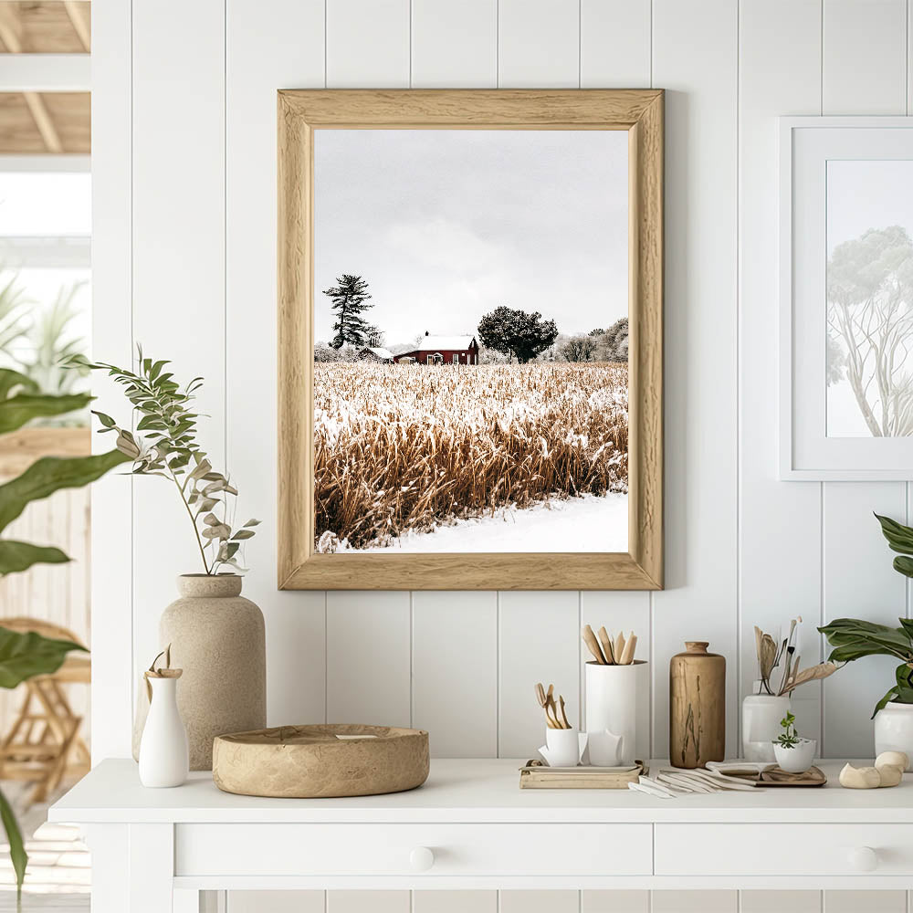 Add a serene touch to your home with this beautiful snowy farmhouse in winter wall art. This piece captures the peaceful beauty of a rustic farmhouse blanketed in snow, with golden fields peeking through the winter frost. The contrast of the red farmhouse against the white landscape brings a warm, nostalgic feel, making it a perfect addition to any farmhouse-style decor.