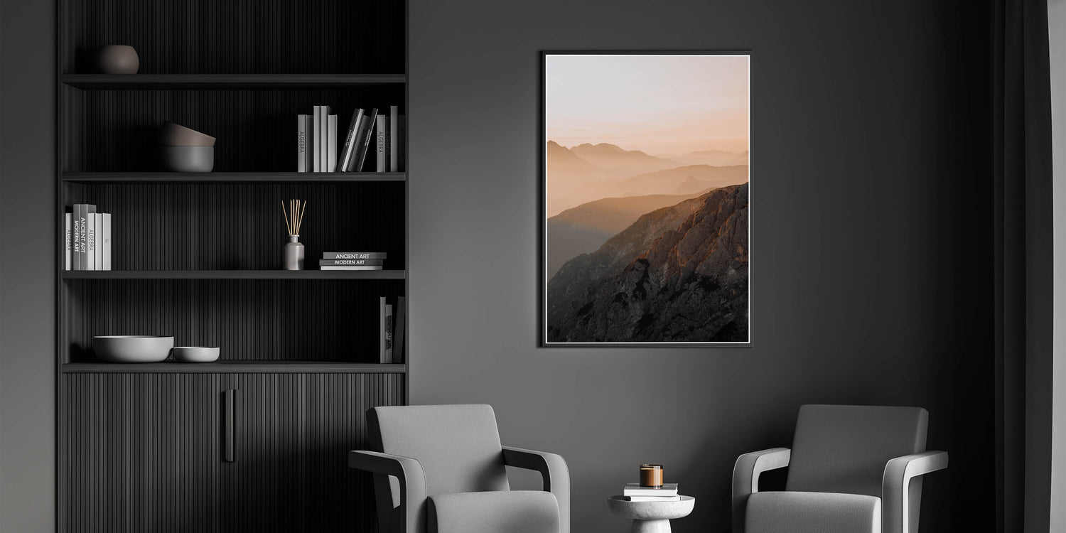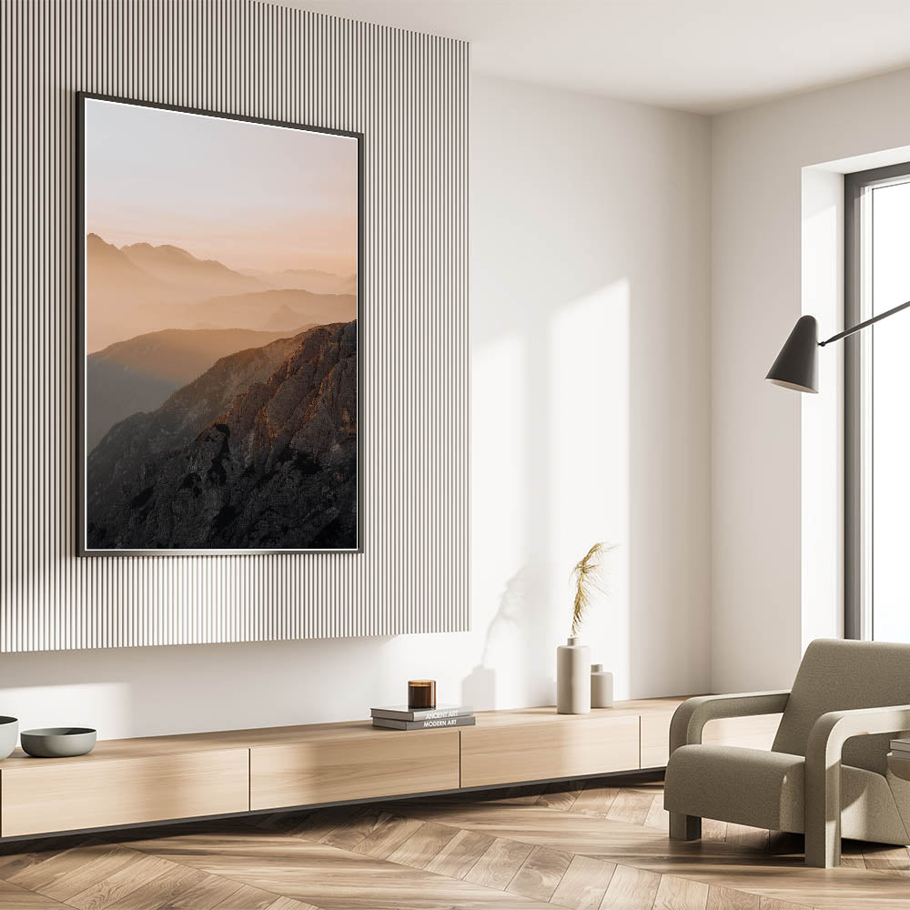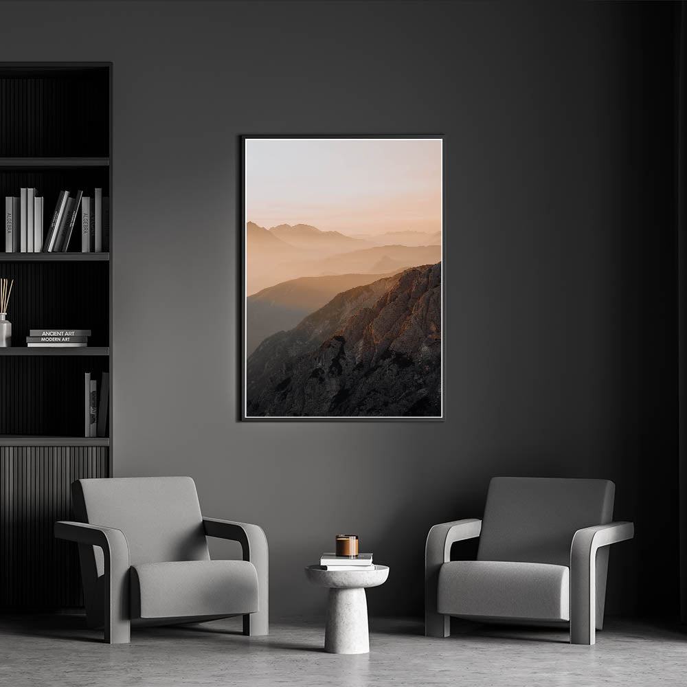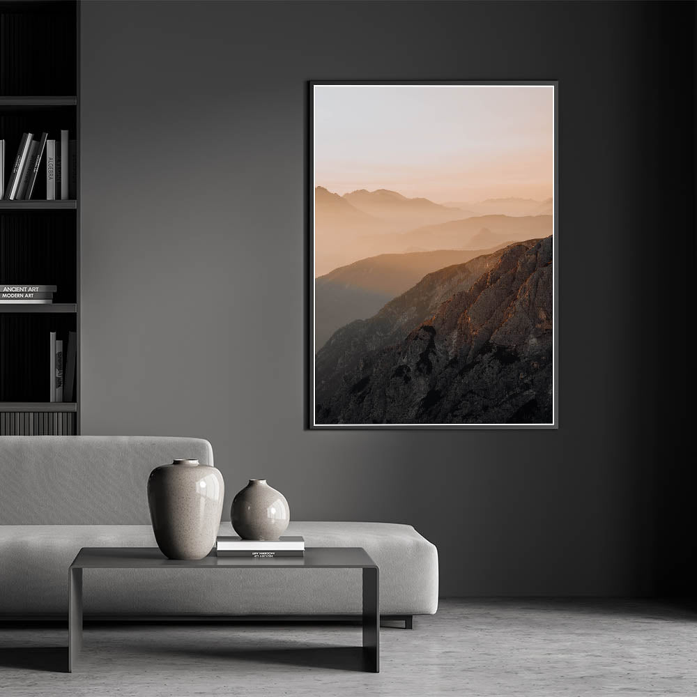 Sunset Mountain Majesty" captures the breathtaking layers of mountain ranges bathed in the warm, soft hues of a setting sun. This rustic wall art piece draws the viewer into a world of serene beauty and tranquil landscapes, ideal for those who appreciate the grandeur of nature and wish to bring a piece of it into their home.