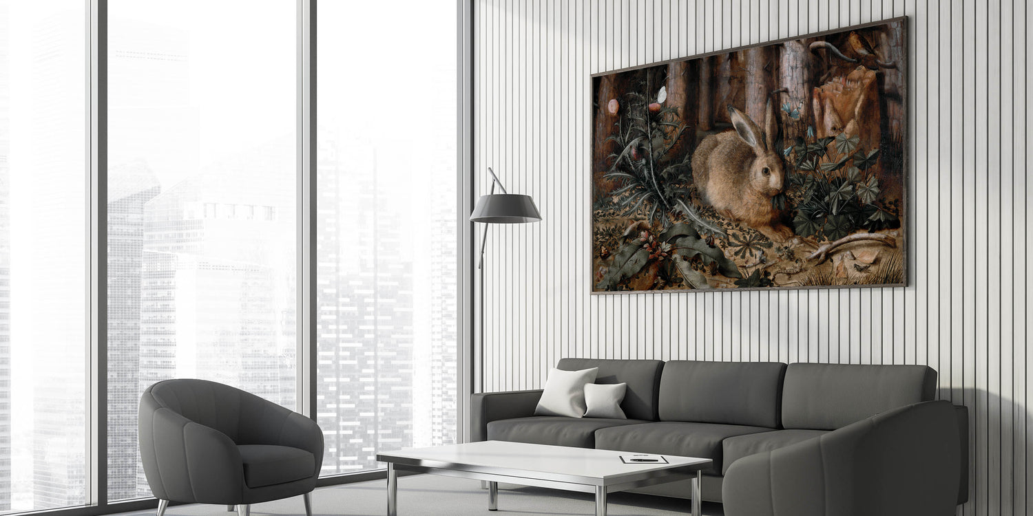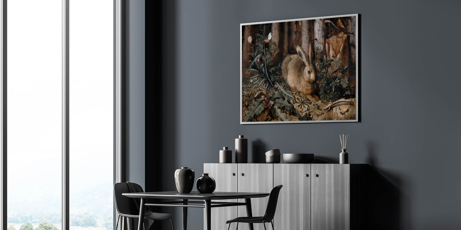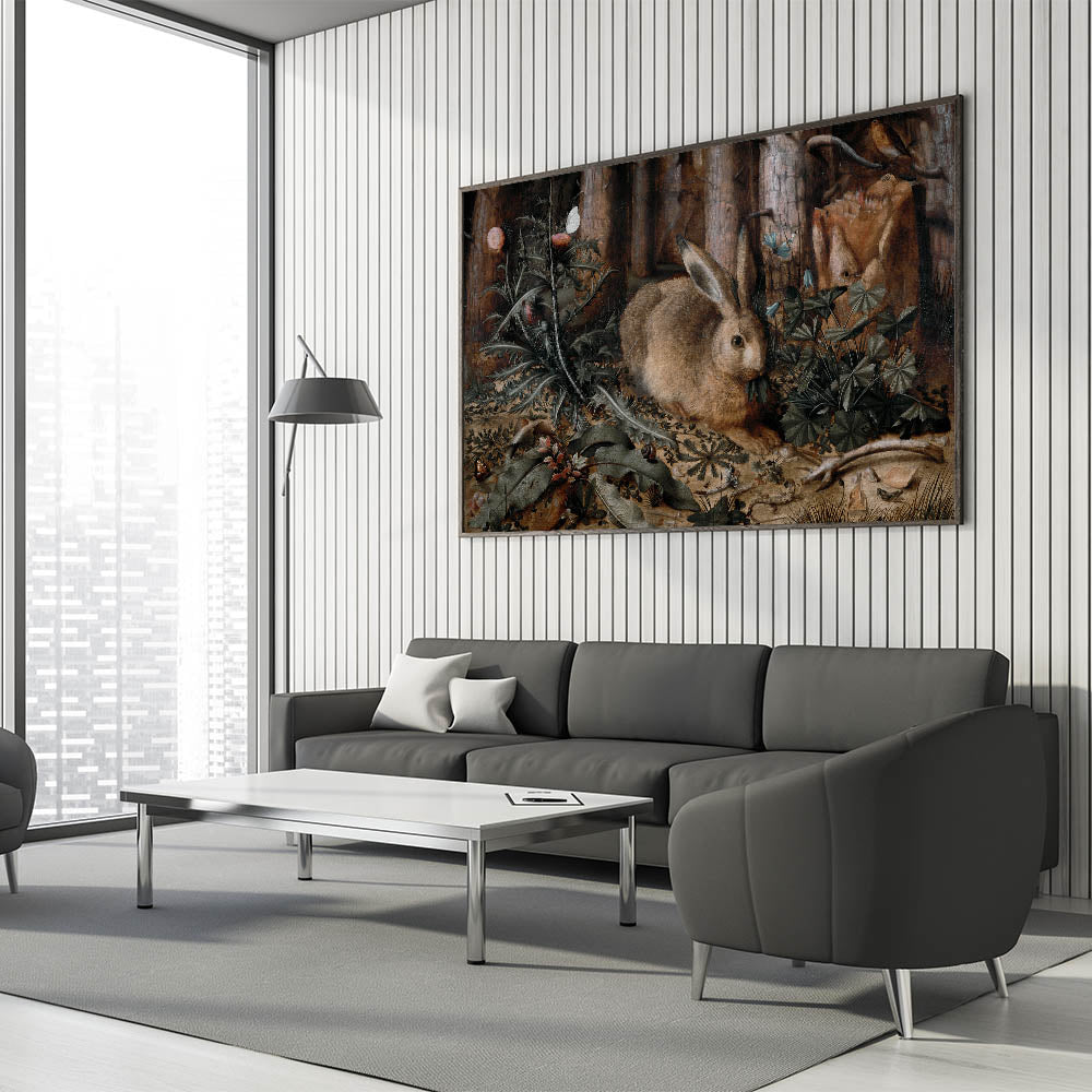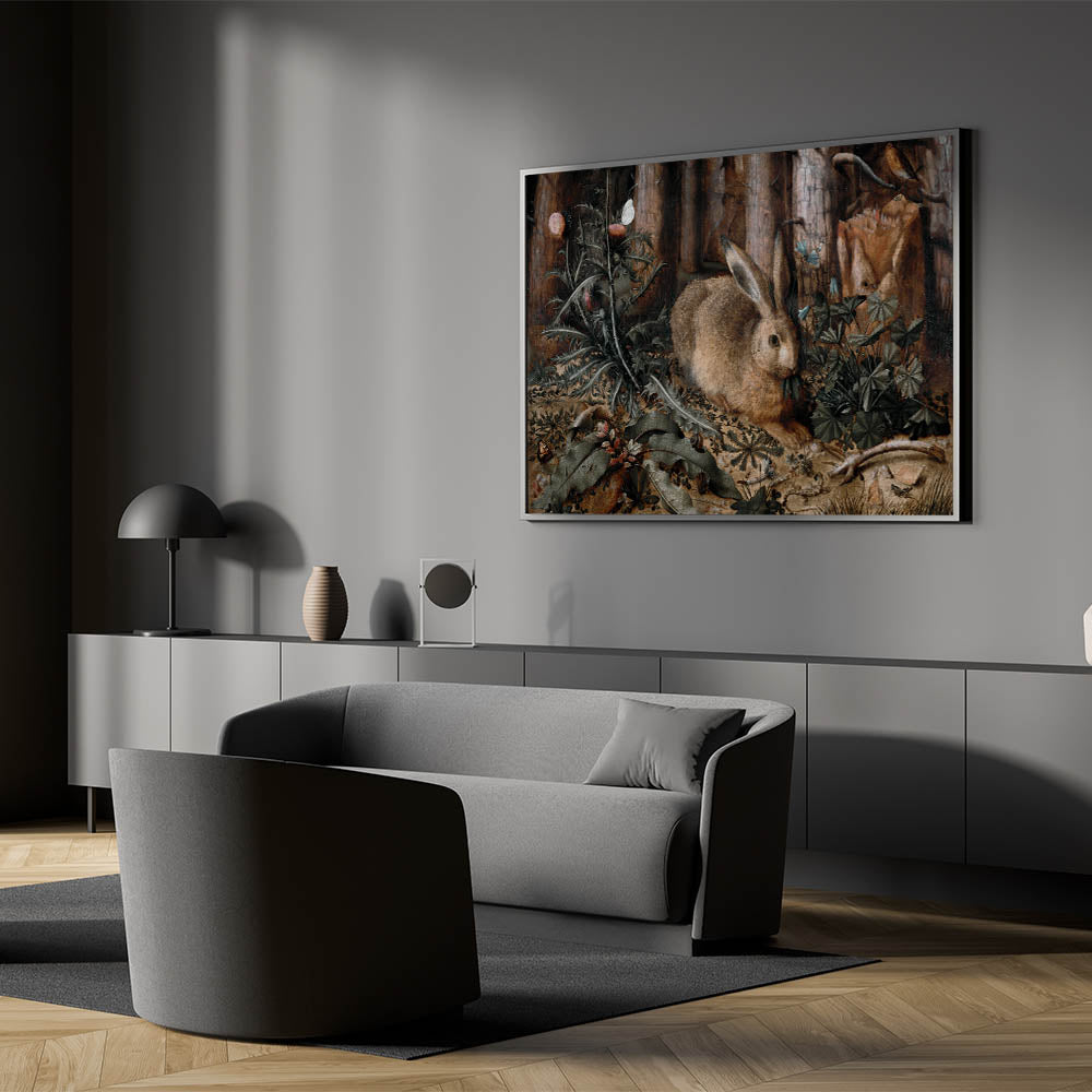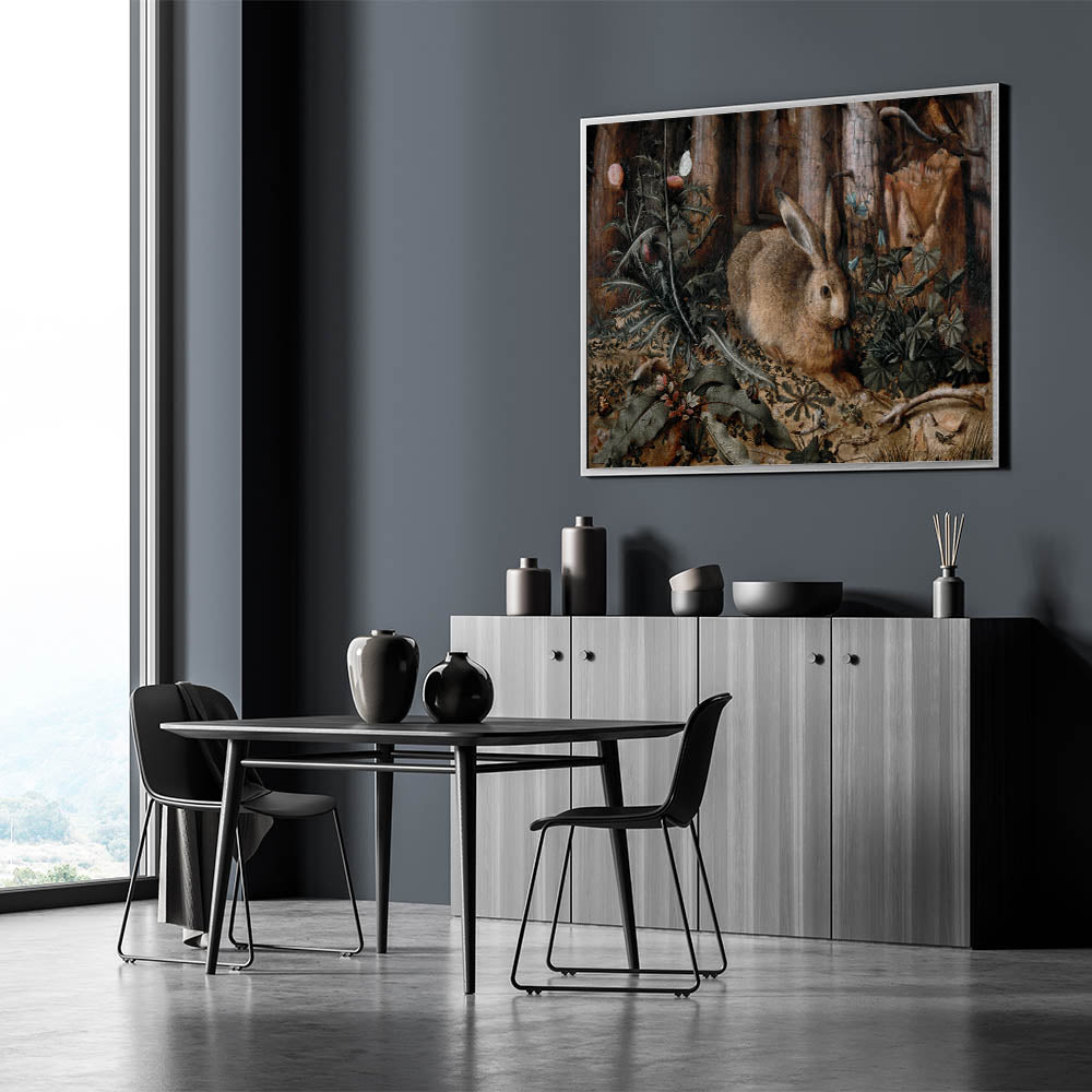 Embrace the mysterious allure of this Dark Moody wall art featuring a rabbit in a shadowy forest setting. The intricate details of the flora and fauna create a captivating scene, blending realism with an atmospheric mood that transports you into the heart of nature. Perfect for those seeking moody wall art for living rooms or bedrooms, this artwork evokes a timeless and dramatic ambiance.