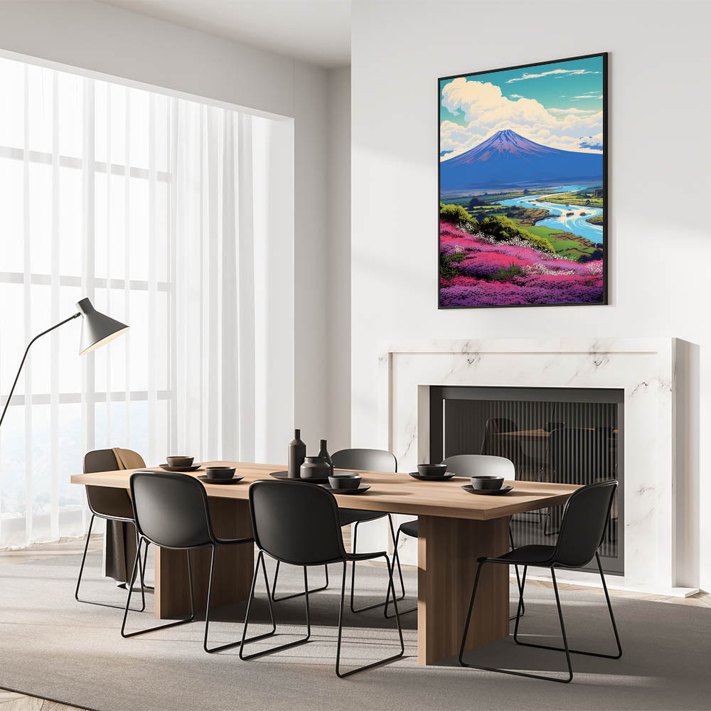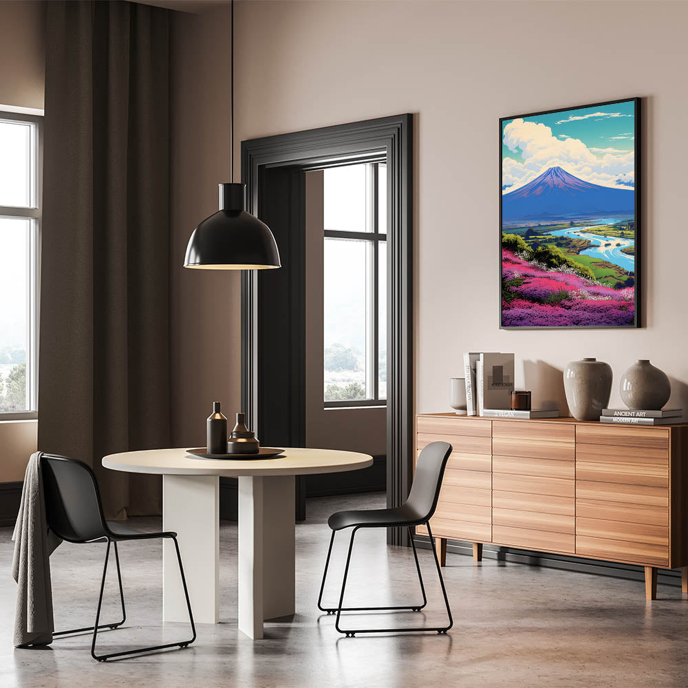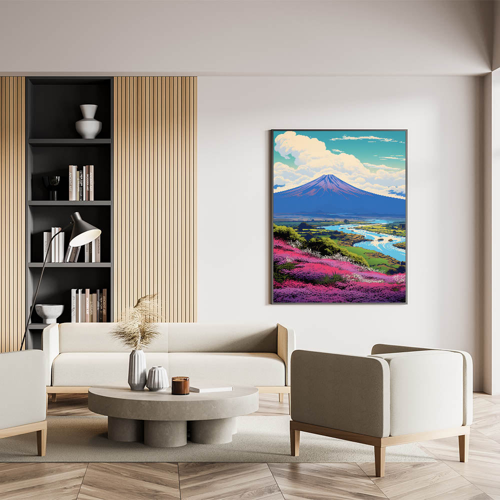 Experience the dynamic beauty of nature with our Vibrant Electric Mountain River Art. This artwork features an electric-inspired landscape of a majestic mountain, flowing river, and blooming fields in vivid colors like blue, green, and magenta. Ideal for those wanting to infuse their space with modern electric decor, this piece captures the energy and movement of the natural world in an electrifying manner.